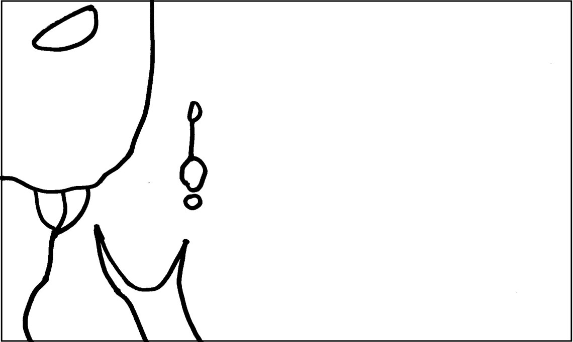 다음에 이 빵 덩어리를 사정 없이 찍어 들어가고 있는 삼지창을 그린다. 그리고 이 삼지창 밑으로 살며시 다가가고 있는 돼지 족발을 그린다. 이 때 중요한 것은 왼쪽 발톱이 오른쪽 발톱보다 길어야 한다는 것이다. 그 다음에 이 돼지 족발 위로 떨어지고 있는 빵 부스러기를 그린다. 그런데 이 빵 부스러기는 오른 쪽 발톱 위로 떨어져야 한다.