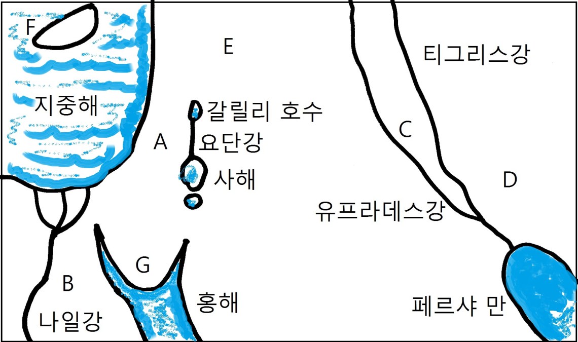 여기에 9개의 수역과 7개의 지역(A 갈릴리, B 애굽, C 바벨론, D 페르시아, E 앗수르, F 구부로, G 시내반도)을 표시하면 아래와 같이 된다.