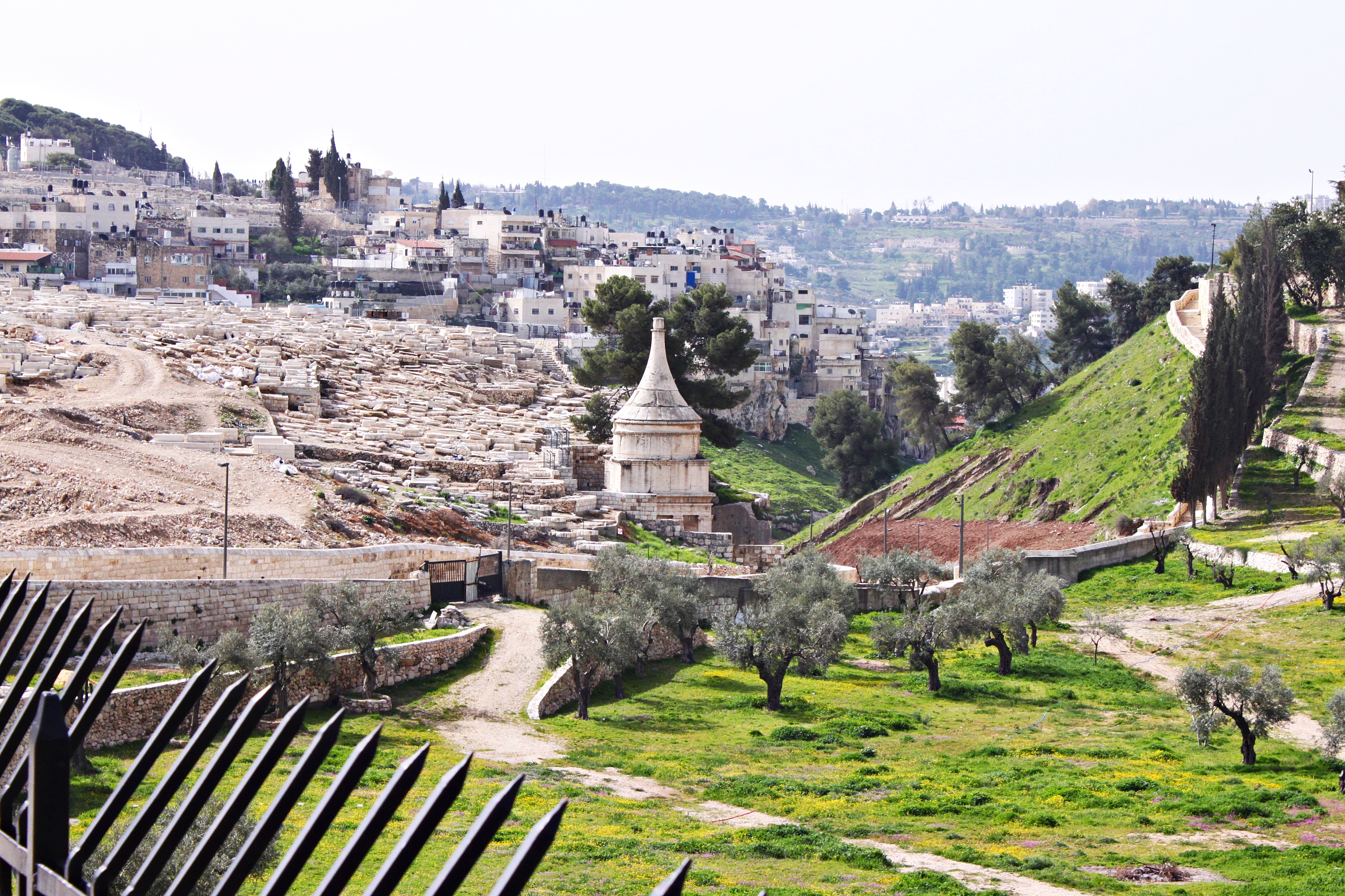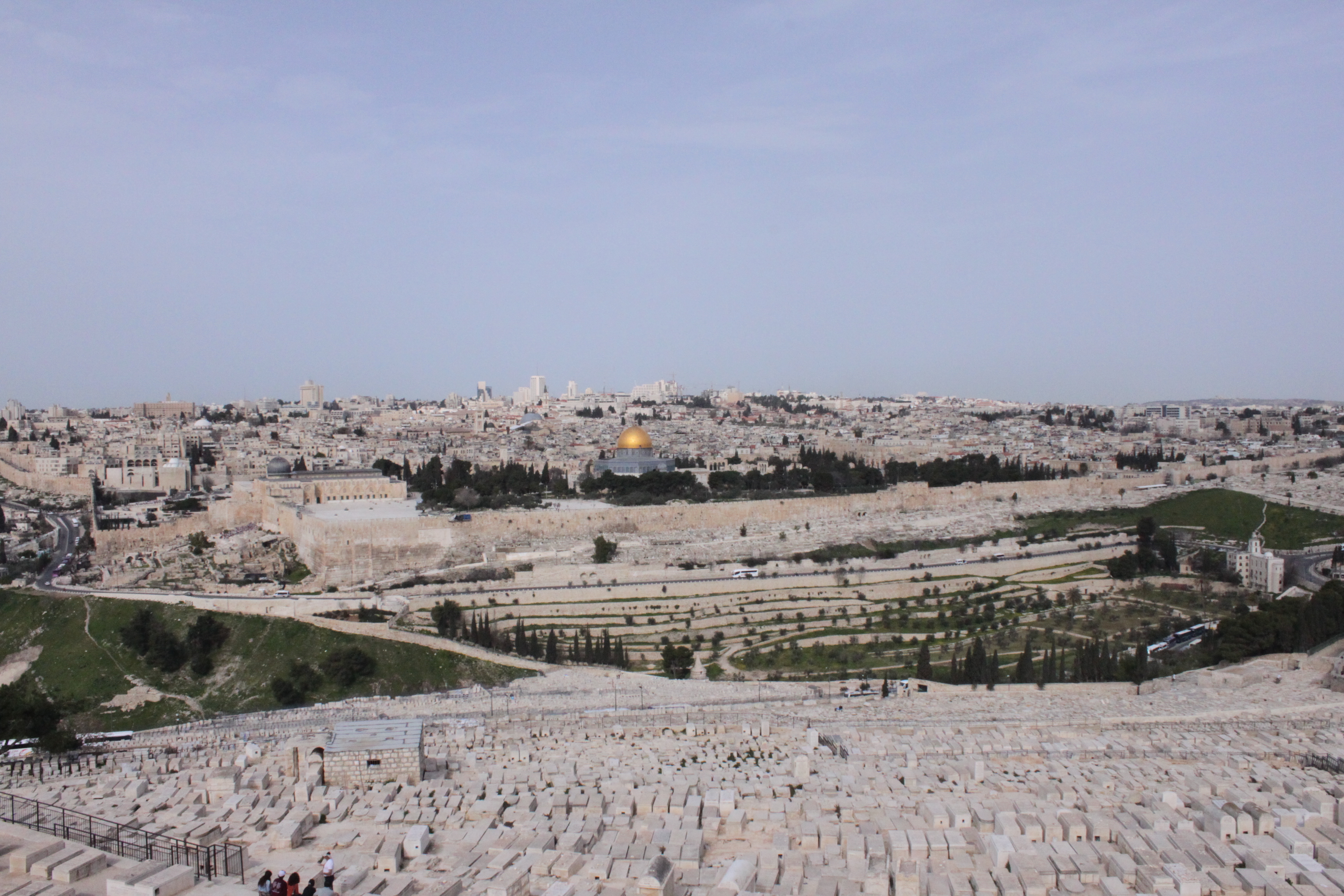 감람 산에서 예루살렘 성 쪽으로 있는 묘지들, 멀리 예루살렘 성 안에 있는 황금 돔(Dome of the Rock)이 보인다