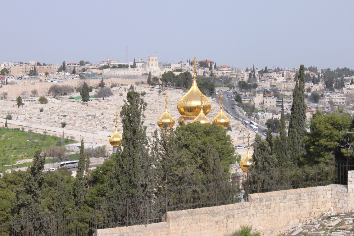 눈물교회에서 내려다 본 막달라 마리아 기념교회 – 멀리 언덕 위로 히브리 대학이 보인다