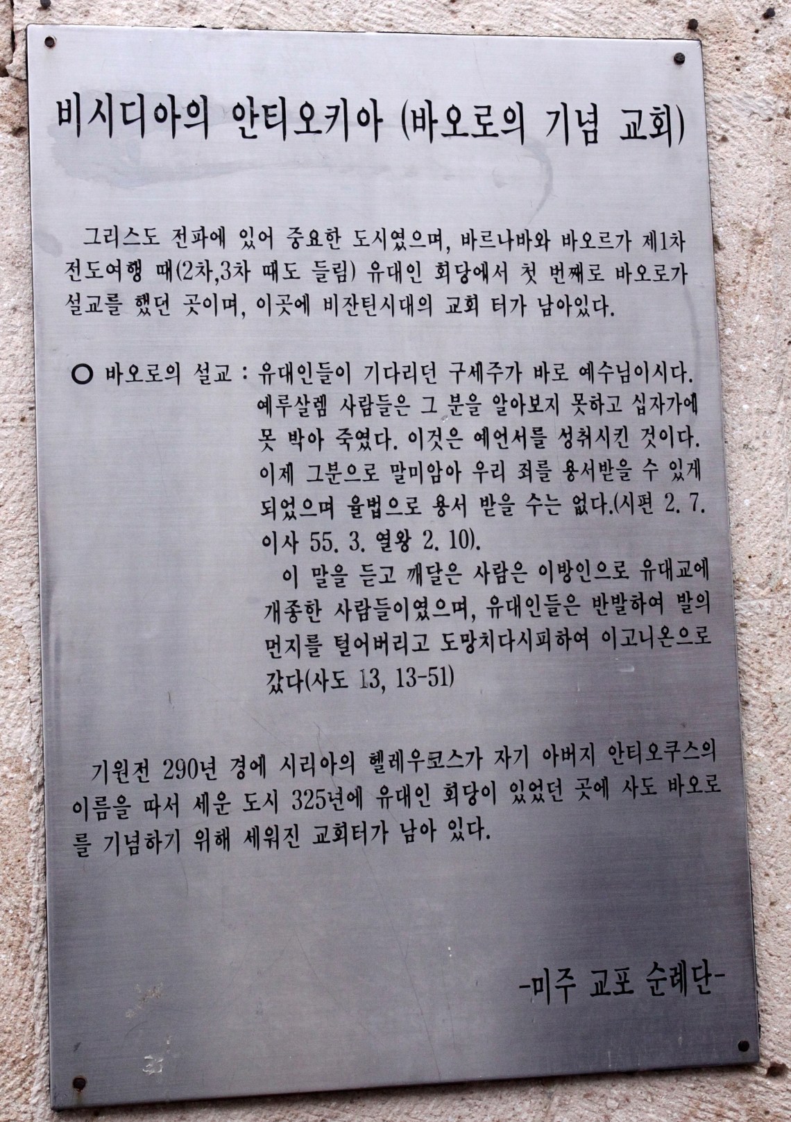 바울 기념교회 앞에 있는 한국어로 된 간판 – 인명 및 지명의 표기로 미루어 천주교 순례단이었던 것 같다