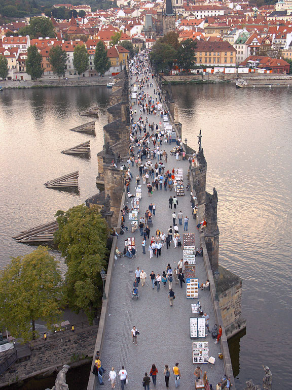 외국 지명이나 인명을 대할 때마다 느끼는 문제이지만 한국은 원어에 충실하게 발음하고 미국은 영어로 번역한 후 영어로 발음하는 데서 파생되는 차이이다. 이 경우도 체코 원어는 Karlùv로 발음하면 ‘까를’과 비슷하다는데(나는 체코 말을 모르니 …) 영어로는 Charles Bridge이니 참 난감하다. 여하간 원어에 비슷한 까를교로 표기하기로 한다. 까를교는 성 비트 대성당에 대한 글에서 언급했던 까를4세에 의해서 1357년에 건설이 시작되어 약 50여년에 걸쳐 지어진 돌다리이다. 그래서 일명 돌다리(Stone Bridge)로도 알려져 있는데 당시 블타바 강을 건널 수 있는 유일한 다리로 프라하의 교통에 아주 중요한 역할을 했다.
