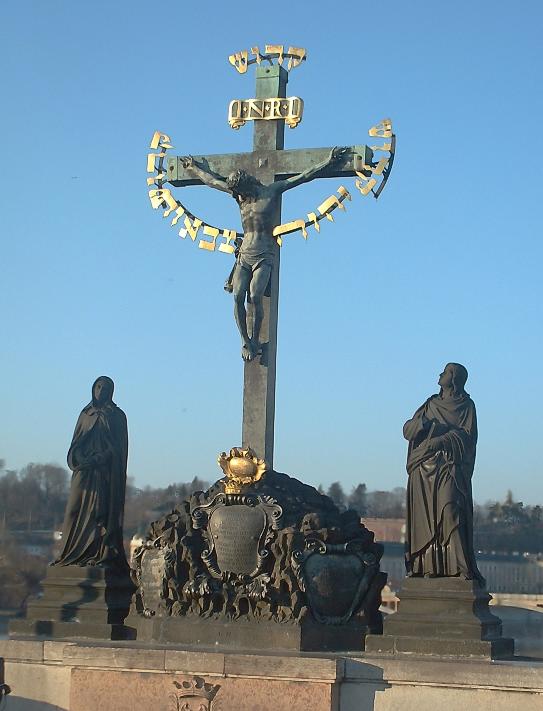 John of Nepomuk의 동상 – 까를교에 있는 동상 중에 가장 오래 된 것으로 1393년에 이 다리에서 블타바 강으로 던져져 순교한 요한을 기념하여 1683년에 세워졌다. 당시 로마니아와 보헤미아를 다스리던 Wenceslaus 왕과 로마교황이 프라하 수도원장 임명문제로 반목할 때 요한이 교황의 뜻을 따랐기 때문에 왕으로부터 사형선고를 받았다 한다. 동상 받침대의 오른쪽 부분을 만지면 행운이 온다는 전설로 많은 사람들이 어루만져서 그 부분이 유난히 반짝인다.