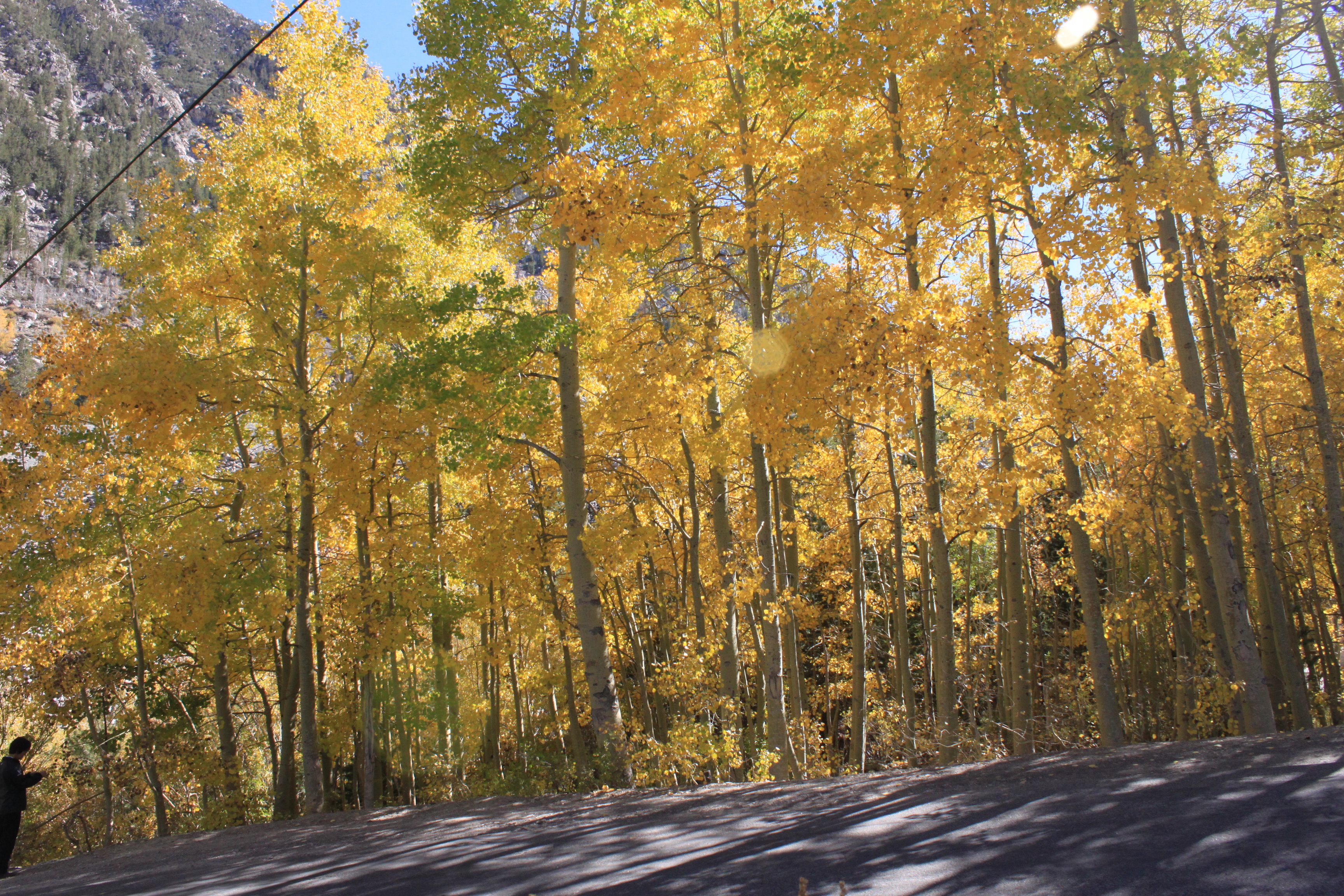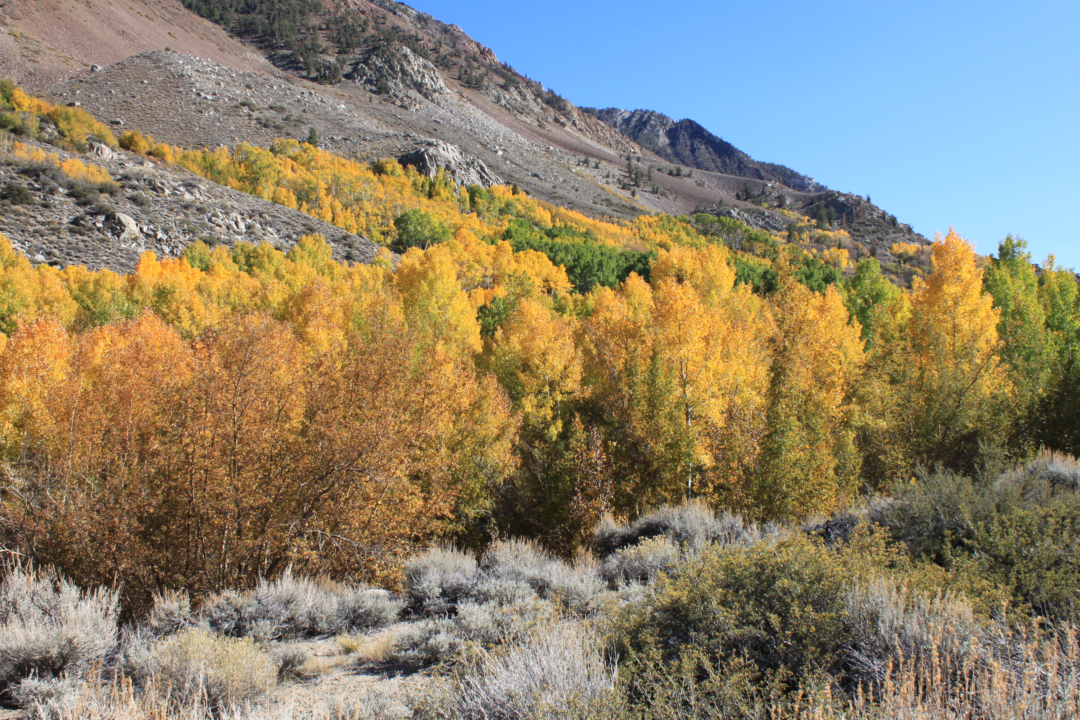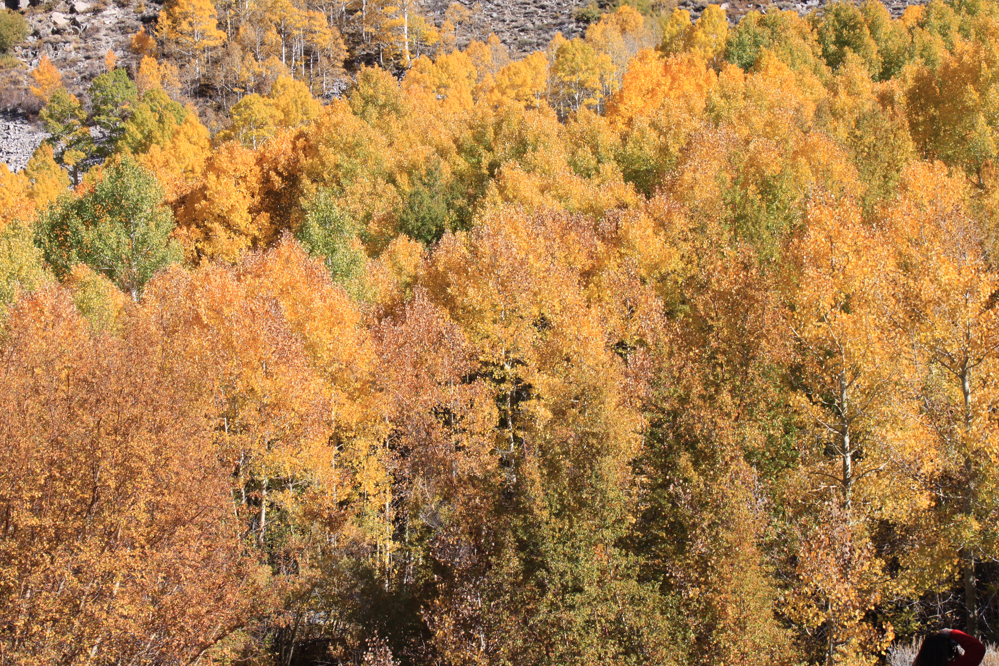 Eastern Sierra는 Aspen 단풍으로도 유명하다. Aspen나무는 한국에도 많이 있는 포플라 나무의 일종으로 잎사귀가 한국의 포플라보다 더 동그스름한 편이다. 계곡에 흐르는 물가에서 자라며 가을에 황금빛으로 단풍이 드는데 그 절정에 때를 잘 맞추면, 설악산의 붉은 단풍과는 비교할 수 없지만, 남 가주에서는 느낄 수 없는 가을을 물씬 맛볼 수 있다.