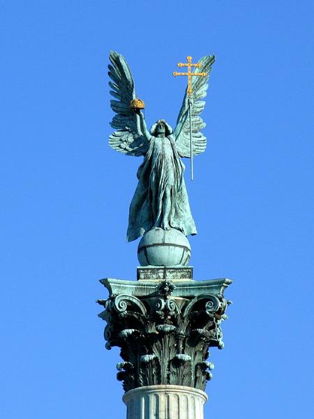 광장의 구심점은 북서쪽에 있는 Millennium Monument 라고 알려져 있는 기념비이다. 중앙의 기둥 위에는 천사장 가브리엘의 동상이 있는데 오른 손에는 스테판 왕의 왕관과 왼손에는 교황이 스테판 왕에게 수여한 ‘사도의 십자가’(Apostolic Cross, double barred)를 들고 있는 모습이다. 좌우의 기념비는 각각 7명의 헝가리 역사에 큰 공을 세운 왕 및 귀족들의 동상으로 채워져 있다.