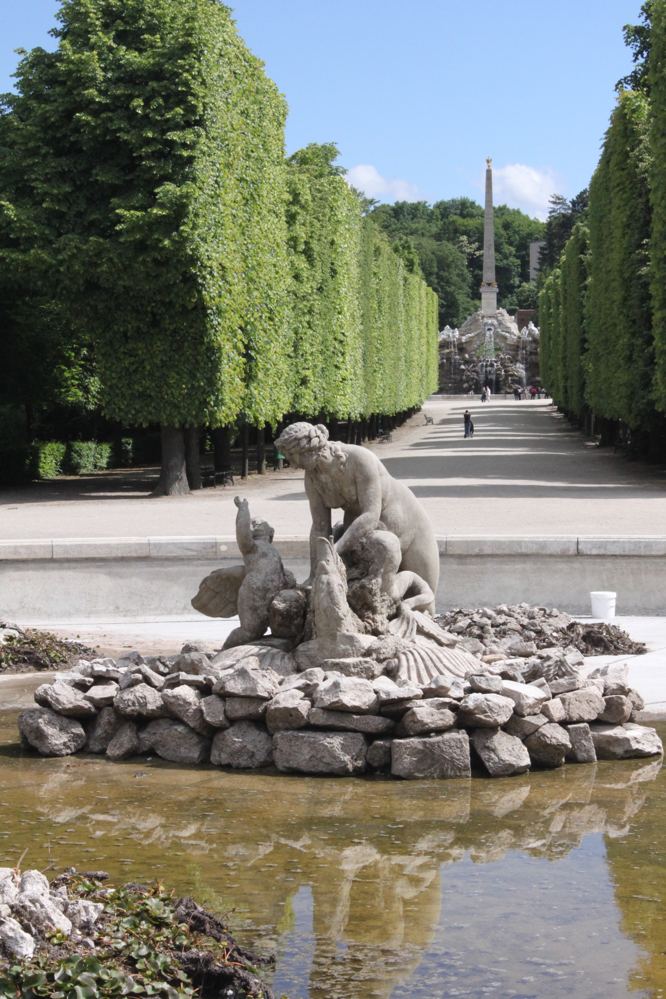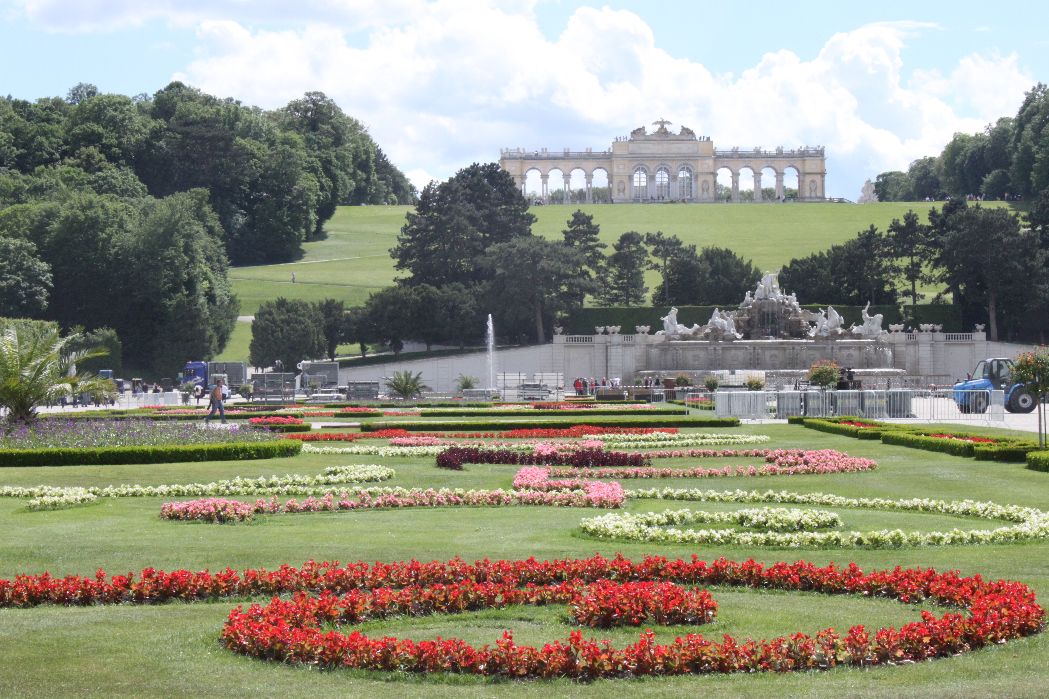 중앙통로 왼쪽에 있는 정원에서 올려다 본 넵튠 분수와 Gloriette. 분수 앞에 무대 설치를 위한 장비들이 보인다.