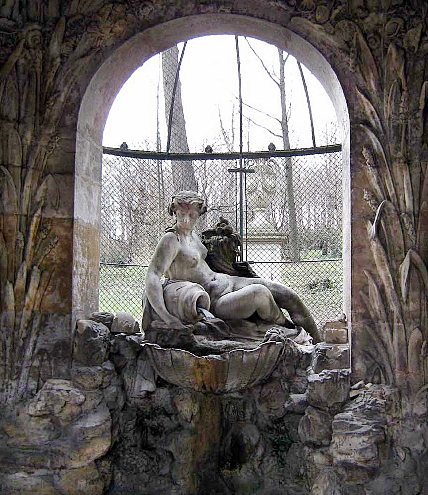 아름다운 샘 – 반원형의 아치가 있는 누각 안에 로마신화의 물의 여신인 에제리아(Egeria)가 항아리를 안고 앉아있는 모습인데 그 항아리를 통해서 지하로부터 올라오는 샘물이 흐르고 있다. 이 샘의 이름인 Schöne Brunnen에 기인하여 궁전의 이름 Schönbrunn이 지어졌다.