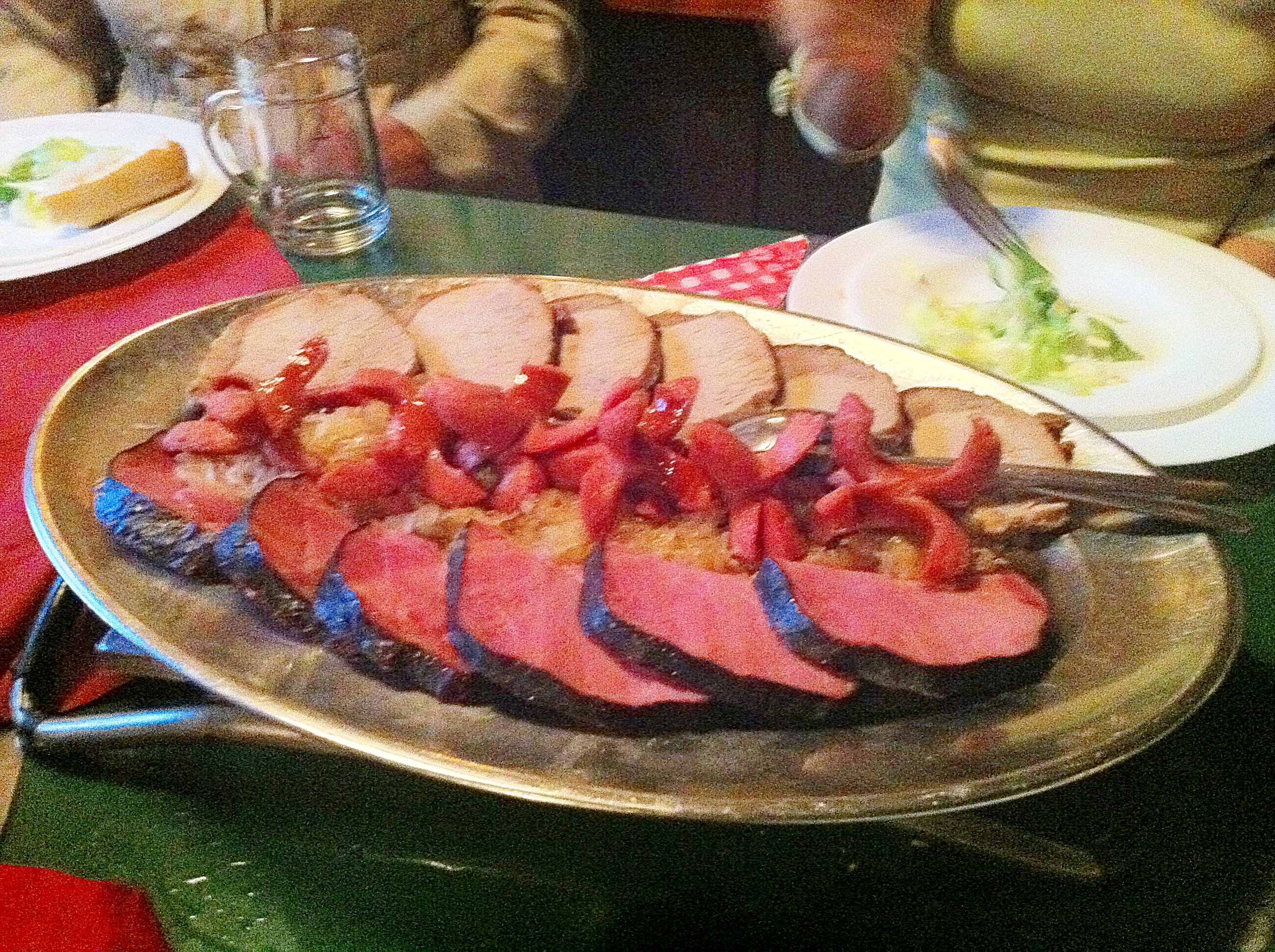 아니 ‘음악회’라고 제목을 써 놓고 무슨 음식 사진을? 음악회 가기 전에 먹은 Vienna Sausage 정식을 소개하느라 … 여행사들이 이 음식을 호이리게(Heuriger) 정식이라고 소개하는데 사실은 그렇지가 않다. 호이리게는 ‘햇’이라는 뜻의 형용사로 포도원과 포도주 양조를 겸한 winery에 부속되어 있는 선술집(tavern)을 칭하며 이런 류의 선술집에서는 자가 생산한 가장 최근의 포도주를 제공하며 주로 2인조 생음악과 함께 즐거운 시간을 갖는다. 따라서 음식이 위주가 아니고 포도주가 위주이며 안주 정도로 치즈 등을 제공하는 게 고작이다. 전통적인 호이리게는 보통 일년 중 이삼 주밖에 열지 않는다. 호이리게는 특별한 면허가 필요하고 반드시 자가 생산한 포도주만 팔게 되어있다. 따라서 호이리게 정식이라는 표현도 사실은 없다. 그러나 관광객들이 많이 몰려드는 비엔나이다 보니 시장에서 사온 포도주에 소시지, 햄, 돼지고기 스테이크(pork loin roast), 샐러드와 빵 등을 곁들여 호이리게 정식이라고 이름하여 일년 열두 달 영업하는 식당들이 생기게 된 것이다. 한가지 전통 호이리게와 같았던 것은 식사 중 아코디언과 바이올린 2인조 악사가 음악을 연주하였다는 사실이다. 우리가 갔던 곳에서는 한국 노래들을 연주해 주어 다 같이 노래 부르며 즐거운 시간을 가졌다.