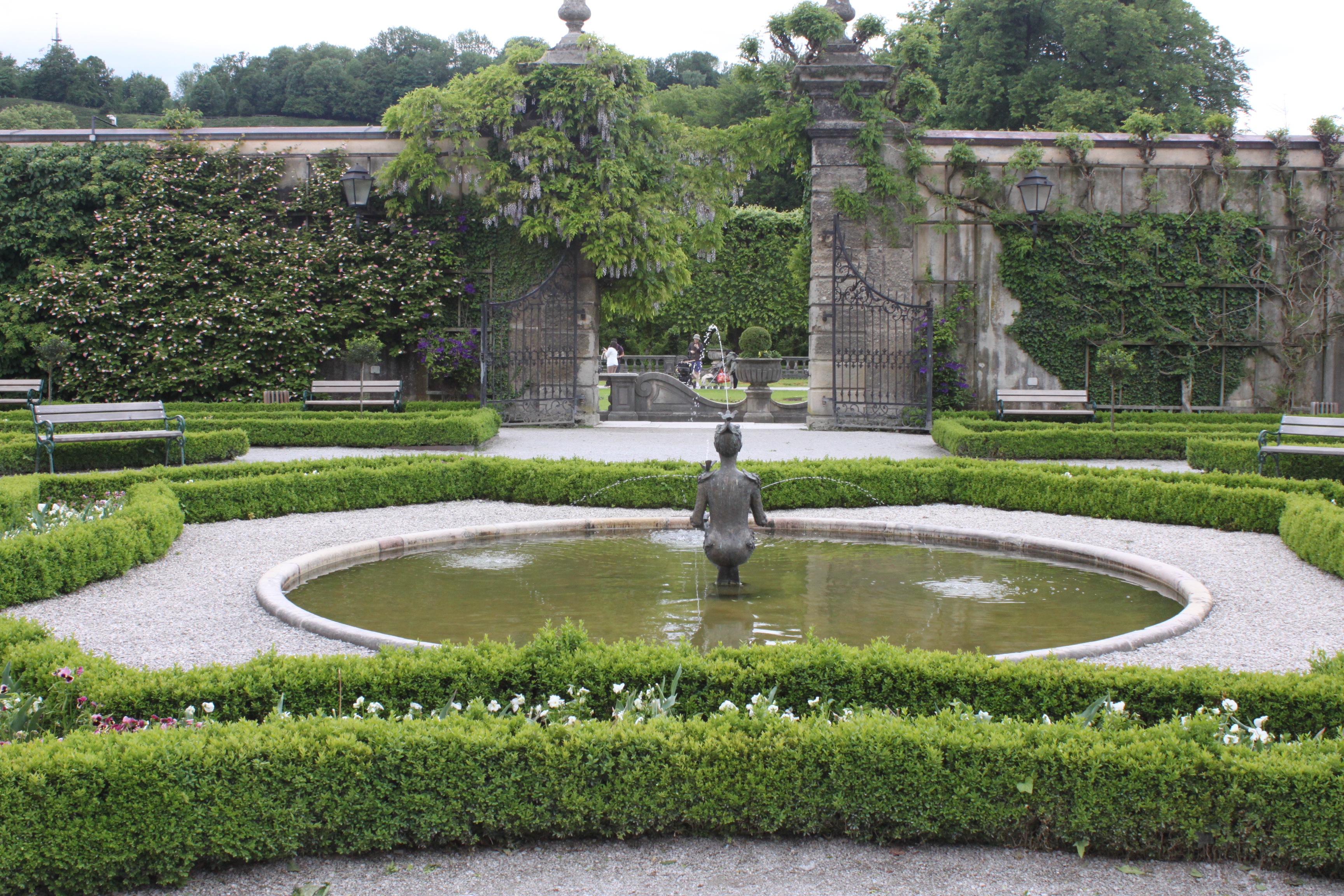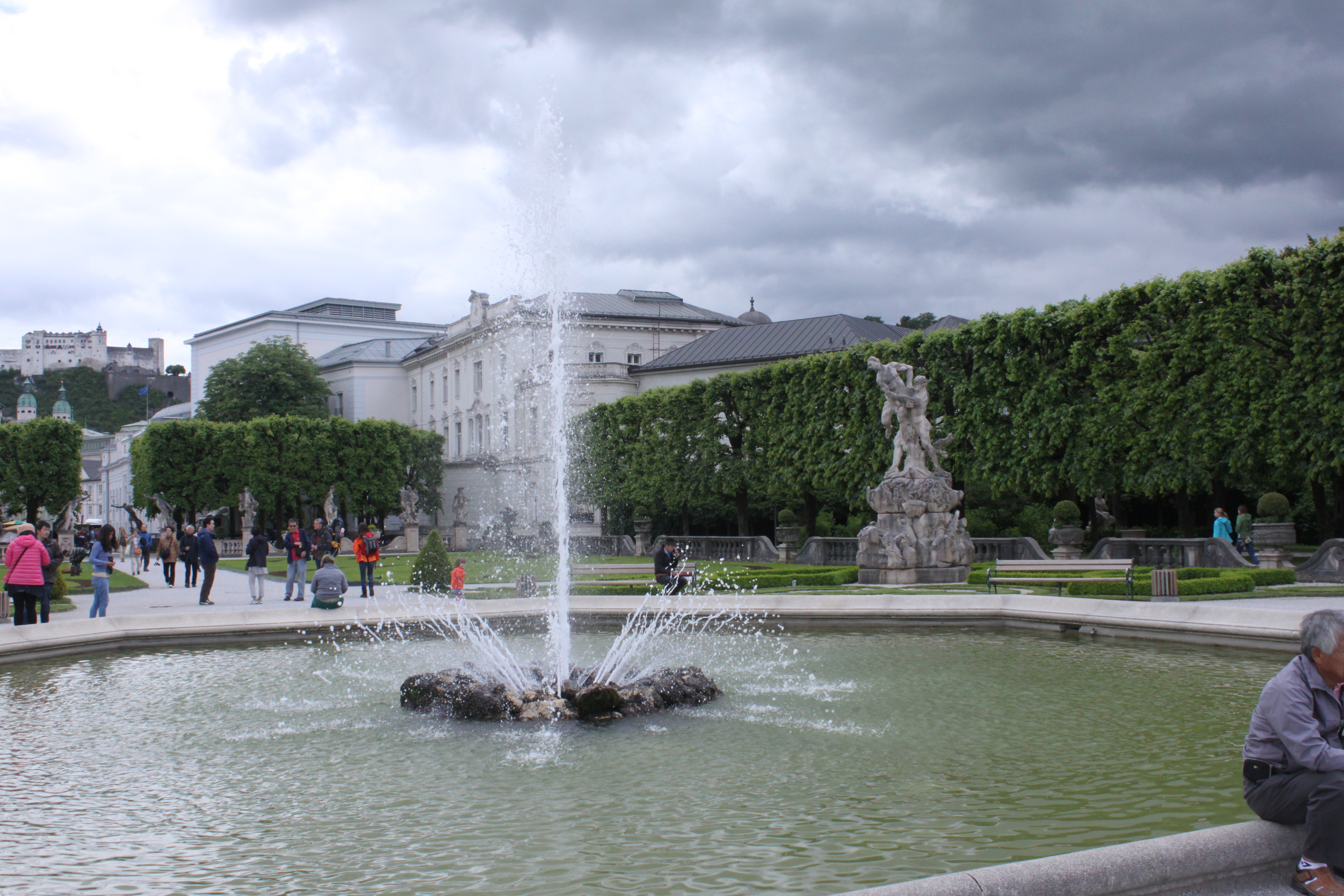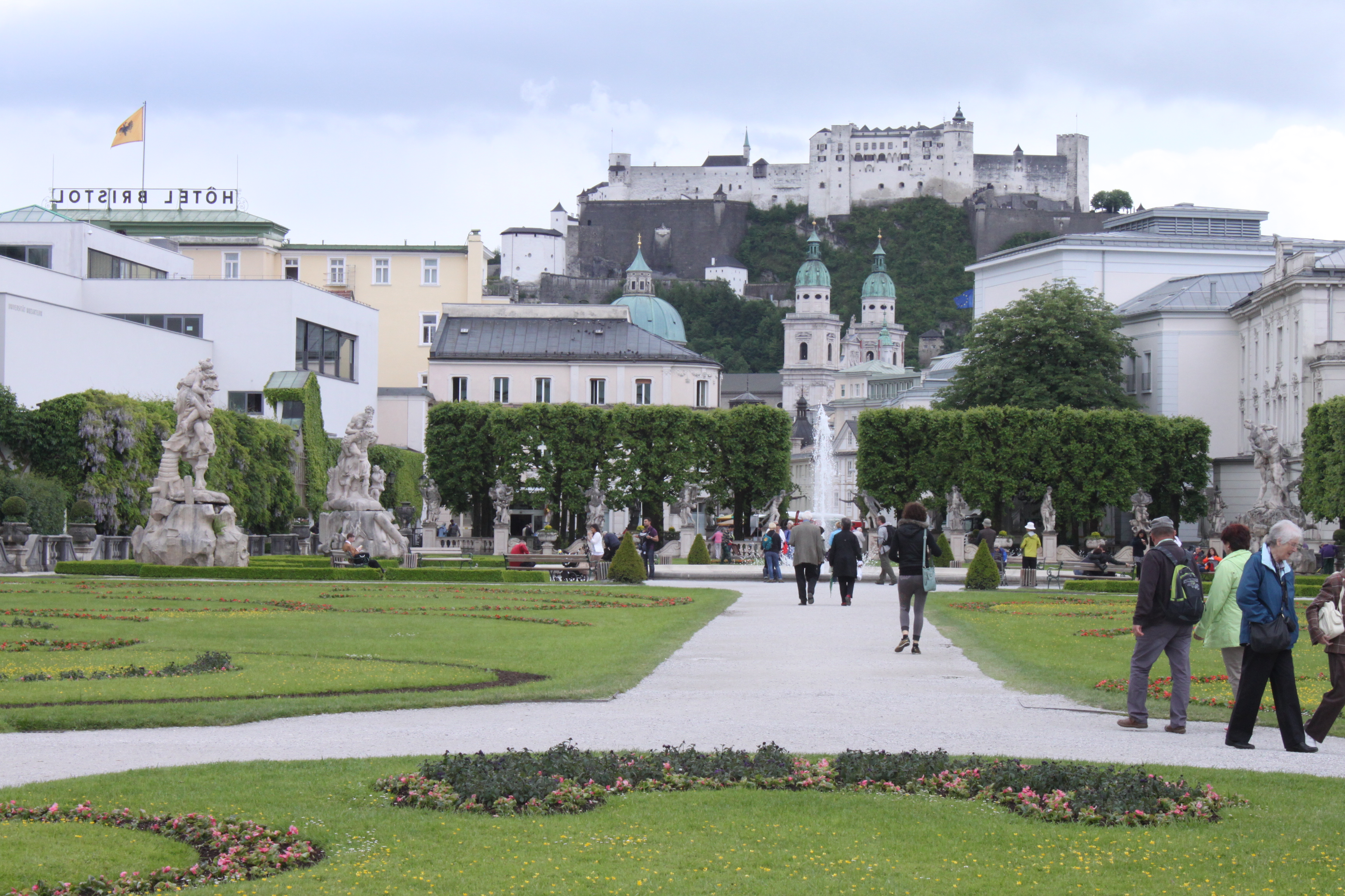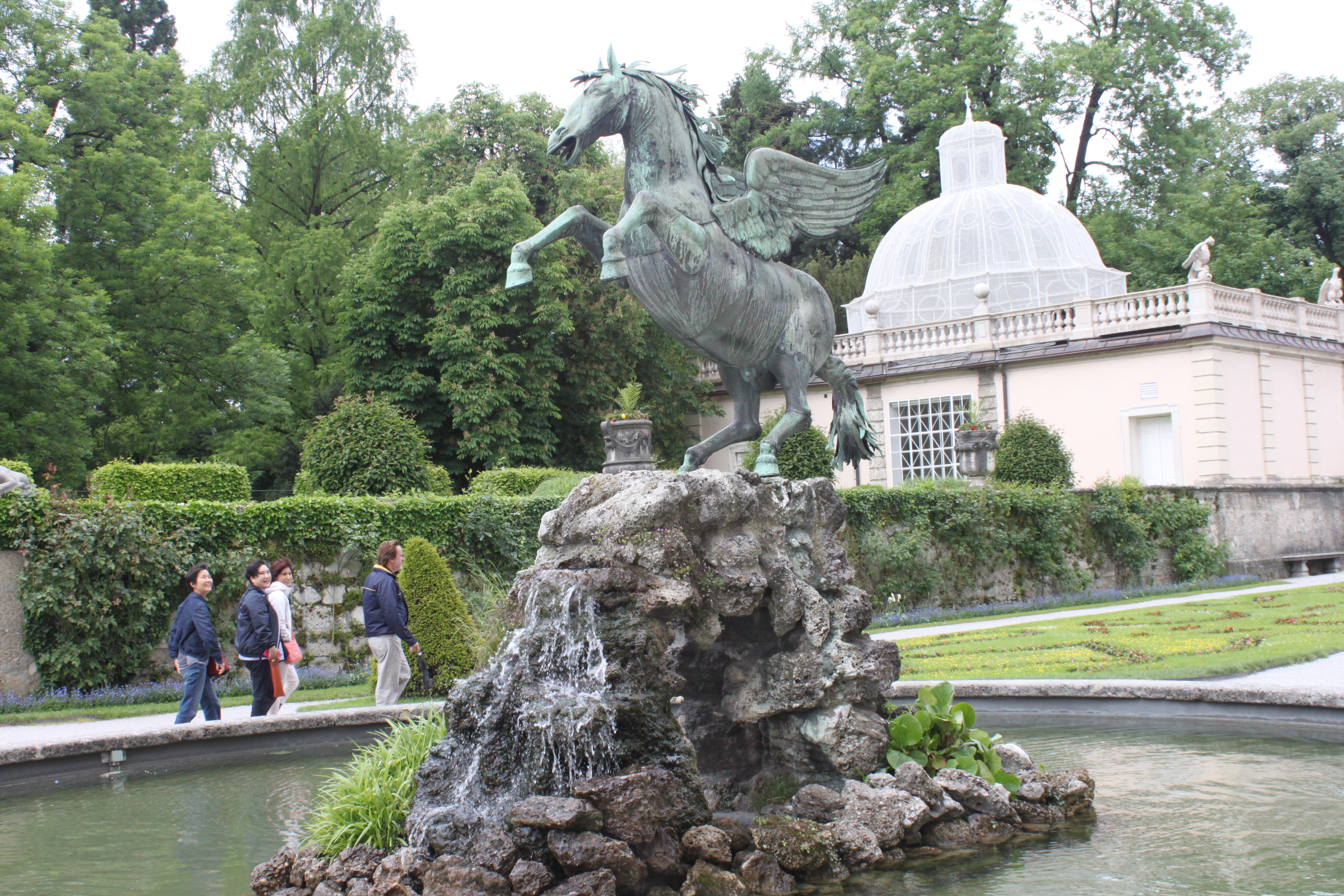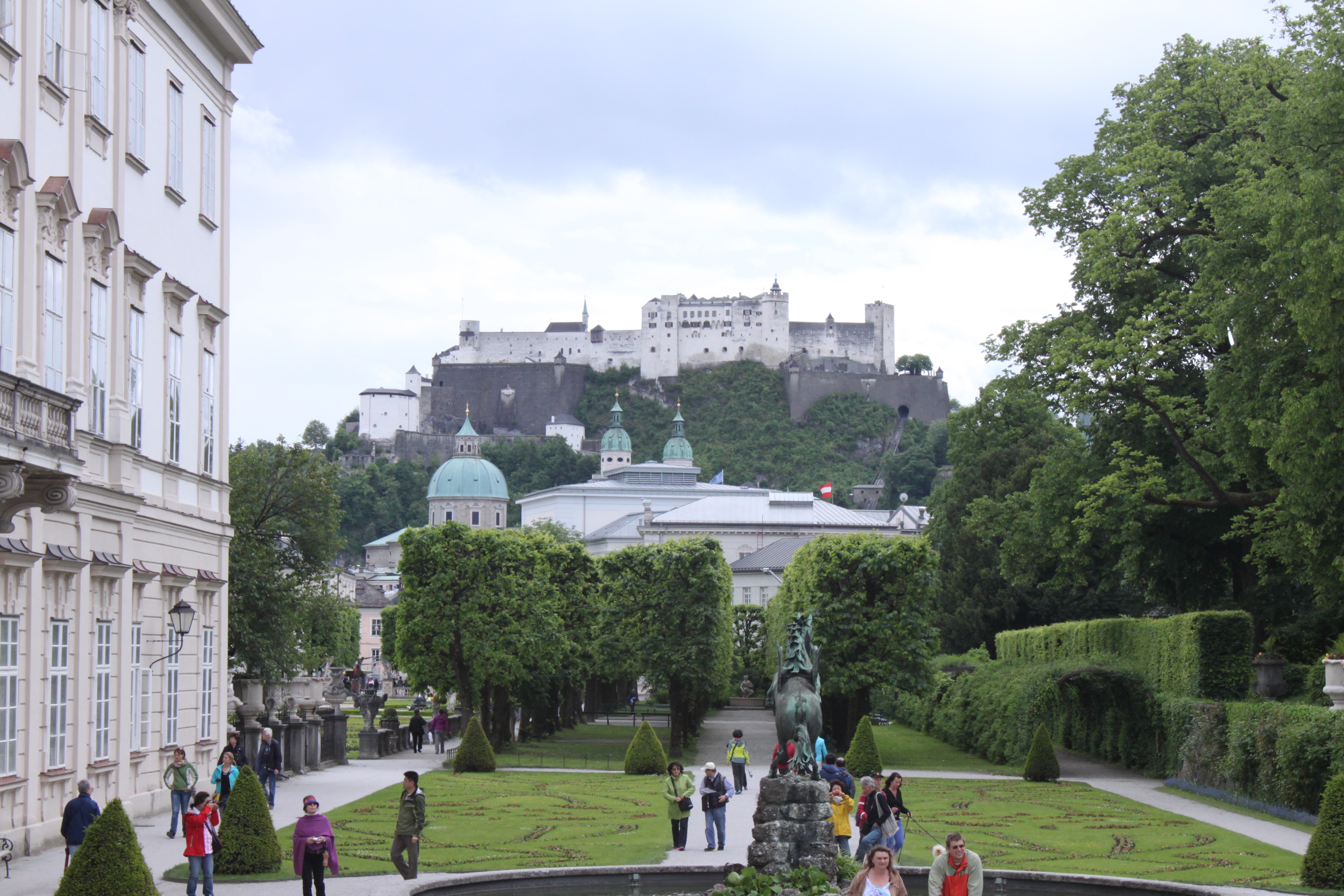 말 분수 너머로 보이는 정원과 뒤쪽 산 위에 있는 호헨잘츠부르크(Hohensalzburg) 요새. 정원과 요새 사이에 있는 돔은 잘츠부르크 성당. 말 분수를 지나서 오른쪽에 보이는 넝쿨 아치로 아이들과 뛰어가는 장면이 Sound of Music에 나온다.
