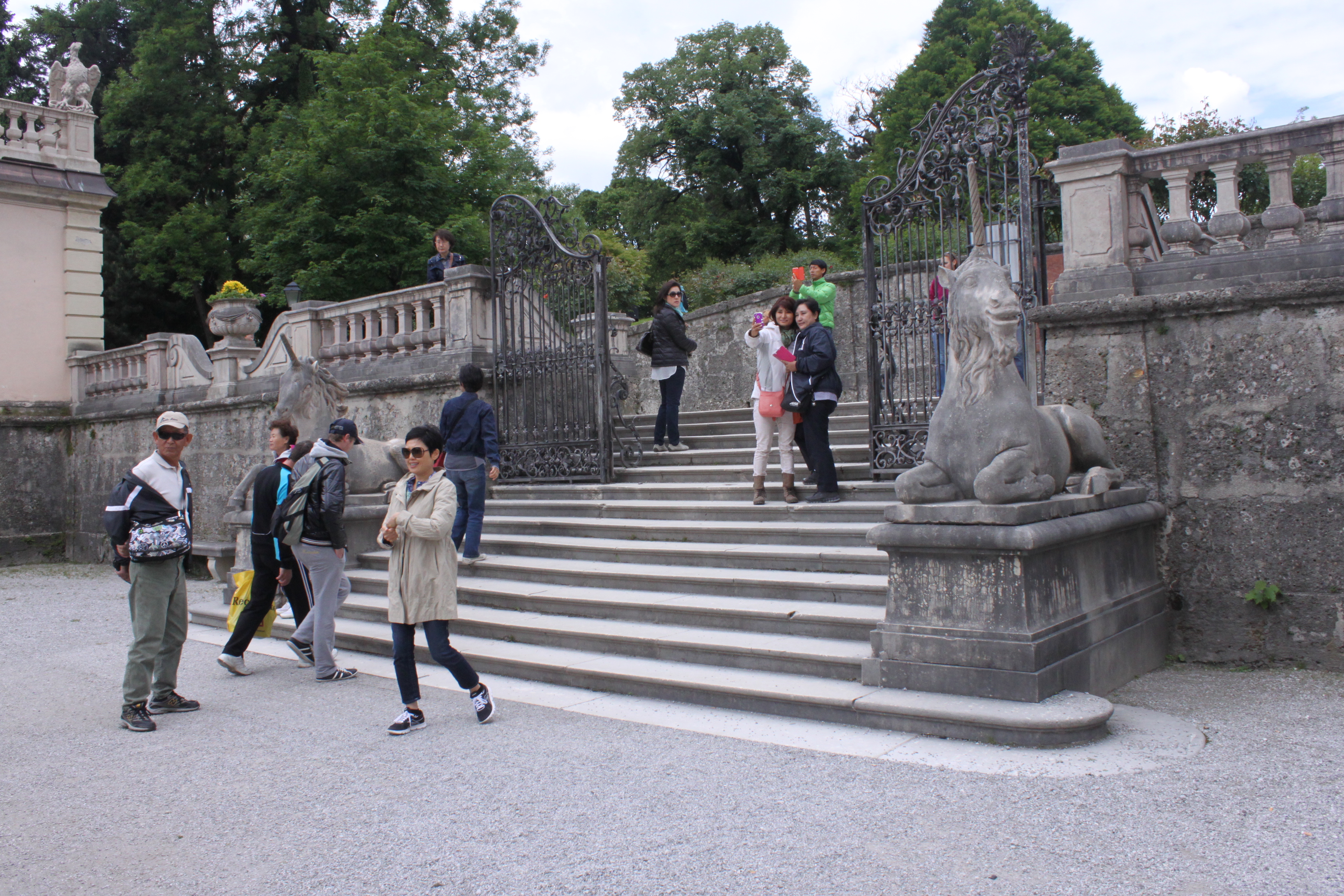 일명 도레미 계단 – Sound of Music에서 가정교사 마리아(쥴리 앤드류스)가 아이들과 함께 계단을 음계로 사용하여 도레미를 부른다 – 위에서 내려다 본 미라벨 정원. 왼쪽에 있는 건물이 미라벨 궁이며 가운데에 말 분수가 있다.