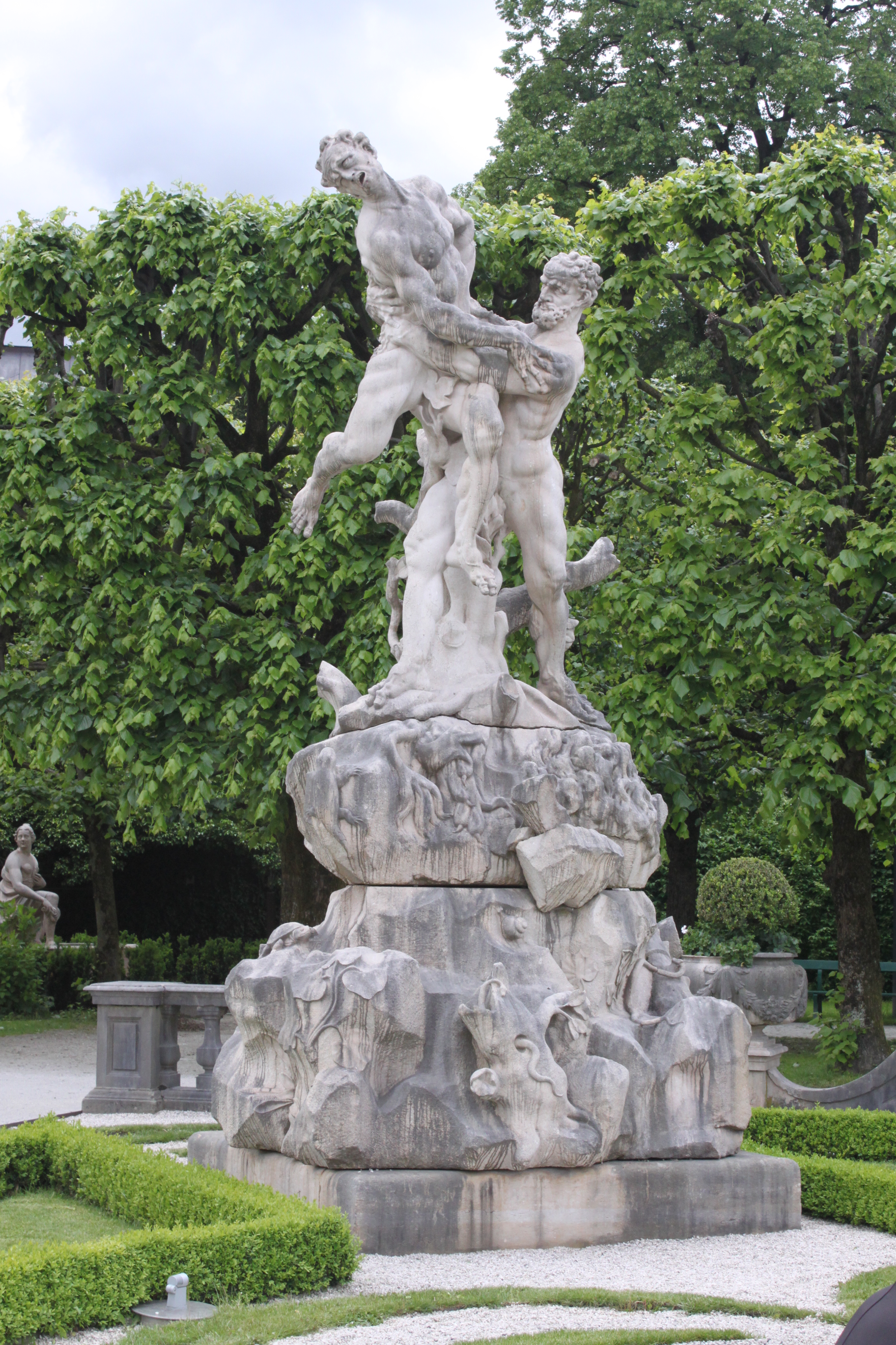 중앙정원에 있는 분수와 주변에 있는 그리스 신화를 주제로 한 조각들