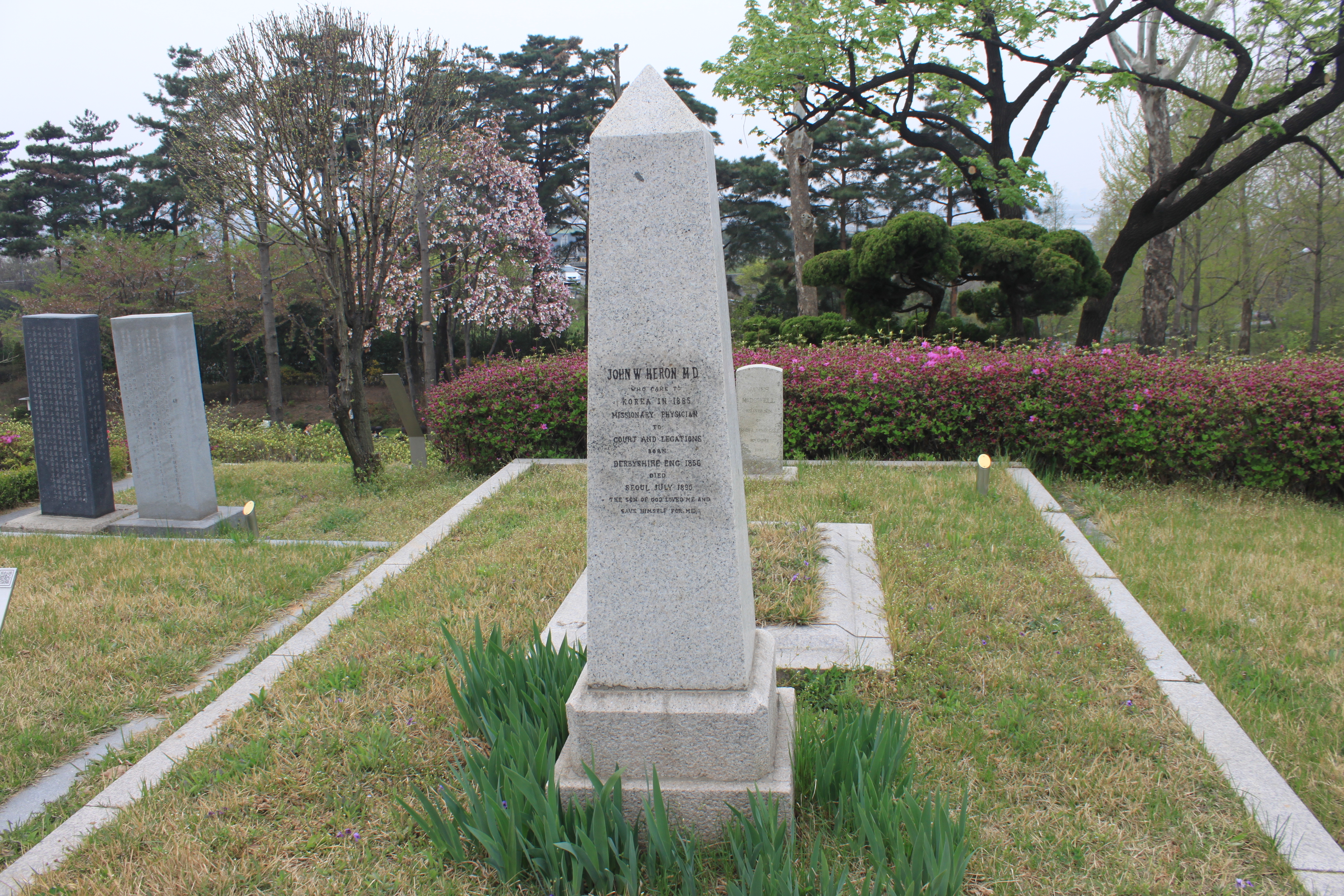 의대를 수석으로 졸업한 헤론은 젊은 나이에 의대교수로 초빙 받았지만 이를 마다하고 미 북장로회 선교사로 지망하여 조선으로 오게 된다. 헤론의 조선사역 발판은 그에 앞서 역시 북장로회에서 파송 받아 조선에 온 의료선교사 Horace Allen이 쌓아 놓았다. 알렌은 갑신정변 우정국 사건(1884년 12월 4일)에서 치명상을 입어 생명이 경각에 달린 민영익을 수술하여 살려냄으로 고종의 신임을 얻게 되어 궁정시의로 임명 받게 된다. 그는 서양병원의 설립을 허락 받고 고종은 광혜원(廣惠院, 1885년 4월 10일)이라는 이름까지 하사하였다. 광혜원은 왕실 사람들만 치료하였는데 알렌은 곧바로 일반백성들의 치료를 탄원하여 허락 받고 제중원(濟衆院, 1885년 4월 26일)이라고 이름을 바꾸었다. 비로서 백성들이 서양의료의 혜택을 보게 되었고 또한 치료하는 가운데 선교가 가능하게 되었다. 바로 이 시기(1885년 6월 21일)에 조선에 온 헤론은 제중원의 2대 원장으로 취임하게 된다. 원장을 넘긴 알렌은 서양의료기술을 가르치기 위한 지금으로 치자면 의과대학의 설립을 추진하였고, 조선에서 미국으로 파견한 외교관과 함께 미국으로 가서 조선을 소개하는데 공헌하였으며, 미국은 그를 주한 미국 공사로 파견하기에 이른다. 이런 관계로 대원군으로부터 엄청난 박해를 받았던 천주교와는 달리 기독교는 상대적으로 원만한 선교를 할 수 있게 되었다. 당시 조선의 환경은 매우 불결하였고 위생에 대한 관념도 거의 없는 상태라 천연두나 장티푸스 같은 전염병이 철 따라 돌아 수많은 사상자를 내는 현실이었다. 헤론은 낮에는 수도 없이 밀려오는 환자들을 치료하며 복음을 전했고 밤에는 성경번역으로 불철주야 사역에 전력을 다하였다. 헤론은 이렇게 자신의 몸도 돌보지 않고 조선을 향한 하나님의 사랑을 전하던 중 1890년 7월 26일 33세라는 젊은 나이에 이질에 걸려 그만 소천하게 된다. 헤론은 그의 병상을 지키던 부인과 언더우드에게 ‘나의 사역은 참으로 보잘 것 없었지만 모두가 주님을 위한 것이었다.’라고 고백하였다 한다. 헤론의 죽음을 많은 조선 백성들이 슬퍼했으며, 앞 글에서 설명했듯이, 양화진 외국인 묘지는 그의 죽음으로 인해 생겨났다. 양화진에 최초로 안장된 선교사 헤론의 묘는 묘원의 거의 중앙에 위치해 있다.