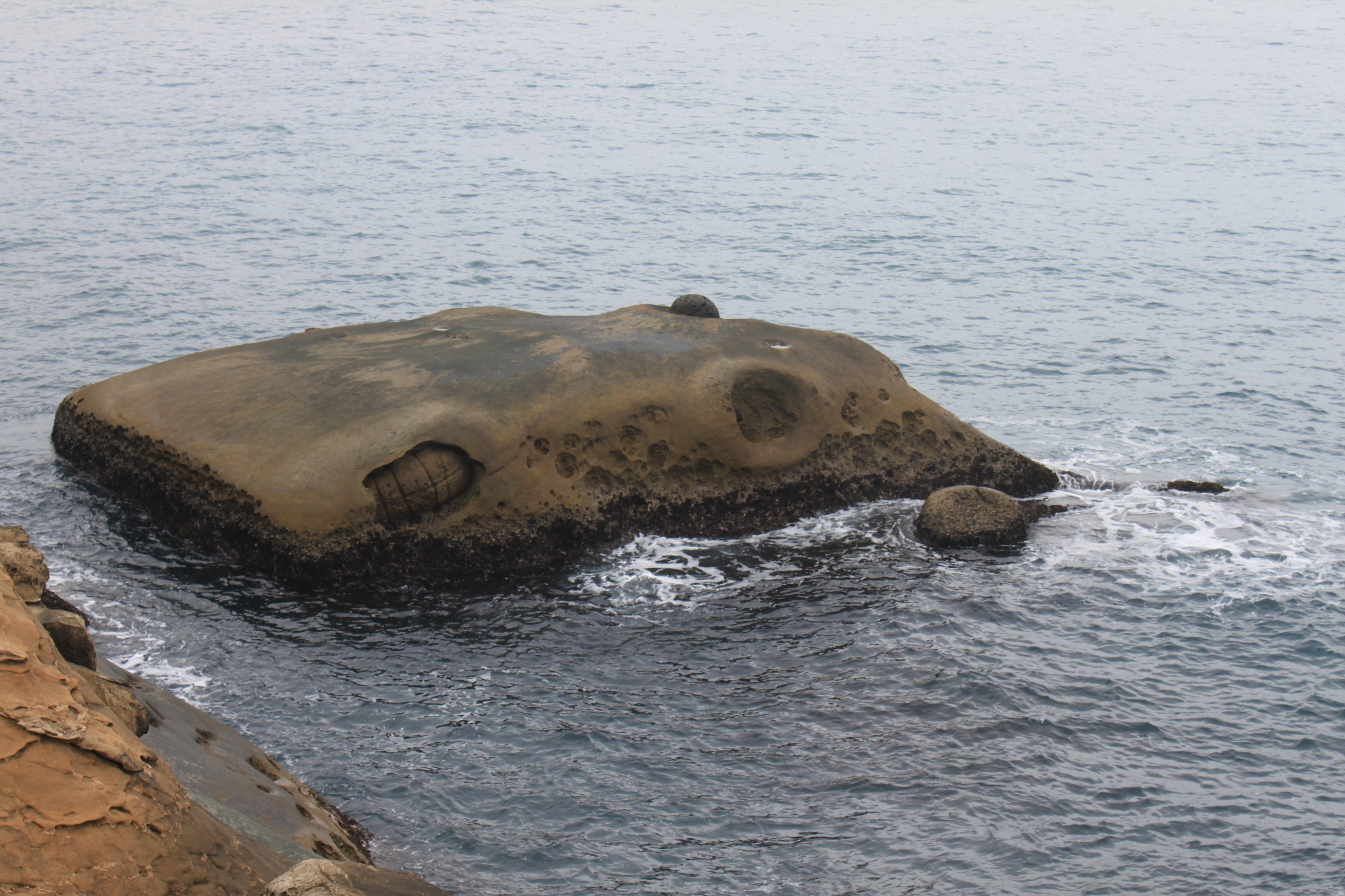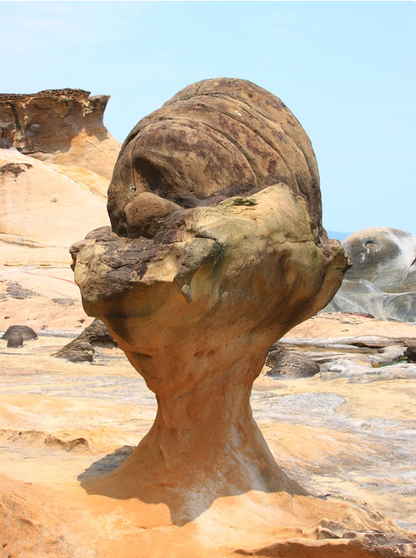 바위 위쪽에 연한 색의 지층이 있고 바로 그 아래 중앙보다 약간 오른쪽에 마치 굴착기로 뚫은 듯한 타원형의 구멍이 있다. 그 아래로는 바위가 깨어져 나간 듯한 부분이 있는데 함께 눈과 입을 연상케 하는데 별명이 무슨 머리라고 들었는데 잘 기억이 나지 않는다 – 새였는지 아니면 어떤 동물이었는지. 배경에 전망대로 올라가는 계단이 보인다.