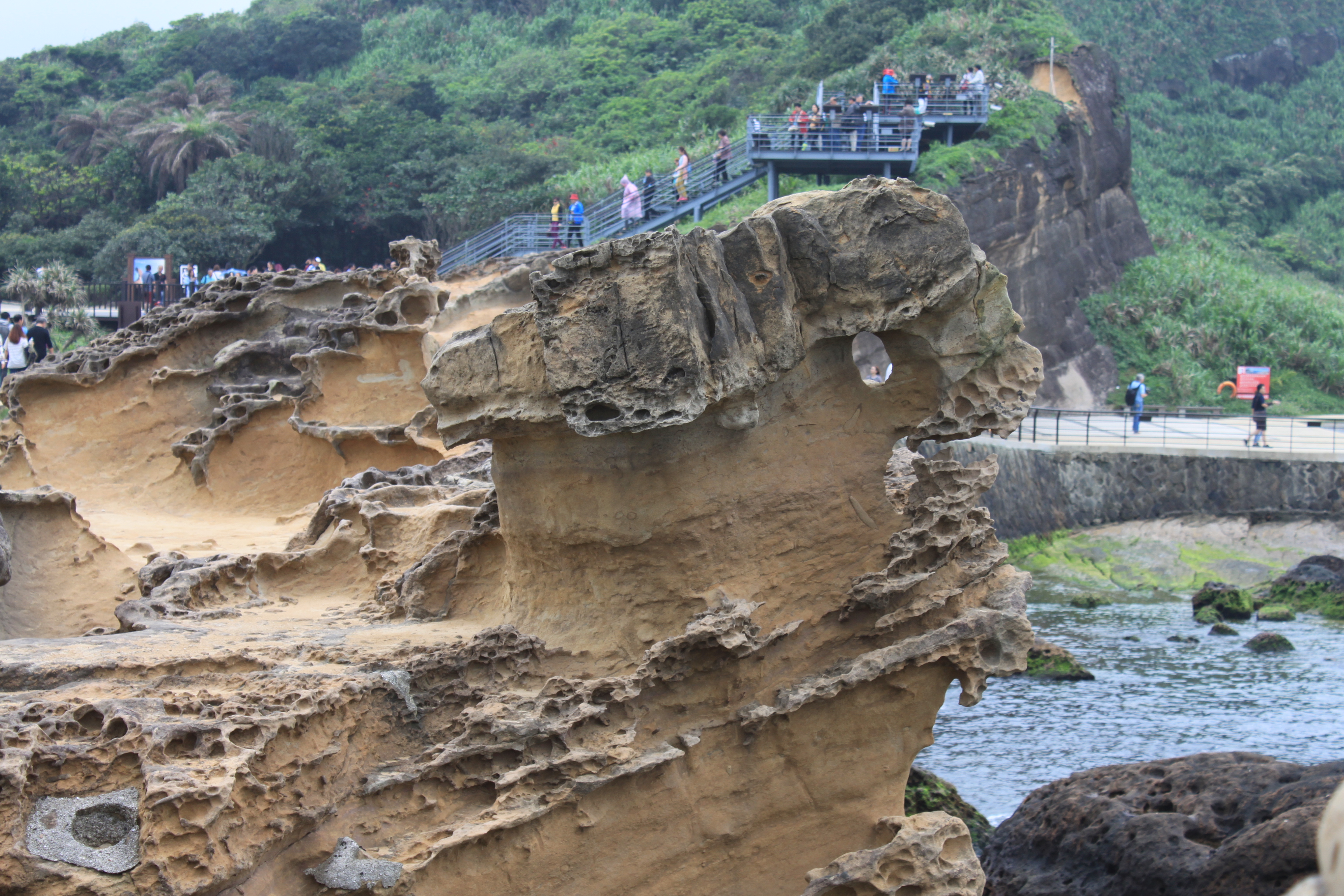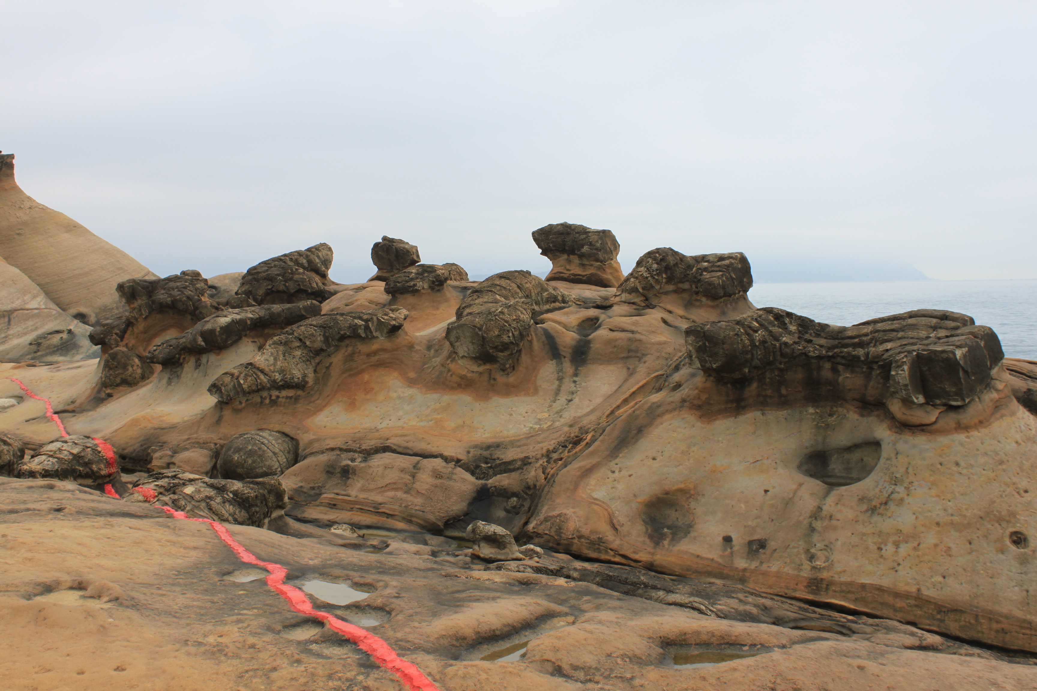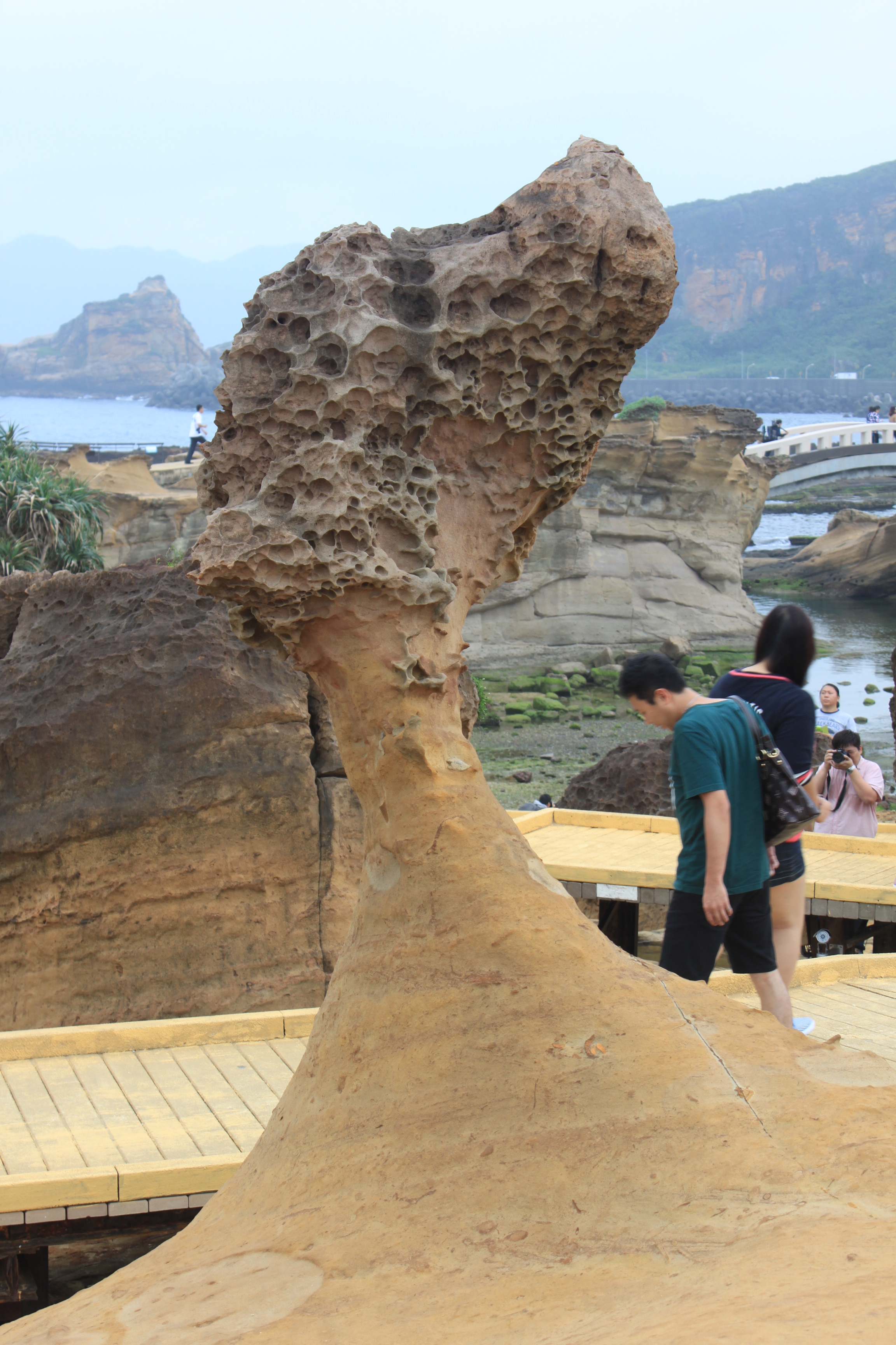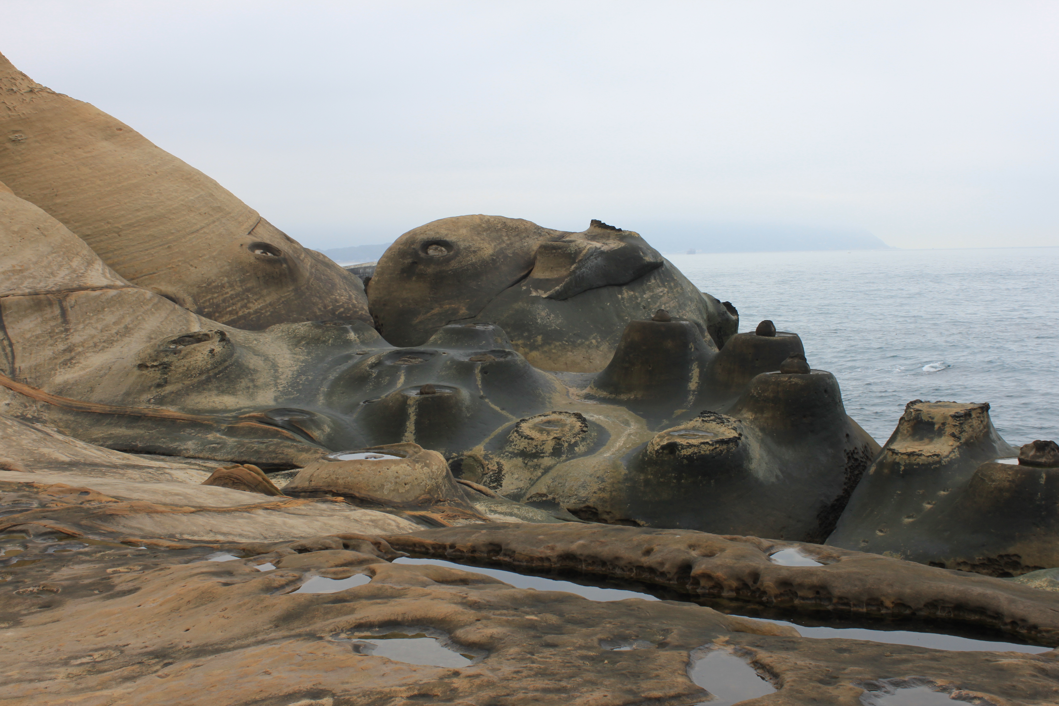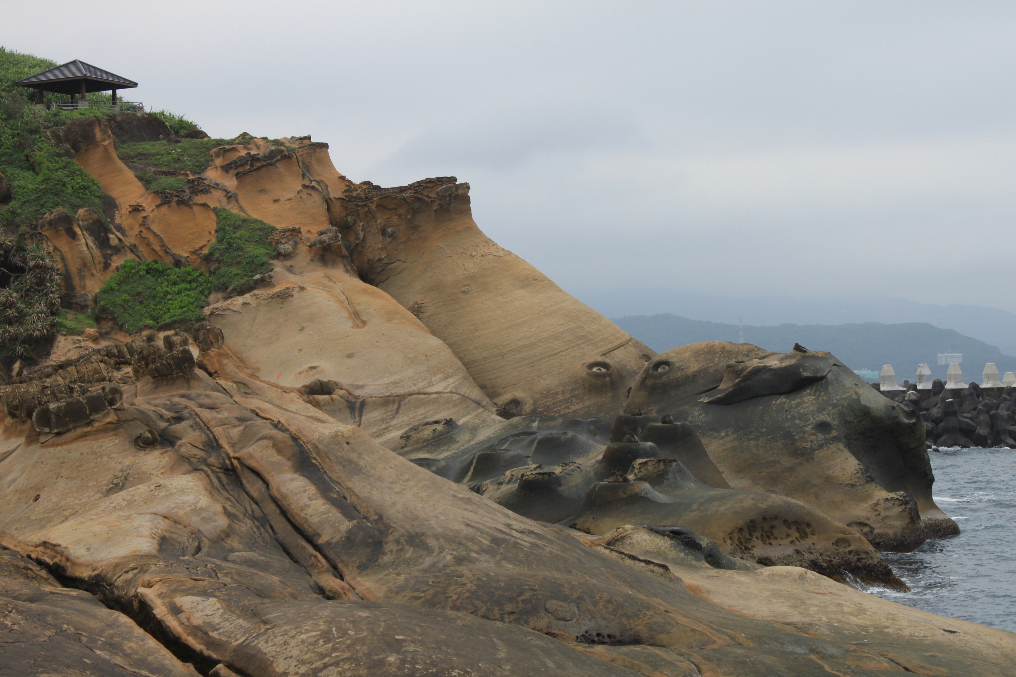 야류 지질공원의 바다 끝 쪽에 해당하는 부분이 사진 중앙보다 약간 오른쪽에 보인다. 이런 지형을 Cuesta라고 하는데 능선의 각도가 좌우대칭이 아니고 한 쪽은 급격하고 다른 한 쪽은 완만한 경우이다. Cuesta는 강도가 다른 연한 지층들 맨 위에 강한 지층이 형성된 상태에서 지각의 변동으로 단면이 노출되었을 때 연한 지층이 빨리 풍화 침식되어 생긴다. 사진에서 왼쪽편이 연한 부분이며 거센 파도에 노출되어 급격히 침식되어 급한 경사를 이루었다. 실제로 그 끝에 가서 보니 왼쪽 편은 푸석해 보이지만 오른쪽 등성이로 올라가면 표면이 맨질 맨질 한 게 차돌 같은 느낌을 준다.