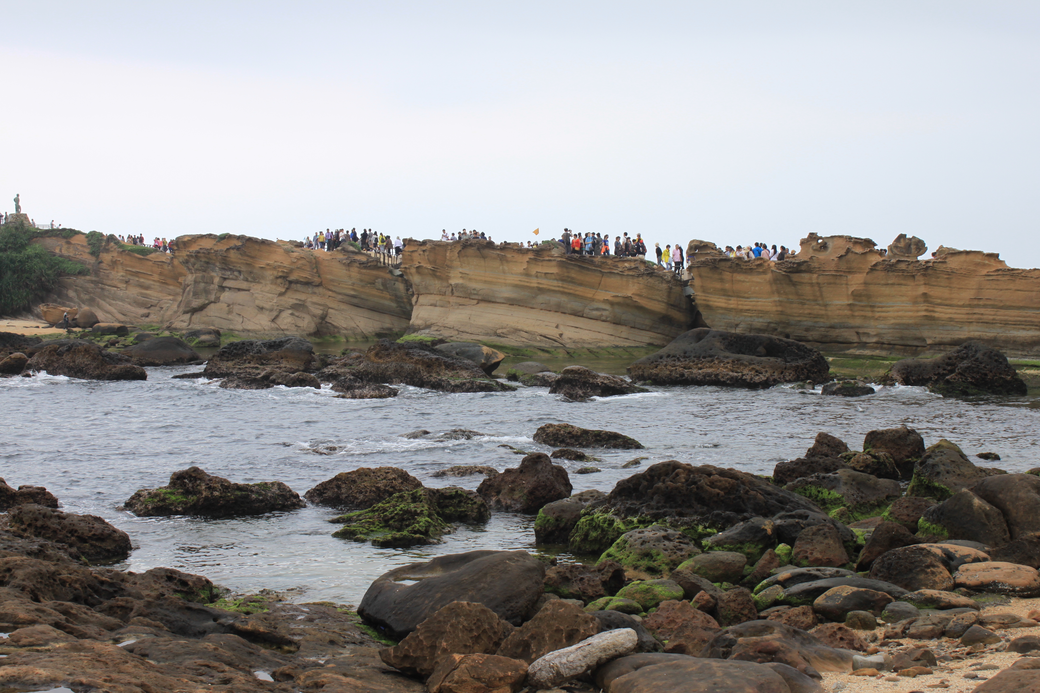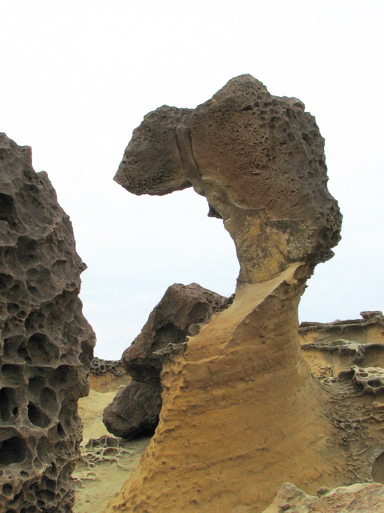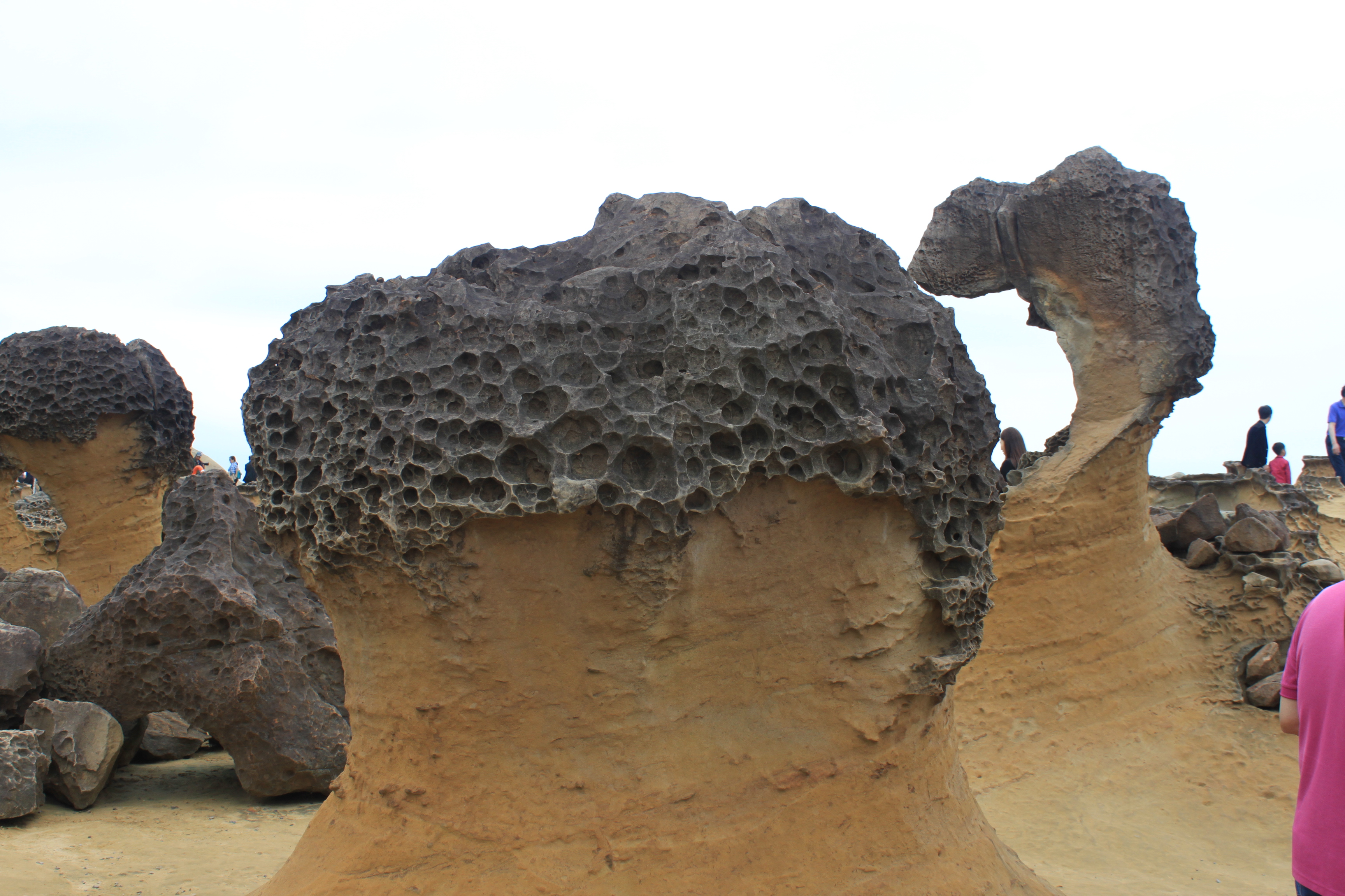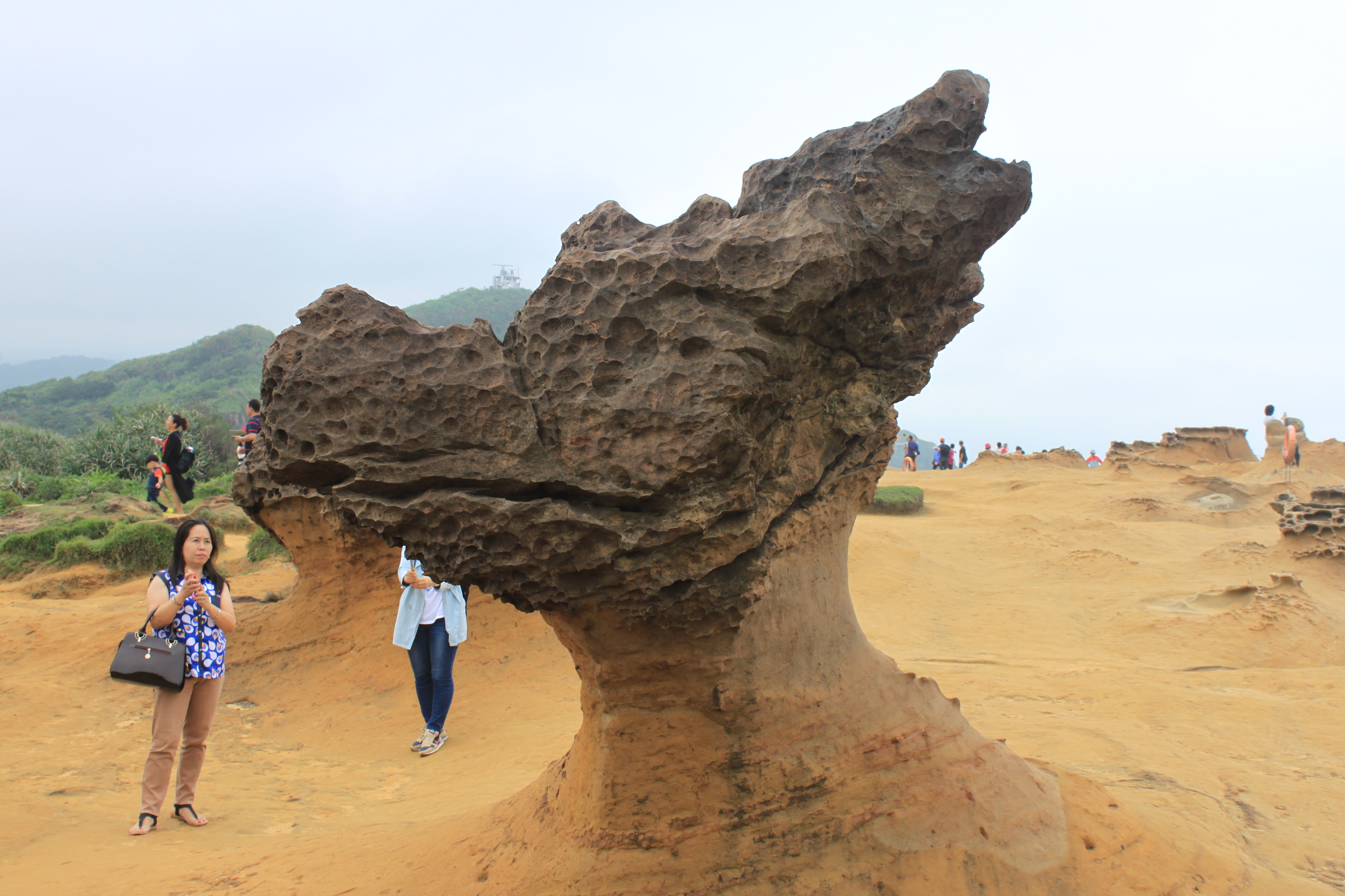 야류 지질공원의 바다 끝 쪽에 해당하는 부분이 사진 중앙보다 약간 오른쪽에 보인다. 이런 지형을 Cuesta라고 하는데 능선의 각도가 좌우대칭이 아니고 한 쪽은 급격하고 다른 한 쪽은 완만한 경우이다. Cuesta는 강도가 다른 연한 지층들 맨 위에 강한 지층이 형성된 상태에서 지각의 변동으로 단면이 노출되었을 때 연한 지층이 빨리 풍화 침식되어 생긴다. 사진에서 왼쪽편이 연한 부분이며 거센 파도에 노출되어 급격히 침식되어 급한 경사를 이루었다. 실제로 그 끝에 가서 보니 왼쪽 편은 푸석해 보이지만 오른쪽 등성이로 올라가면 표면이 맨질 맨질 한 게 차돌 같은 느낌을 준다.