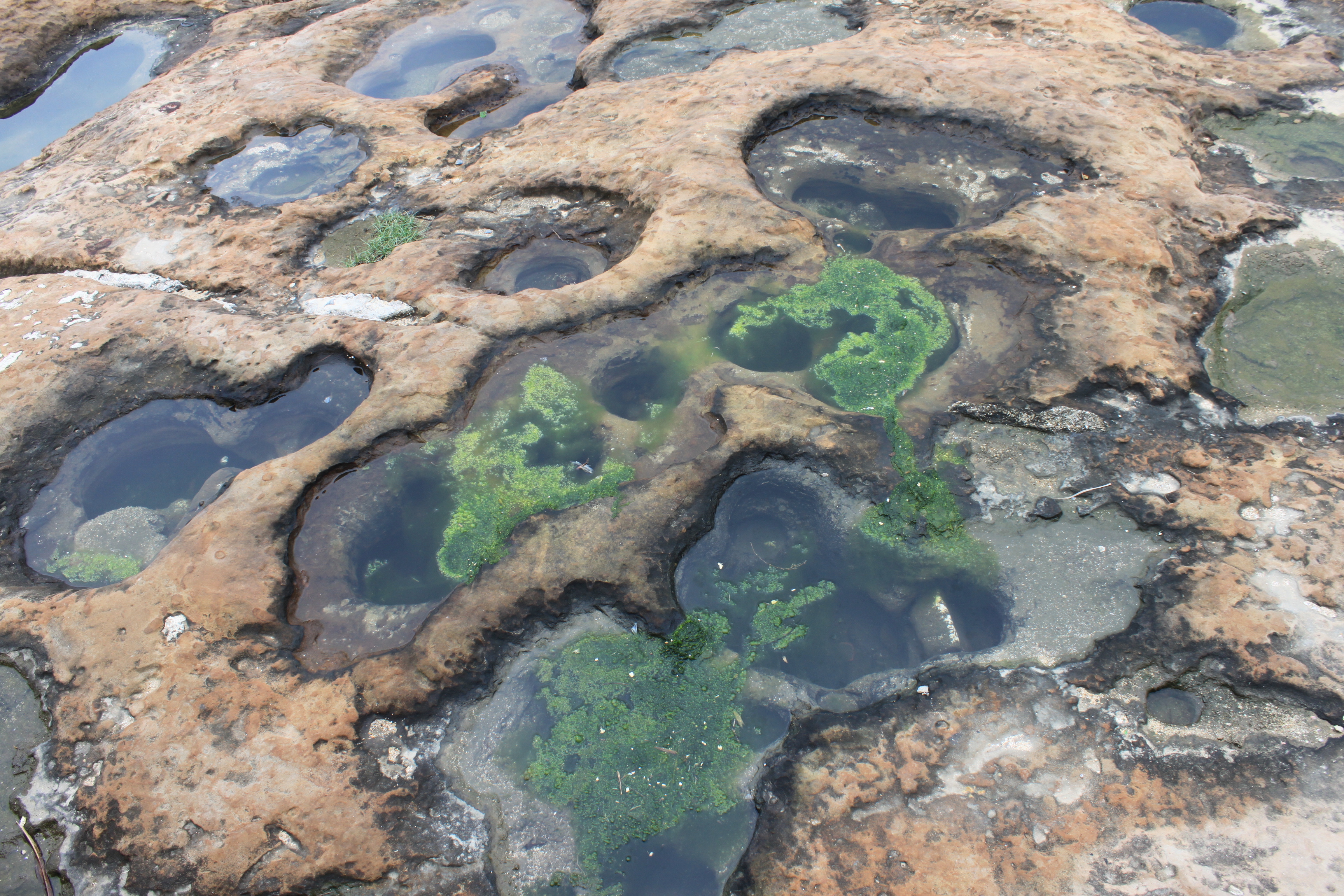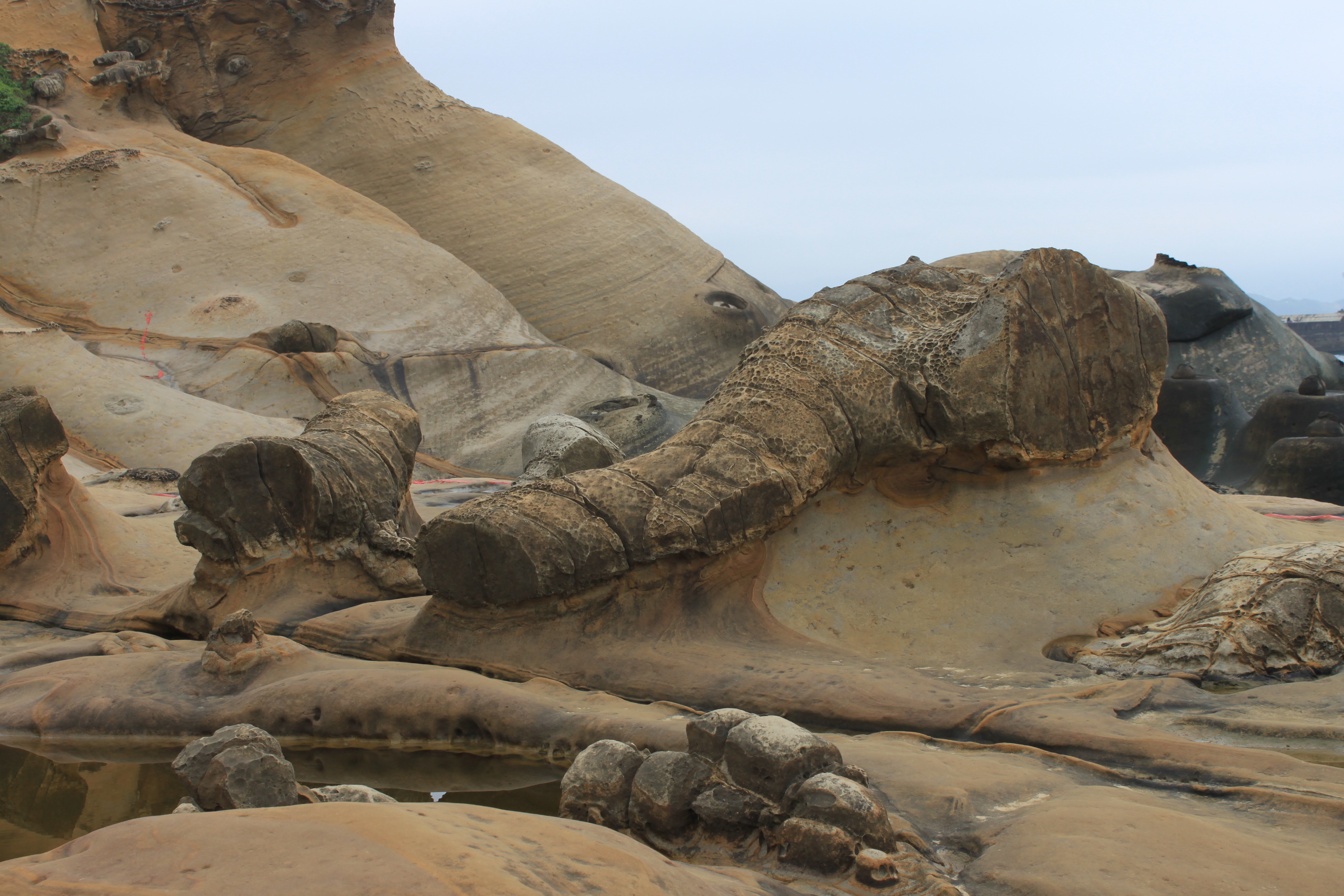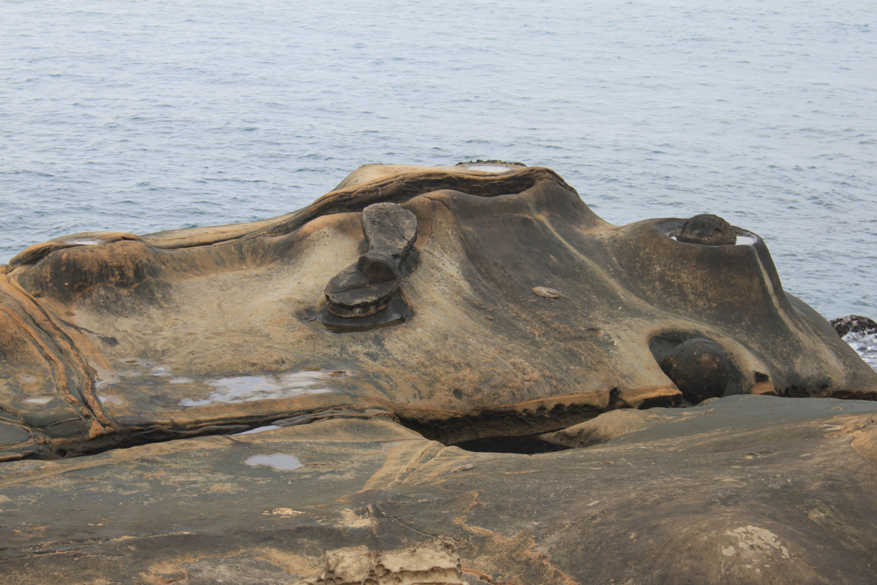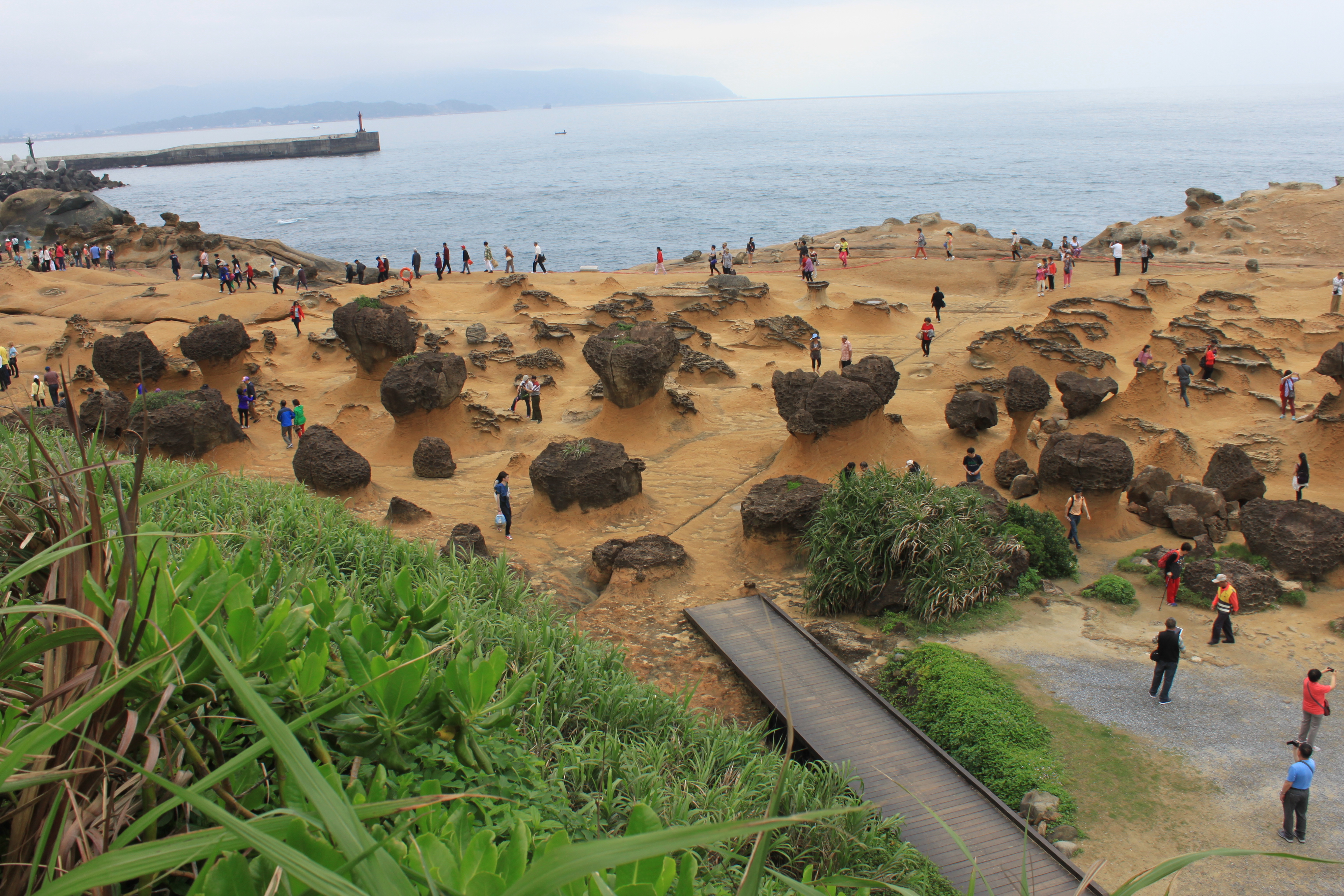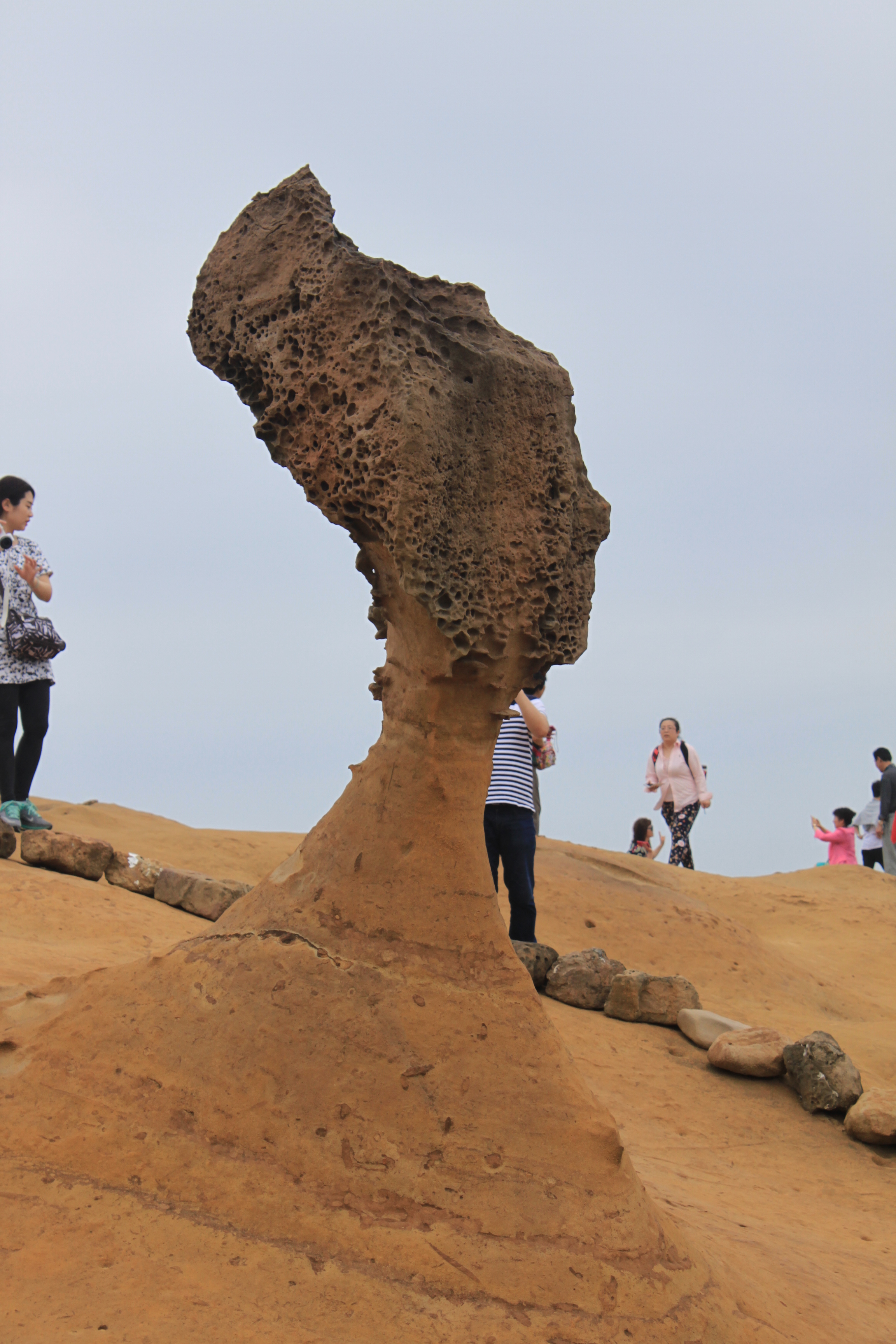 야류 지질공원의 바다 끝 쪽에 해당하는 부분이 사진 중앙보다 약간 오른쪽에 보인다. 이런 지형을 Cuesta라고 하는데 능선의 각도가 좌우대칭이 아니고 한 쪽은 급격하고 다른 한 쪽은 완만한 경우이다. Cuesta는 강도가 다른 연한 지층들 맨 위에 강한 지층이 형성된 상태에서 지각의 변동으로 단면이 노출되었을 때 연한 지층이 빨리 풍화 침식되어 생긴다. 사진에서 왼쪽편이 연한 부분이며 거센 파도에 노출되어 급격히 침식되어 급한 경사를 이루었다. 실제로 그 끝에 가서 보니 왼쪽 편은 푸석해 보이지만 오른쪽 등성이로 올라가면 표면이 맨질 맨질 한 게 차돌 같은 느낌을 준다.