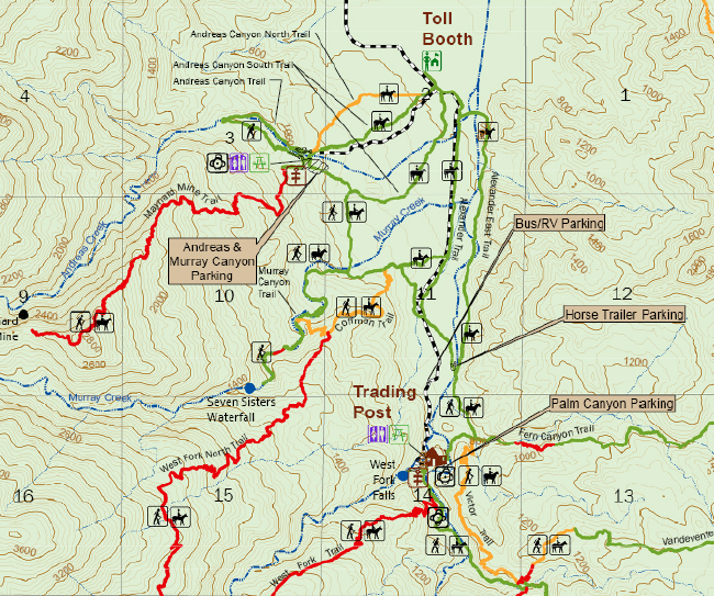 Casual visitor들이 쉽게 다녀갈 수 있는 대표적인 trail로 Andreas Canyon, Murray Canyon 그리고 Palm Canyon을 꼽는다. Andreas Canyon은 약 1 mile loop으로 elevation gain이 50여ft밖에 되지 않는 가장 쉬운 trail이지만 이 지역의 특징이 집약되어있는 아름다운 trail이다. Murray Canyon은 왕복 약 6 mile로 elevation gain은 약 500 ft 정도이다. 주차장에서 계곡 입구까지 약 1 mile의 풀 한 포기 없는 재 빛의 먼지투성이 길을 가야 하는 것이 단점이랄까? 일단 계곡에서부터는 야자나무 그늘 속에 물이 흐르는 계곡을 따라 trail이 나 있는데 물에 젖은 미끄러운 징검다리를 많이 건너야 하니, 혹시라도 미끄러져 물에 빠지면 낭패이니, 제대로 된 hiking shoes와 지팡이를 추천한다. Trail 끝에는 Seven Sisters Waterfall이 있다. Palm Canyon Trail은 편도 총 15 mile인데 elevation gain이 약 2,000 ft로 국도 74번까지 연결된다. Trailhead는 세계에서 California Fan Palm이 가장 많이 군집해 있는 곳으로 알려져 있다.