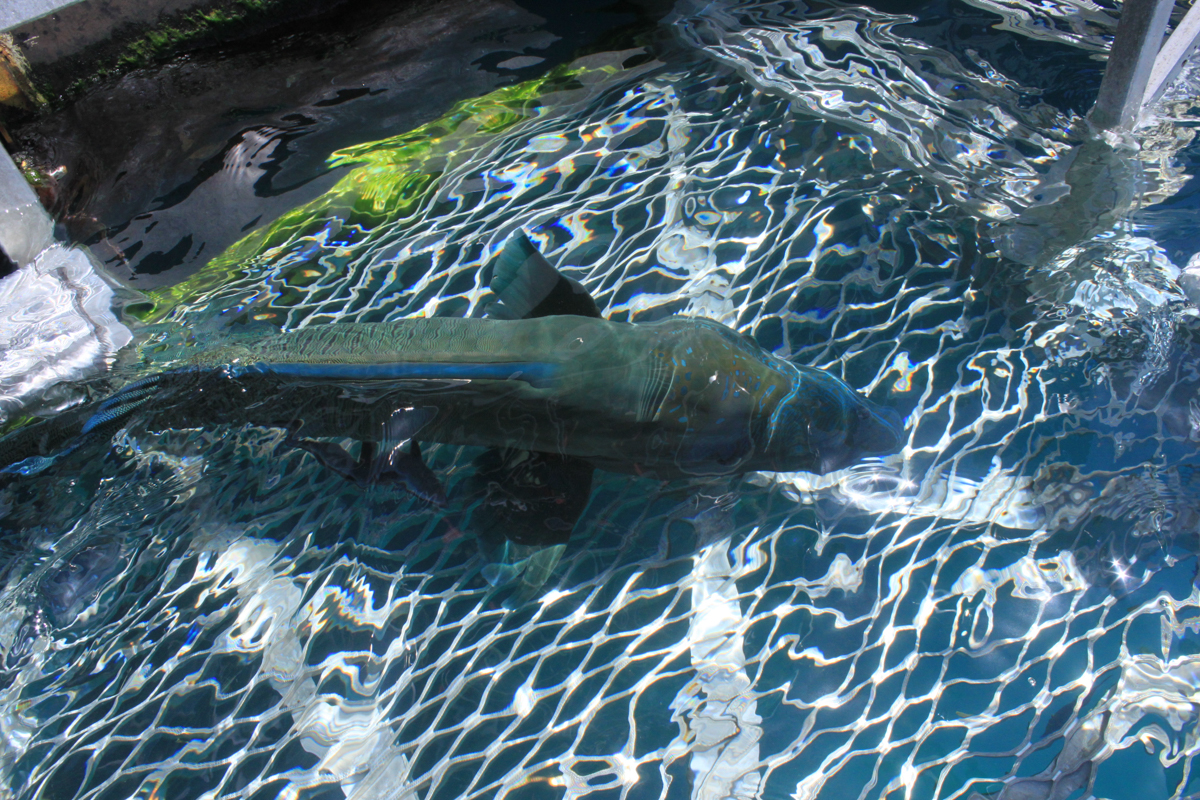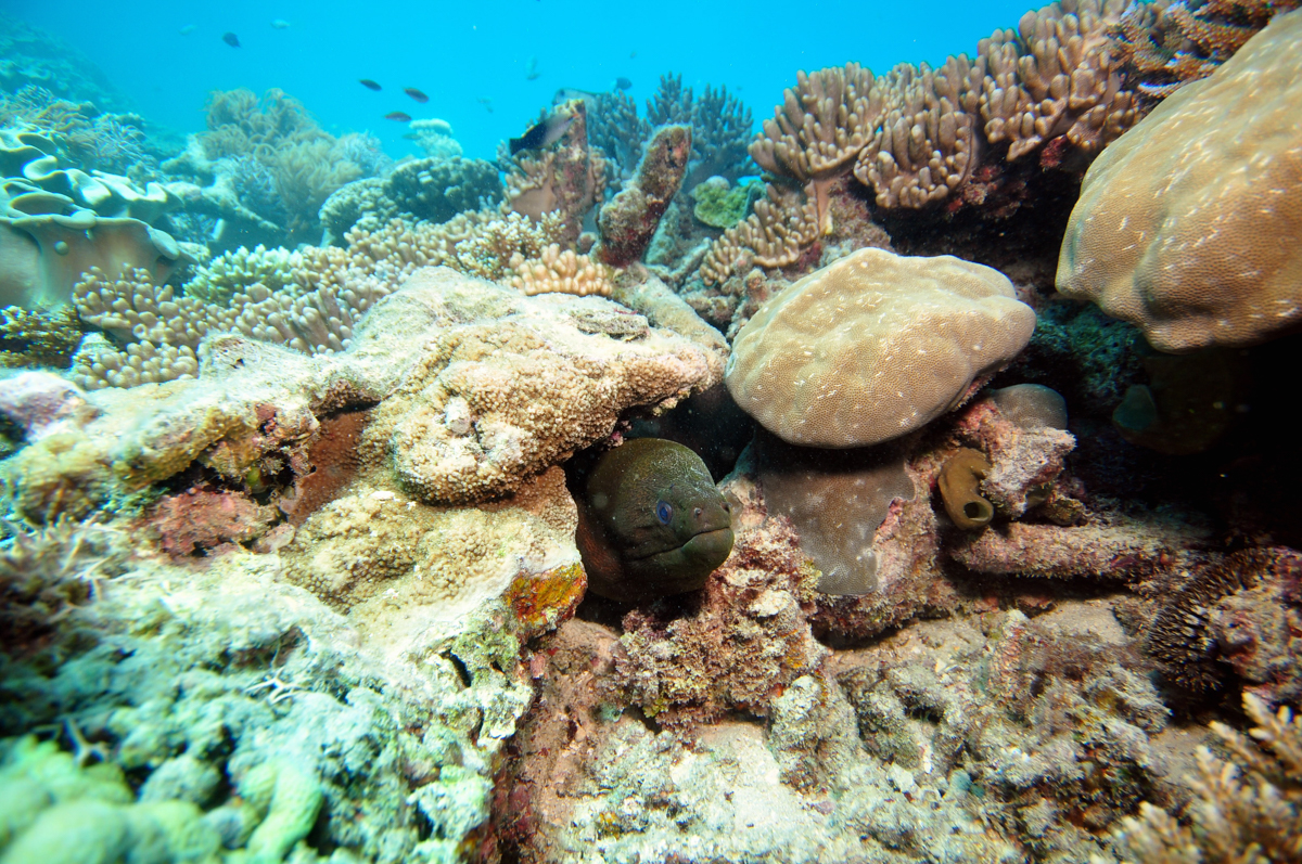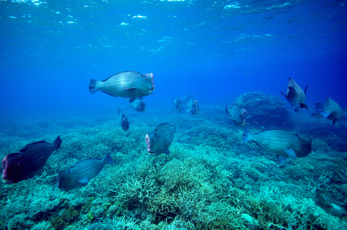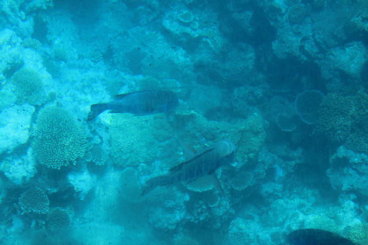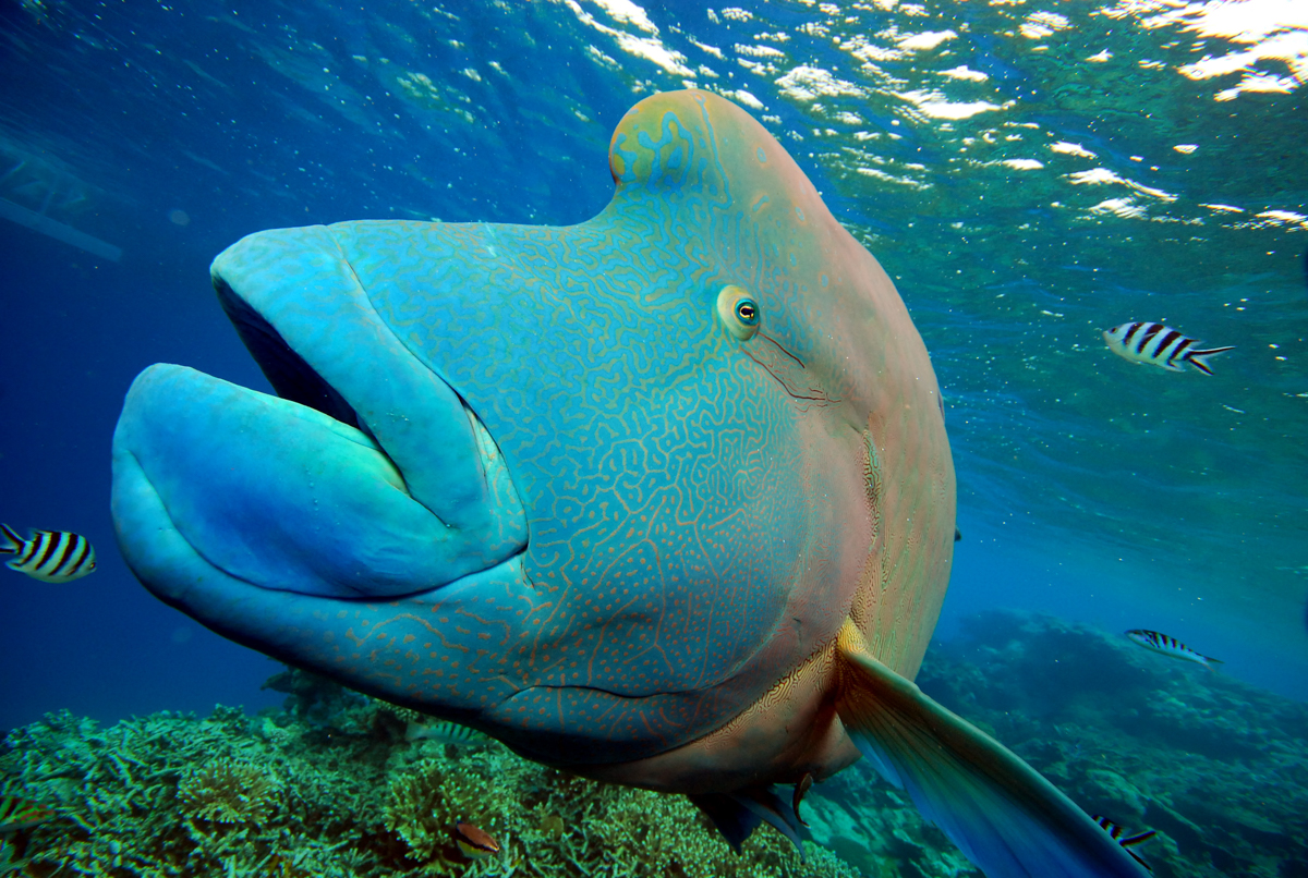 이곳에서 유명한 물고기 중 하나가 Humphead Maori Wrasse라는 종류인데 snorkeling울 시작하는 platform에서 먹이를 주니까 Wally라고 불리우는 녀석이 어디선가 와서는 사람을 겁내지도 않고 유유히 헤엄치며 강아지 같이 사람들의 다리에 몸통을 비비기도 한다. 이 물고기는 약 30년 정도를 사는데 앞이마에 혹같이 튀어나온 부분과 두툼한 입술이 특징이다.