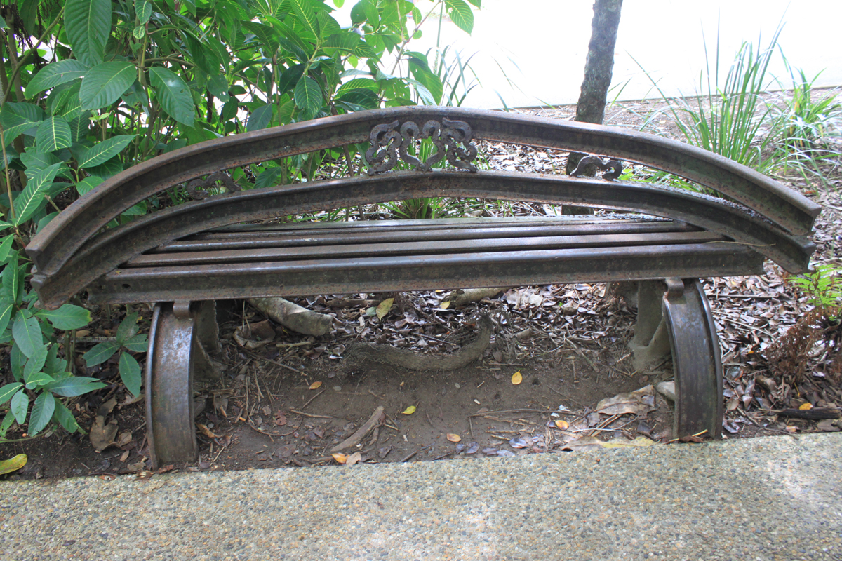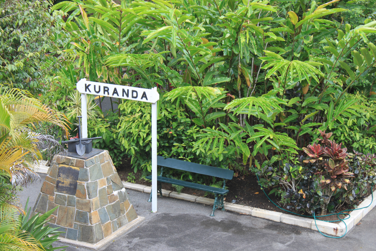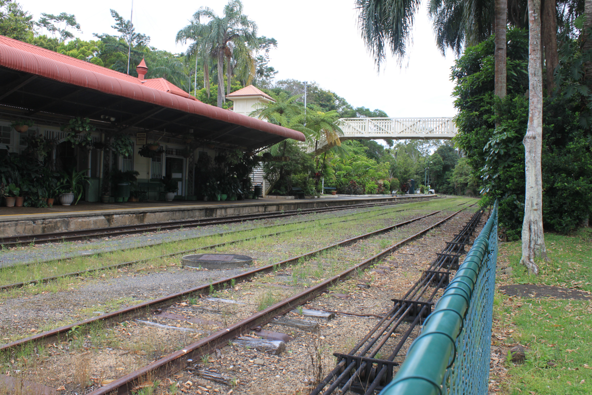 Skyrail 쿠란다 역 바로 옆에 있는 기차역, 철로와 기차바퀴로 만든 벤치.