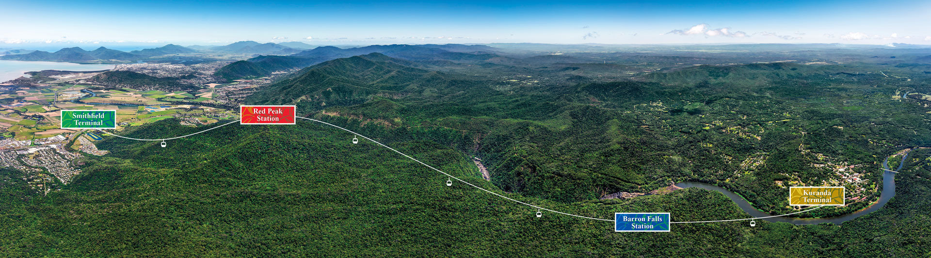Skyrail은 총 4.7 mi(7.5 Km)이며 3개의 독립된 케이블카로 구성되어 있다. 따라서 중간에 2개의 정거장이 있어 내려서 갈아타야 하며 또한 산책도 하고 경관을 볼 수 있다. 아래의 사진지도를 참고로 왼쪽의 초록색 표시가 스미스필드에 있는 출발역이고 오른쪽의 금색 표시가 쿠란다 종착역이다. 여기서 방향은 지도와는 반대로 왼쪽이 동쪽. 출발역에서 빨간역(Read Peak Station)까지 약 10분, 빨간역에서 푸른역(Barron Falls Station)까지 약 14분, 푸른역에서 쿠란다까지 약 8분 정도가 소요되어 총 32분 정도가 걸린다. 그러나 중간 역에서 내려 얼마만큼 산책을 즐기느냐에 따라 총 소요시간이 결정된다. 나중에 알았는데 AU$12 만 더 내면 바닥이 유리로 된 Diamond View gondola를 탈 수 있었는데 케언스에서 일일관광으로 왔더니 아쉽게도 그런 선택의 여지가 없었다. 사진지도 출처: skyrail.com.au