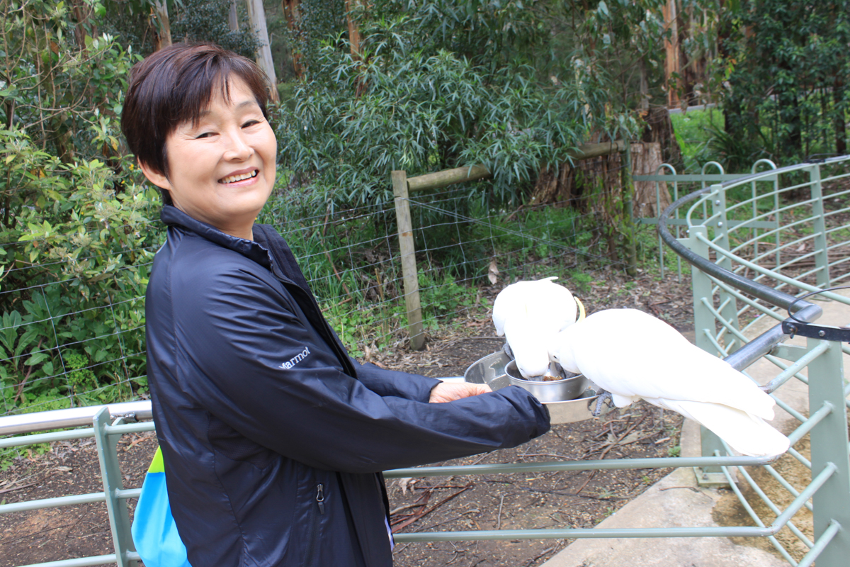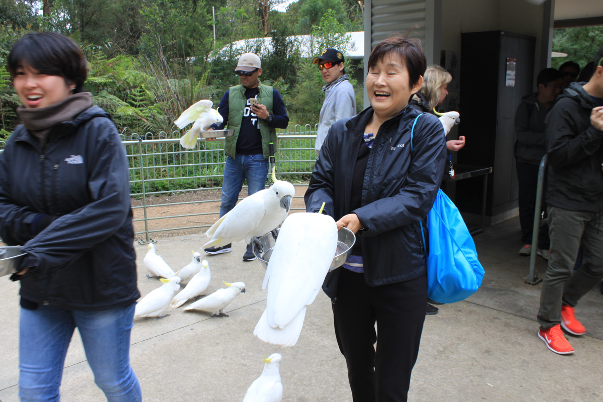 Belgrave 역에서 약 3 mi(4.8 Km) 정도 북쪽으로 가면 인구 1,000명 남짓한 Kallista(칼리스타)라는 아주 작은 마을이 나온다. 그 마을에 있는 Grant’s Picnic Ground는 바비큐 틀과 피크닉 테이블을 갖춘 피크닉 장소는 물론 있고, 작은 식당, 기념품 가게, 그리고 야생 새들에게 모이를 줄 수 있는 시설이 있다. 지나가는 차량으로부터 관광객들을 보호하기 위해서 새먹이는 울타리가 있는 뜰 안에서만 주게 되어 있다. 앵무새의 일종인 Sulphur-crested Cockatoo는 인근의 새 중에 과감하고 힘도 세고 숫자도 많아서 얘네들이 몰려들면 다른 새들은 멀리서 눈치만 본다. 모이통을 내미는 순간 두 마리가 한꺼번에 날라 달려들어 화들짝 놀랐는데 곧 진정된 모습. 이 새들은 사람들을 무서워하지 않고 손에 앉기를 서슴지 않는데 발톱이 날카로워 조심하라는 주의.