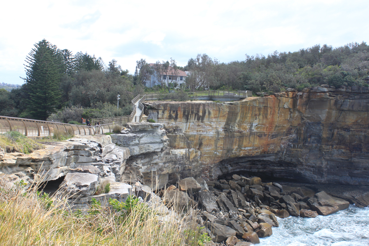 Gap Bluff를 따라 있는 산책길의 바위와 그 사이로 보이는 자살 방지용 철책.