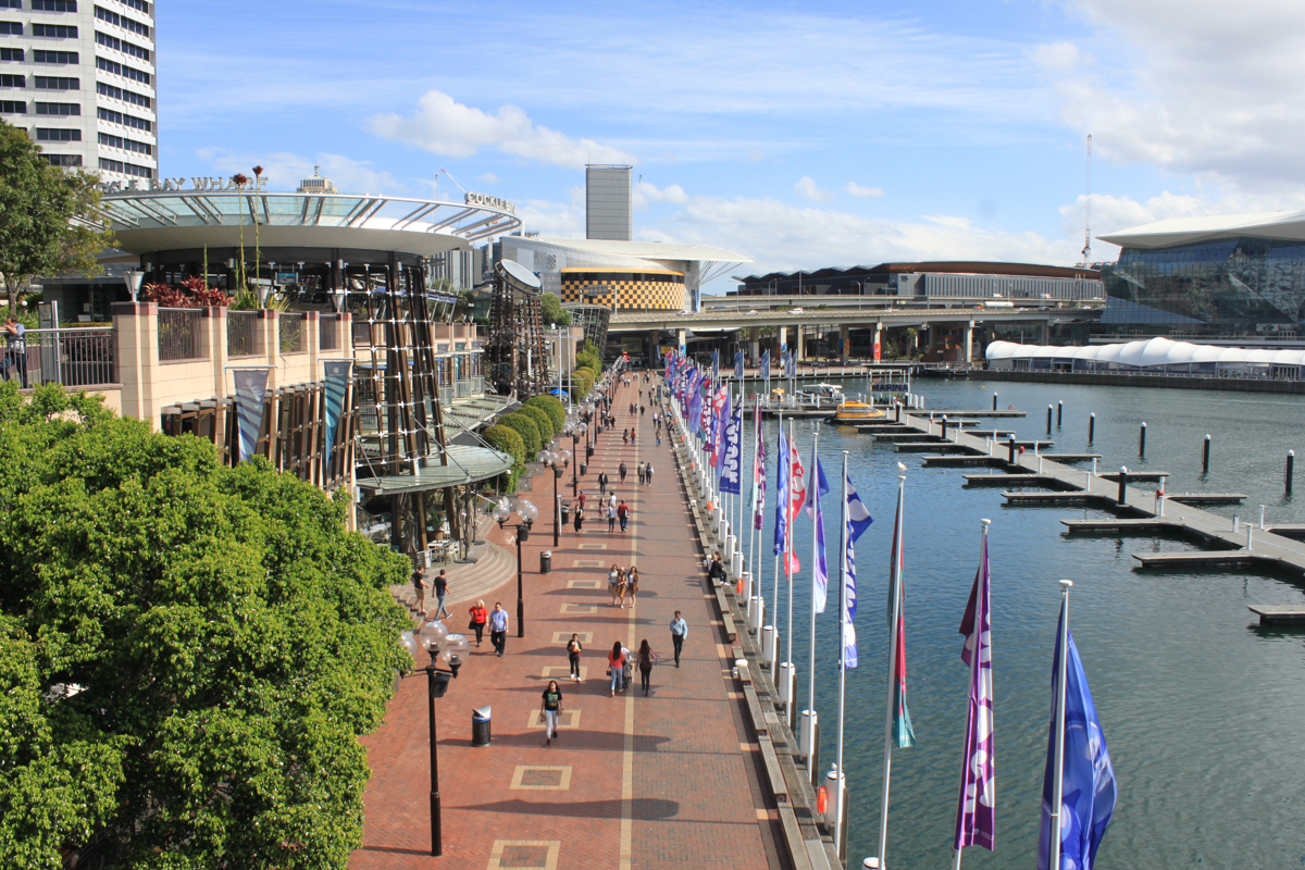 관광객들이 시드니 오페라 하우스를 보는 데는 배를 타고 바다 쪽에서, 직접 가서 외부를, 그리고 내부를 자세히 보는 안내관광 등 여러 가지가 있다. 시간이 있으면 내부도 보고 연주회도 가고 싶지만 우리는 일단 Harbor Cruise를 하기로 했다. 배 타는 곳에서 가까운 Pyrmont Bridge에서 본 Darling Harbor의 일부.