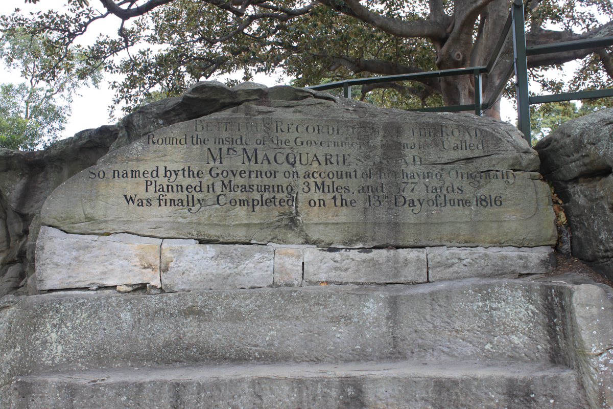 오페라 하우스에서 시내 쪽으로 나오다 왼편으로 가면 Royal Botanic Garden이 있다. 이 정원을 끼고 조그마한 만이 있는데, 바닷가를 따라 나 있는 길을 죽 걸어가면 작은 반도의 끝에 Mrs. Macquarie’s Chair가 나온다. Lady Macquarie’s Chair라고 불리기도 하는 이 의자는 1810년에 그 곳에 있는 사암을 깎아서 만든 것이다. 영국에서 New South Wales로 파견된 마지막 총독 Lachlan Macquarie의 부인인 Elizabeth를 위해서 만들어진 이 벤치, 여기에 이르는 길, 또한 이 작은 반도 끝의 이름 모두가 Mrs. Macquarie’s로 시작하여 Chair, Road, Point로 끝나니 당시 총독 부인의 위세가 대단했음을 느끼게 해 준다. 아니면 총독의 부인을 사랑하는 마음이 극진했다고 할까? 총독 부인은 이 의자에 앉아서 영국으로부터 온 배가 항구를 드나드는 모습 및 주위의 경치를 즐겼다고 한다. 의자 위쪽에 있는 바위에는 1816년 6월 13일에 길이 3 mile 377 yard의 Mrs. Macquarie’s Road를 완공했다고 새겨져 있다.