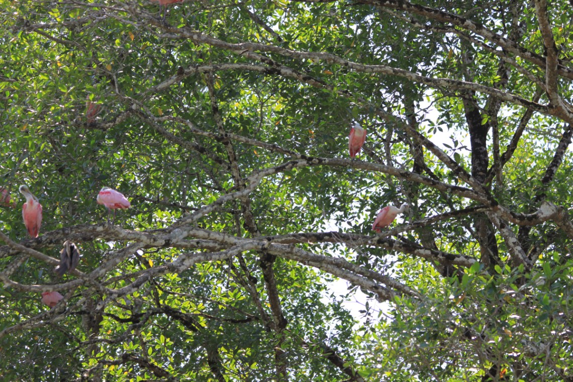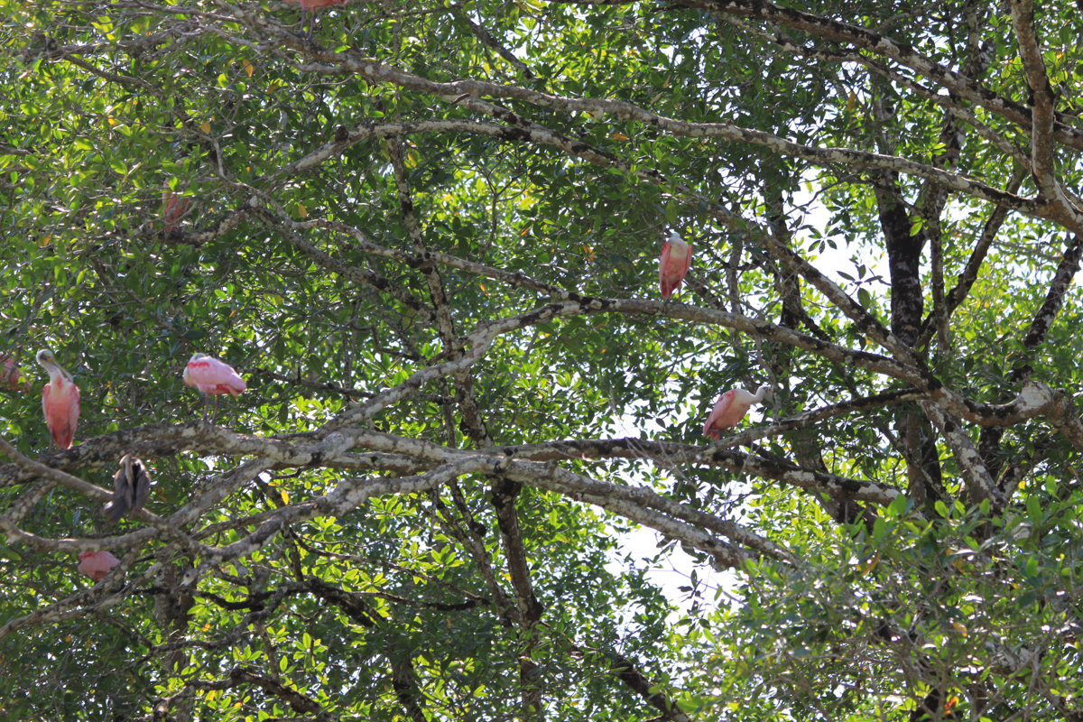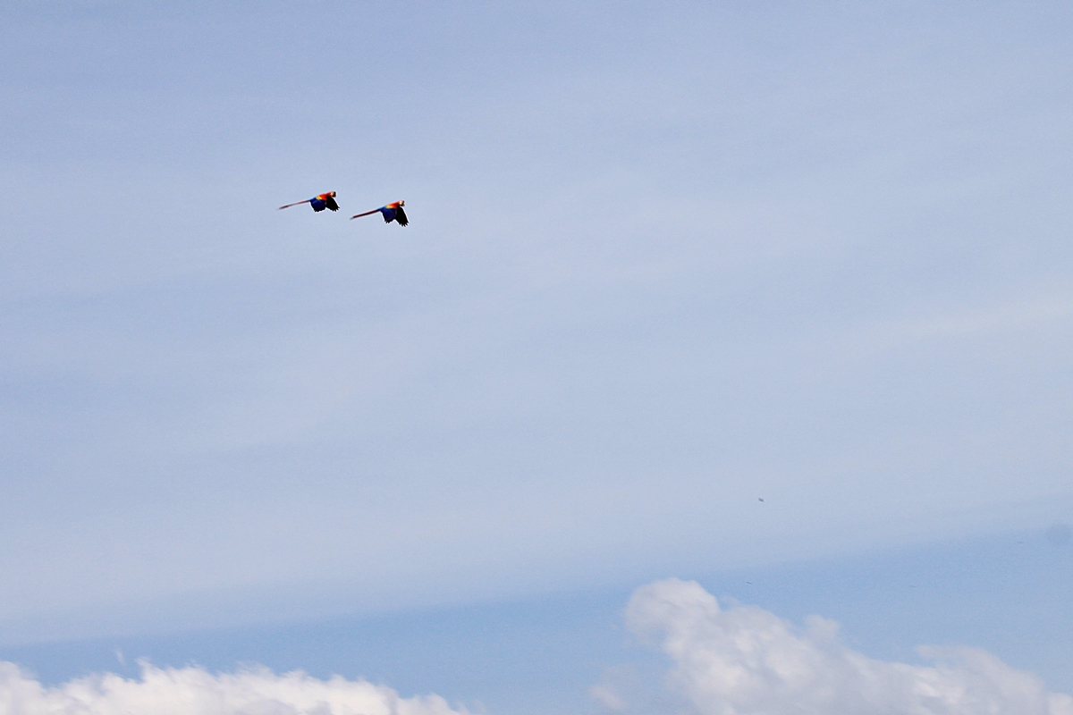 진홍마꼬앵무 (Scarlet Macaw) 한번 쌍을 맺으면 평생을 같이 한다는 앵무새. 마침 쌍으로 나르는 이 앵무새를 발견하여 아주 재수가 좋았다는 가이드의 말. 멀리서 보니 꼭 전투기 두대가 대오를 맞추어 비행하는 것 같다. 집에서 기르면 사람의 말을 잘 흉내 낸다고 한다.