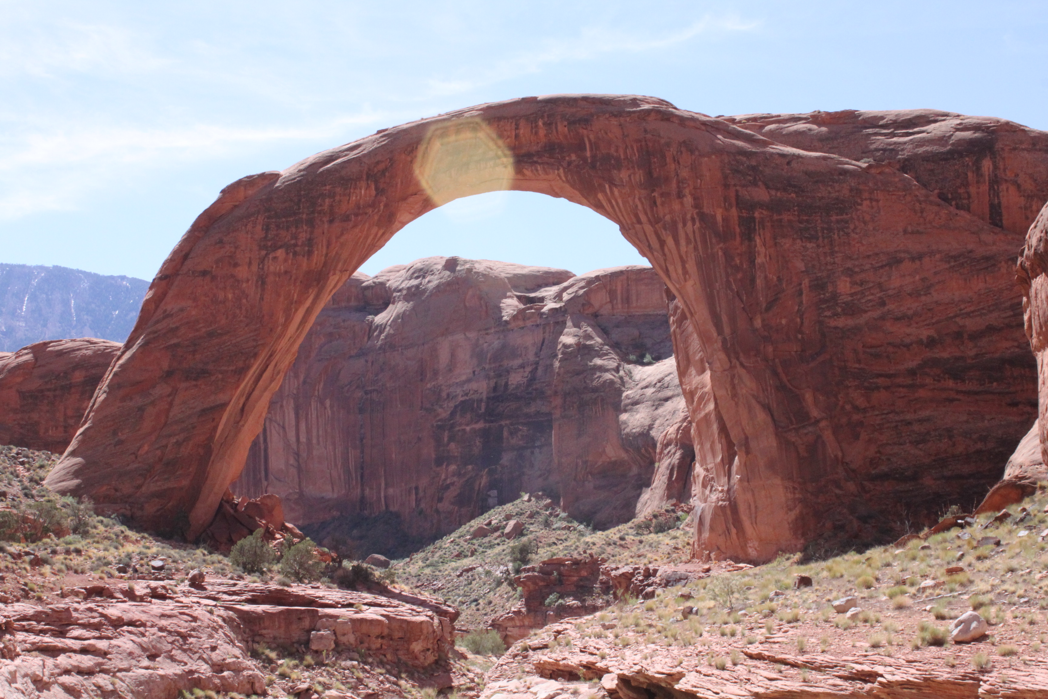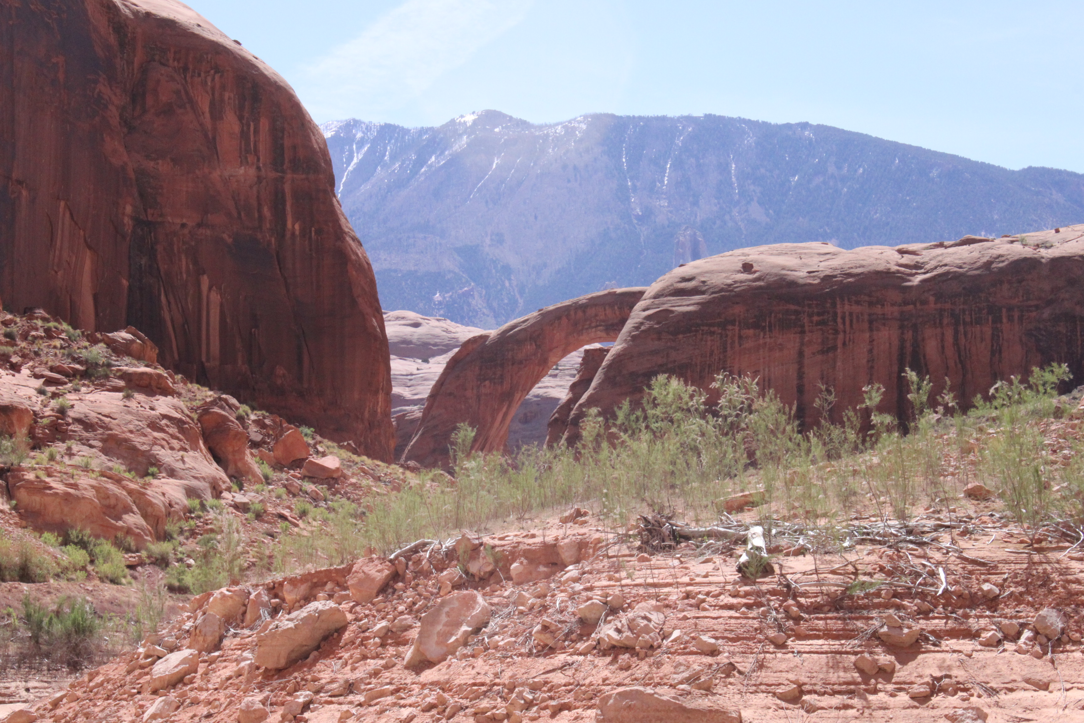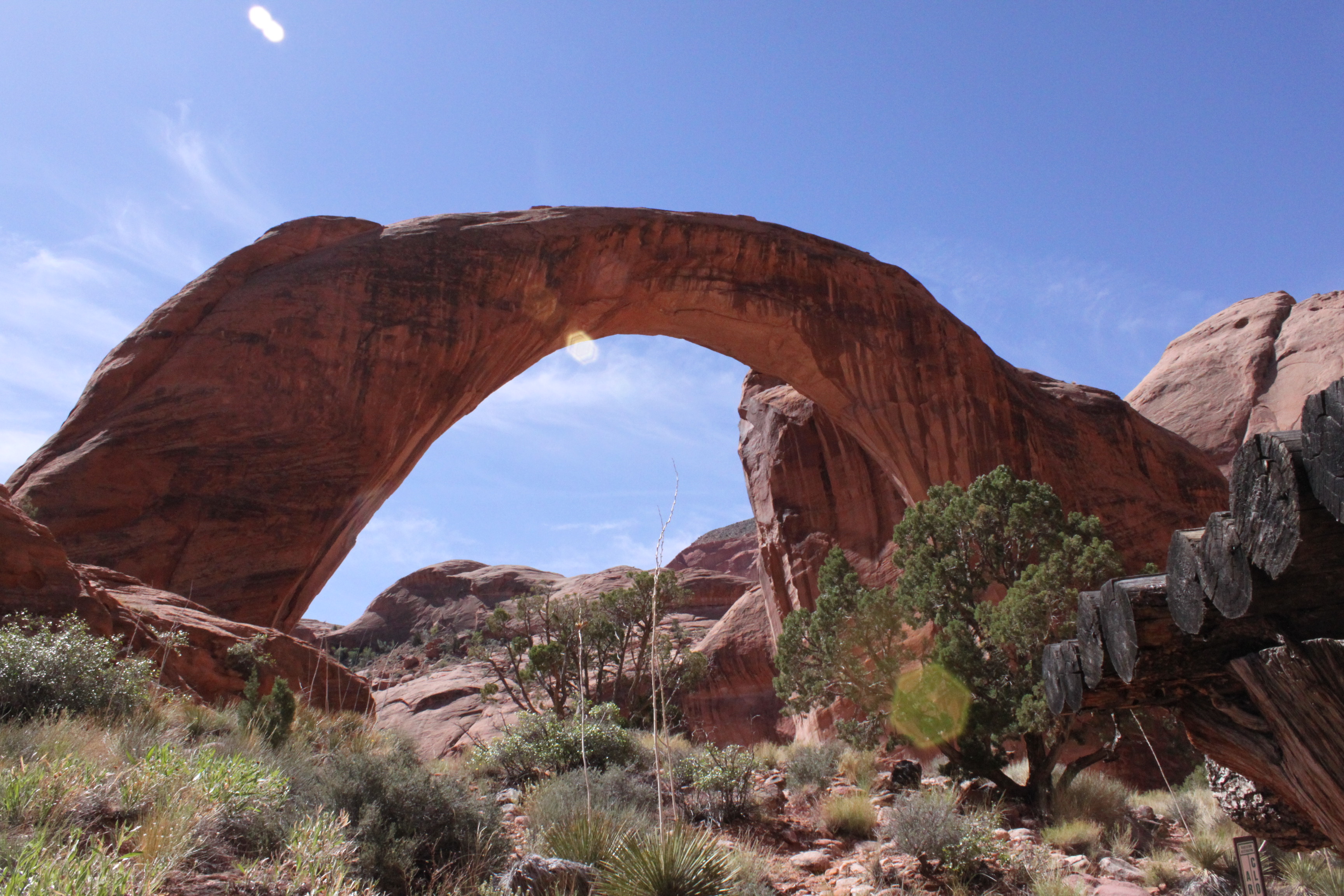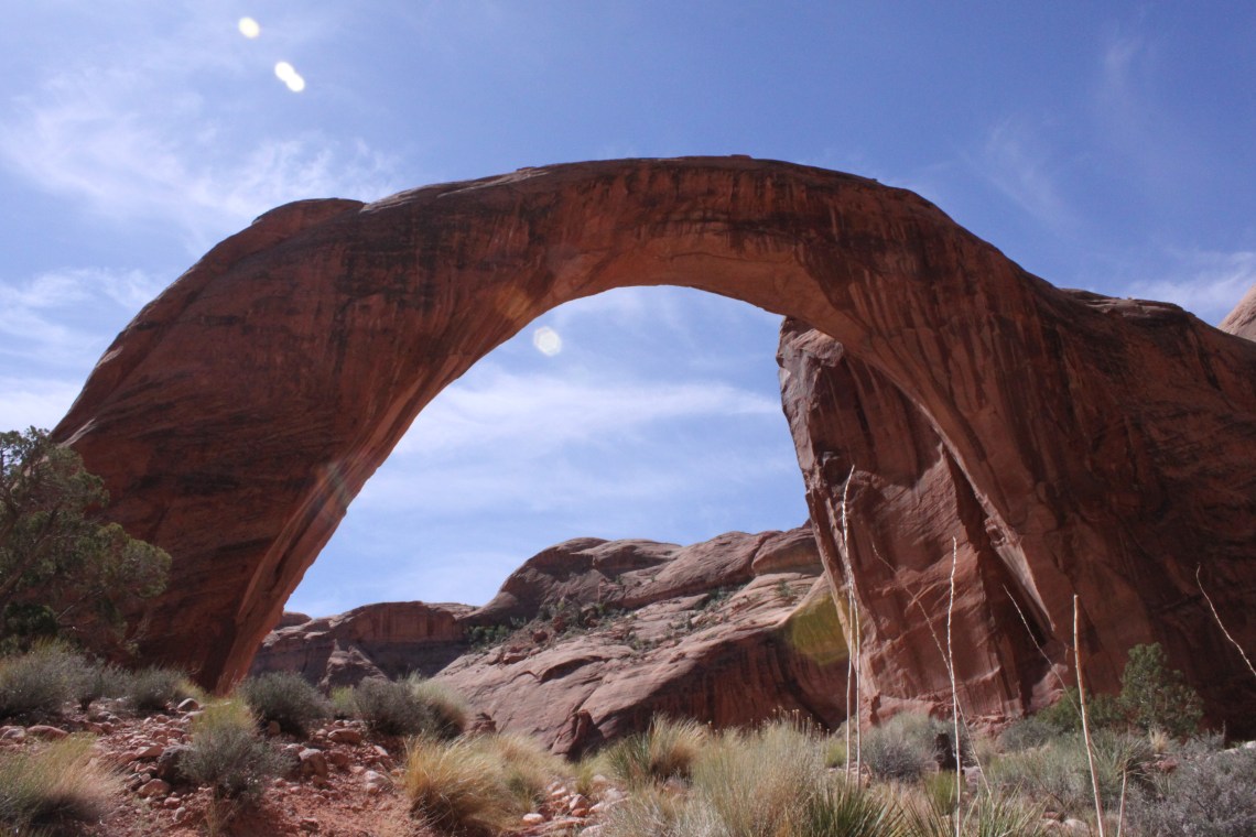 계곡 속에 있는 간이 선착장에 도착하여 약 20분 정도 걸어 비로소 Rainbow Bridge에 도착했다. 호수의 수위에 따라 선착장을 옮기기 때문에 걷는 거리가 달라지는데 길게는 45분에서 짧게는 10분 정도까지 바뀐다 한다. Rainbow Bridge는 가장 높은 곳이 지면(수면)으로부터 290 feet, 밑 부분의 폭이 275 feet로 자연적으로 형성된 다리로는 세계에서 가장 큰 규모이다. 이 지역에 살던 Navajo 족들이 신성시 했던 유적으로 오르거나 밑으로 지나가는 것이 금지되어 있다.