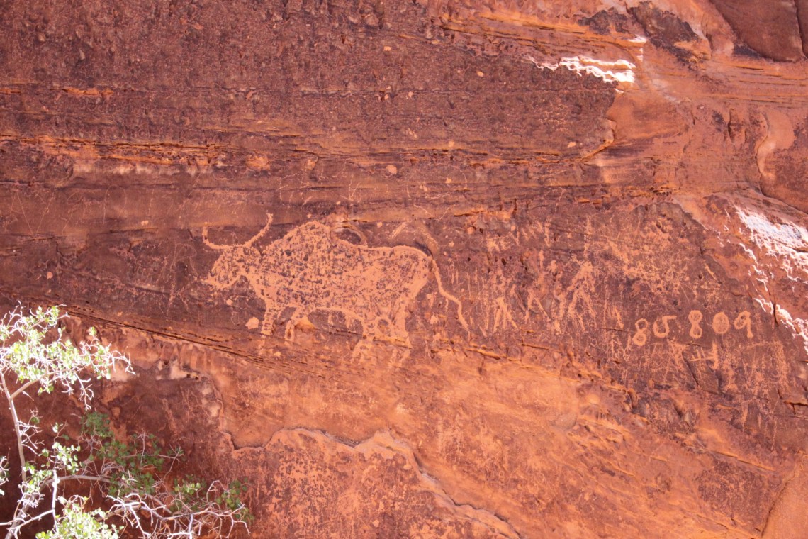 바위에 새겨진 나바호 원주민의 소 그림과 관광객이 판 것으로 추정되는 낙서