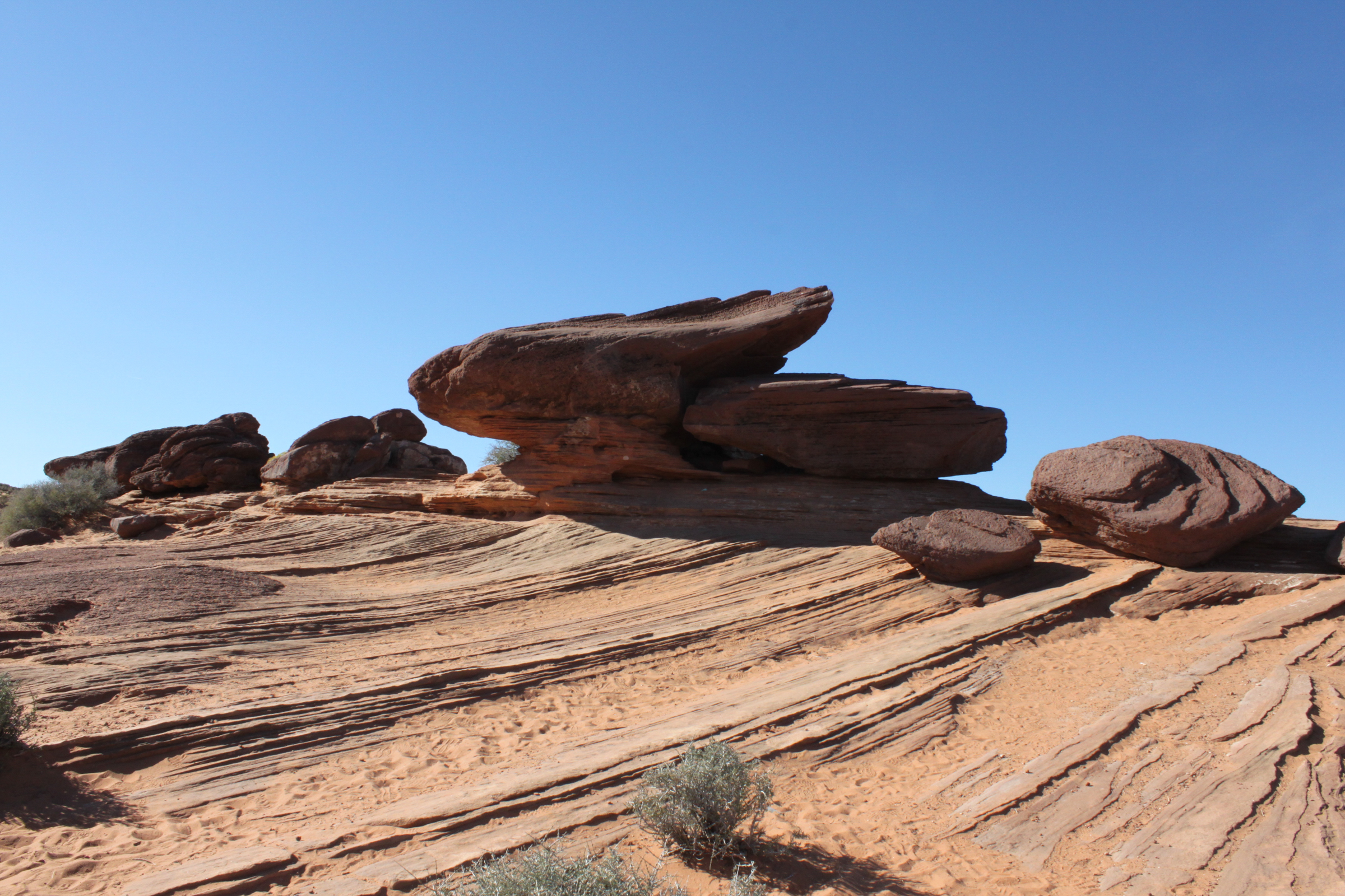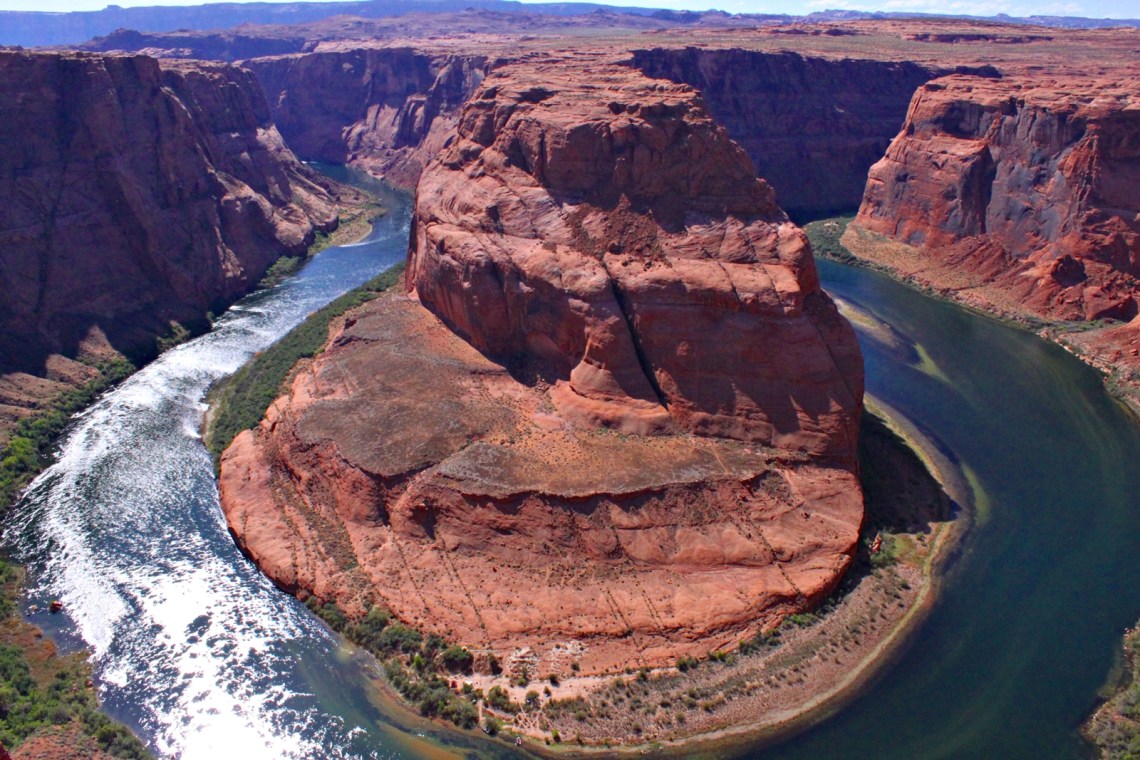Horseshoe Bend는 약 1,000 ft (약 300 m) 절벽 아래로 내려다 보게 된다. 참고로 전망대는 해발 4,200 ft (1,300 m) 이고 밑에 흐르는 콜로라도 강은 해발 3,200 ft (980 m)에 있다. 사진은 아침 일찍 가면 그늘이 지기 때문에 해가 올라온 낮에 가는 것이 좋다. 바쁘게 찍다 보니 앞쪽으로 강을 다 담지 못해서 아쉬운 사진이 되었다.