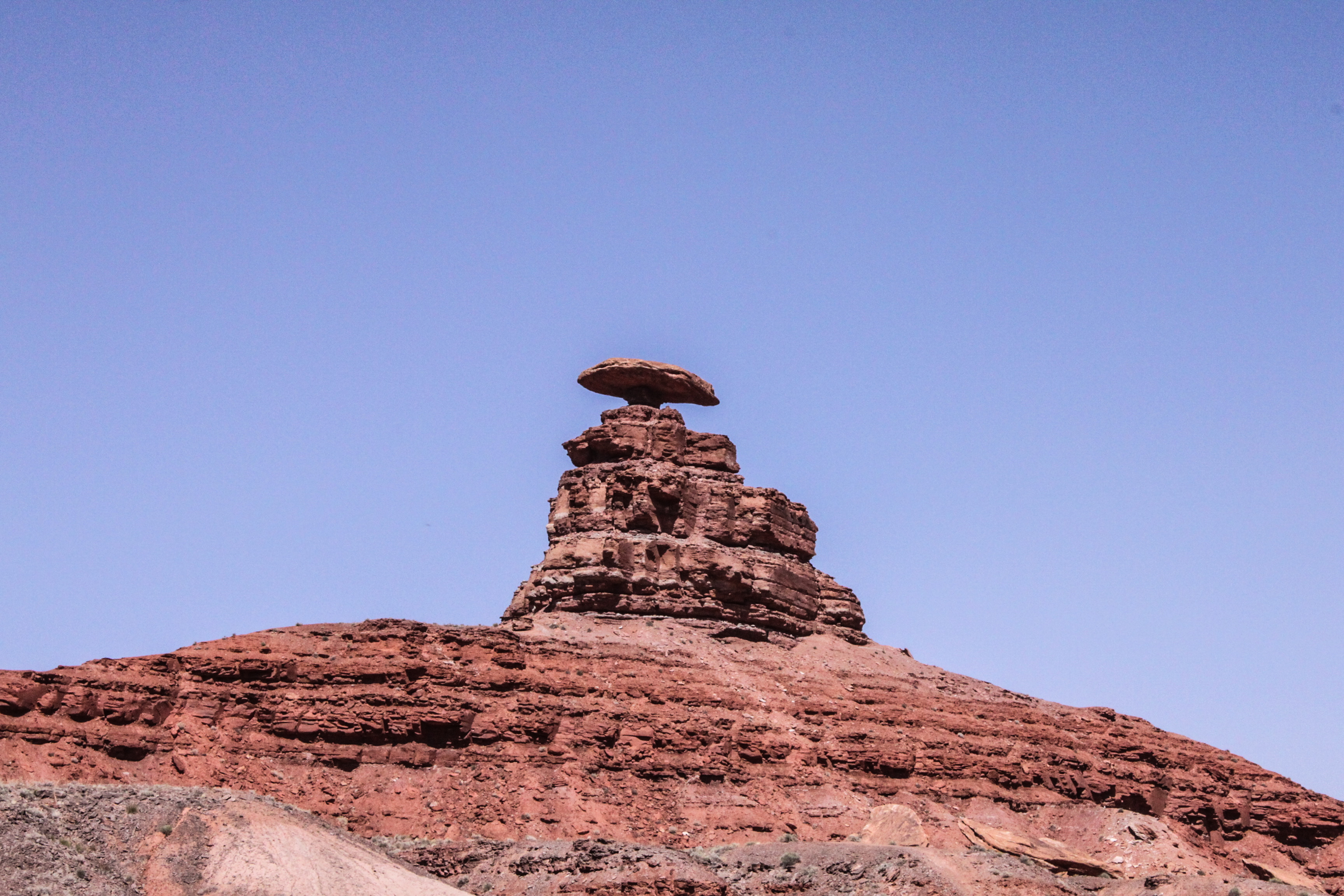 Monument Valley에서 US-163을 타고 북 쪽으로 약 22 mi (35 Km) 정도 가면 Mexican Hat이라는 작은 마을이 나온다. 여기서 약 2 mi 정도 더 가면 오른쪽으로 Mexican Hat Rock Road라는 비포장 도로가 있다. 이리로 좀 가면 길이 두 갈래로 갈라지는데 오른쪽으로 들어서면 Mexican Hat Rock이 왼쪽에 나타난다. 돌산 위에 바위가 있고 그 위에 조그만 바위, 또 그 위에 넙적한 큰 바위가 있어서 멀리서 보면 멕시코 사람들이 쓰는 챙이 넓은 sombrero와 비슷하다고 해서 부쳐진 이름이다. 여기까지는 비포장도로지만 보통 차로 갈만한데 바위 근처까지 가는 길은 험해서 4 wheel drive truck이 아니면 힘들게 생겼다. 멀리서 사진 한 장 찍고 나왔는데 여기서도 암벽등반을 한단다.