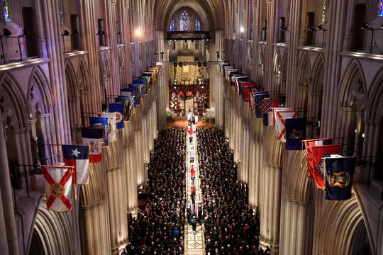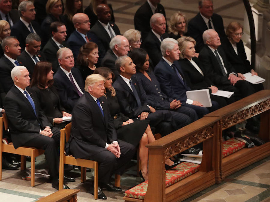 모든 장례예식은 의전에 맞추어 질서정연하고 엄숙하게 진행되었는데 가장 내 눈길을 끈 것은 생존해 있는 전, 현직 대통령 5명(Carter, Clinton, 아들 Bush, Obama, Trump) 모두가 참석했다는 사실이다. 이념이 다르고 정책이 달라 서로 헐뜯는 말들도 했지만 한 마음으로 고인이 된 대통령을 추모하는 모습에 역시 미국이라는 생각이 들었다. 물론 막말하기로 눈총을 받는 트럼프 대통령이 좀 머쓱해서 앉아 있었지만 말이다. 아들 부시는 가족석에 있어 아래 사진에는 안 나왔다.