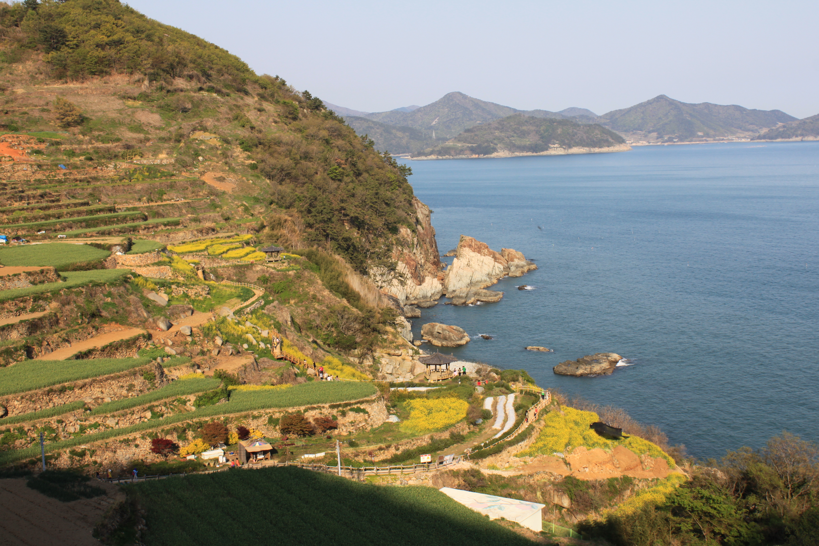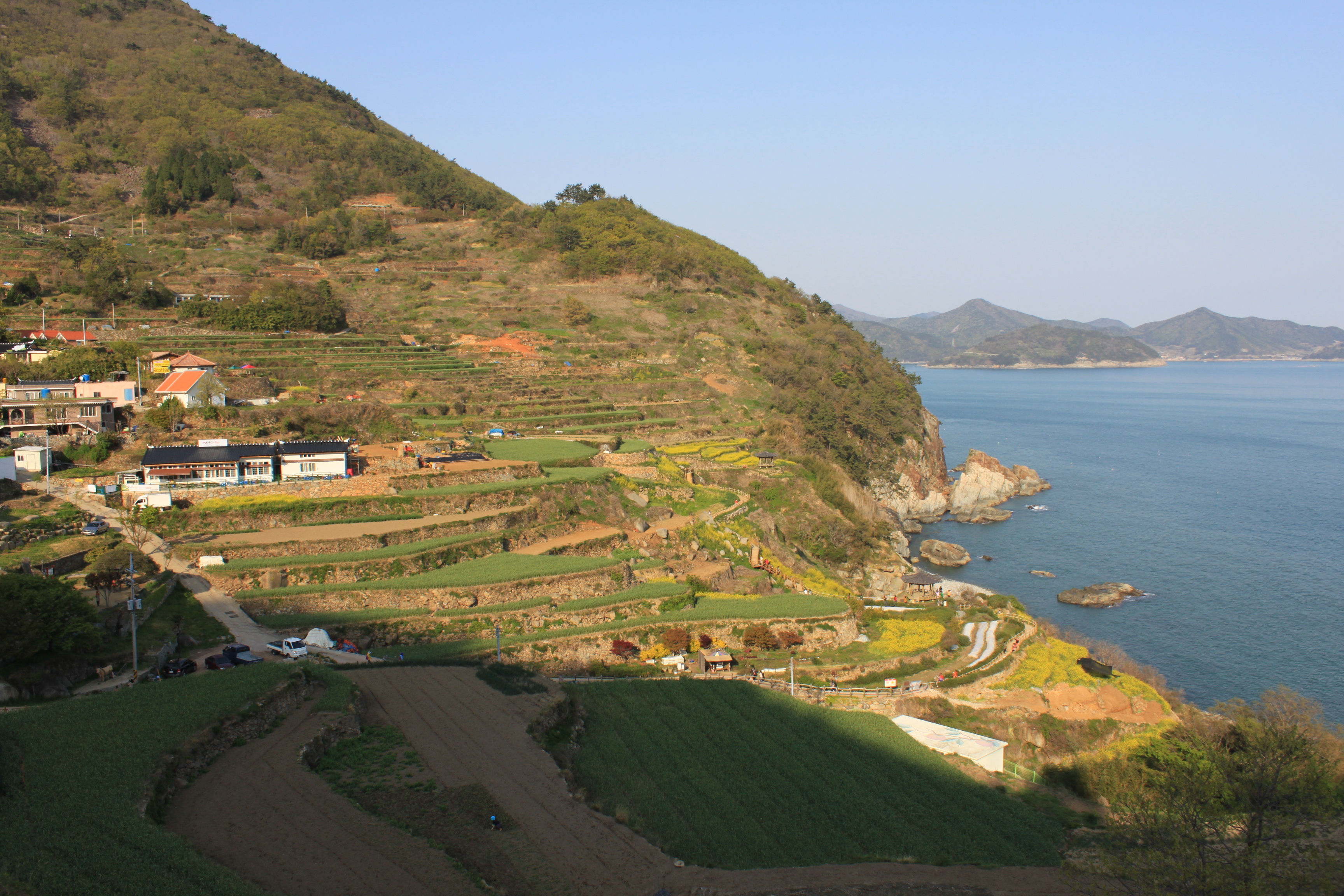보리암에서 서쪽으로 약 13 mile(22 Km) 떨어진 가천마을 다랭이 논은 국가 명승 15호로 지정되어 있는 아름다운 곳이다. 우선 다랭이라는 단어가 생소하여 찾아보니 비탈진 산골짜기에 여러 층으로 겹겹이 만든 좁고 작은 논을 뜻하는 다랑이의 사투리라고 되어 있다. 여하간 가천마을 다랭이 논의 아름다운 정경 뒤에는 자투리 땅도 소중히 활용한 농민들의 억척스러움과 근면함이 숨겨져 있다. 이런 계단식은 대개 차나무를 키우는 밭이 많은데, 이곳은 물을 대야 하는 논이라는 점에 더 눈길이 간다. 동남아와 같이 비가 많이 오는 지역에는 다랭이 논이 흔하지만 … 45도 급경사 산등성이에 108층 680여개의 곡선형의 논이 형성되어 있다는 정보에 놀랄 따름이다.
