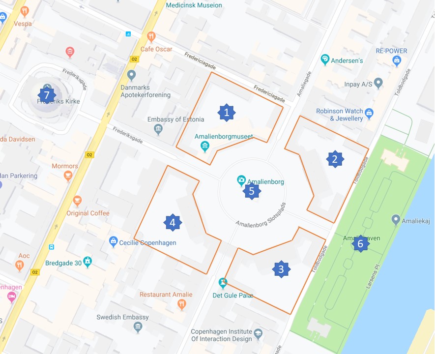 게피온 분수에서 남쪽으로 난 길 Amaliegade를 따라 10분정도 걸어가면 덴마크 왕족이 거주하는 에멜리엔 궁(Amalienborg)이 나온다.