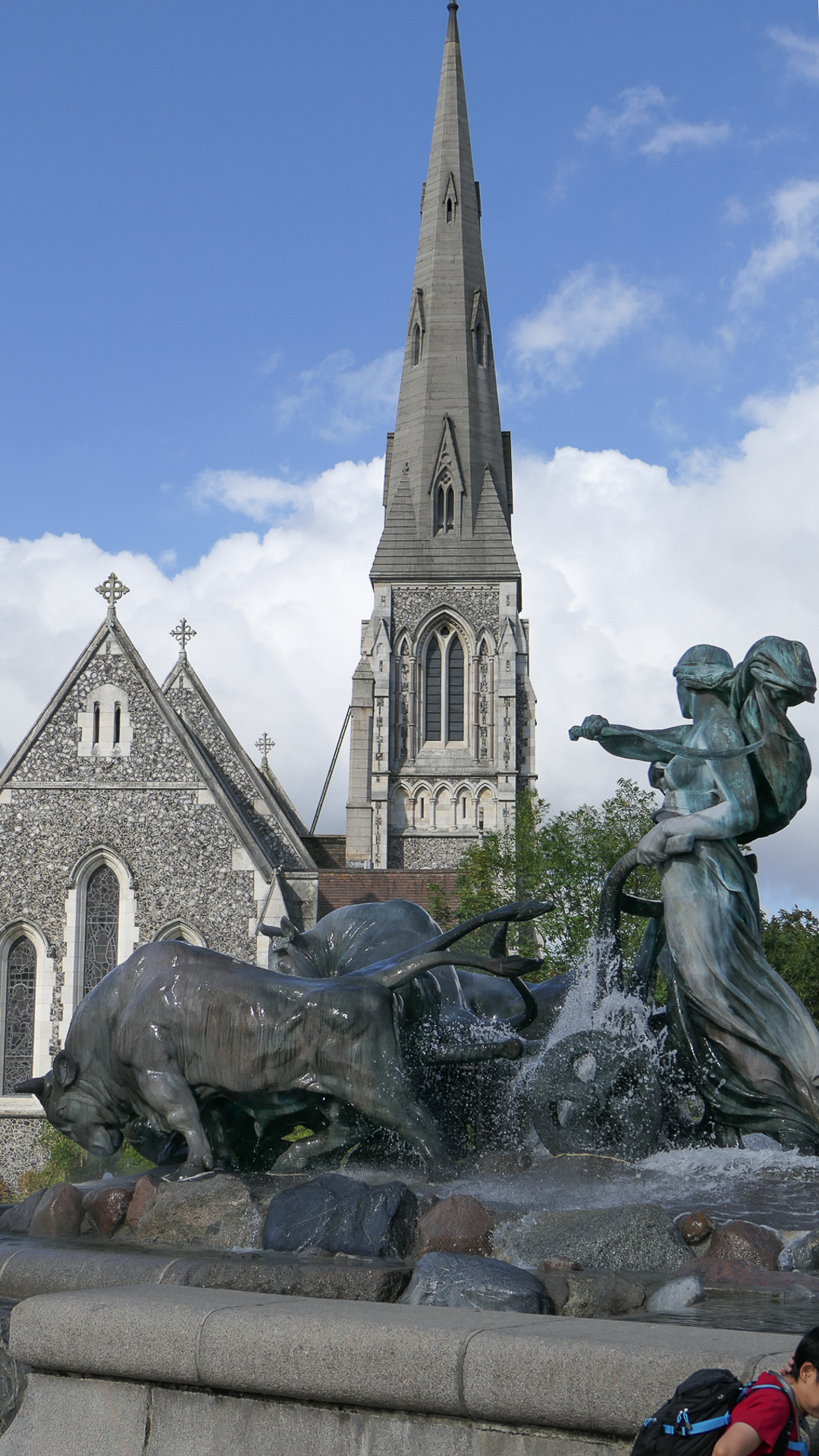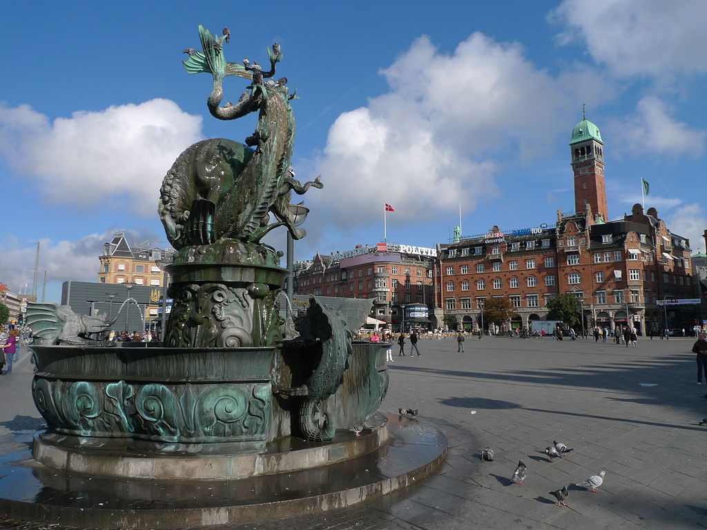 시청광장 남서쪽에 용과 황소가 싸우는 형상을 한 분수가 있다. 1889년 Amager 광장에 설치할 조형물을 공모하였는데 그 때 출품작 중 하나를 선발하여 1904년부터 부분적으로 제작이 시작되었고 1923년에 공개되었다. 그러나 코펜하겐 시가지의 확장 및 개발에 따라 여러 번 자리를 옮기다 2001에 현 위치에 자리를 잡았다. 때마침 중국 단체관광객들이 수도 없이 몰려들어 사진을 찍을 수가 없어 빌려온 사진으로 대신한다.