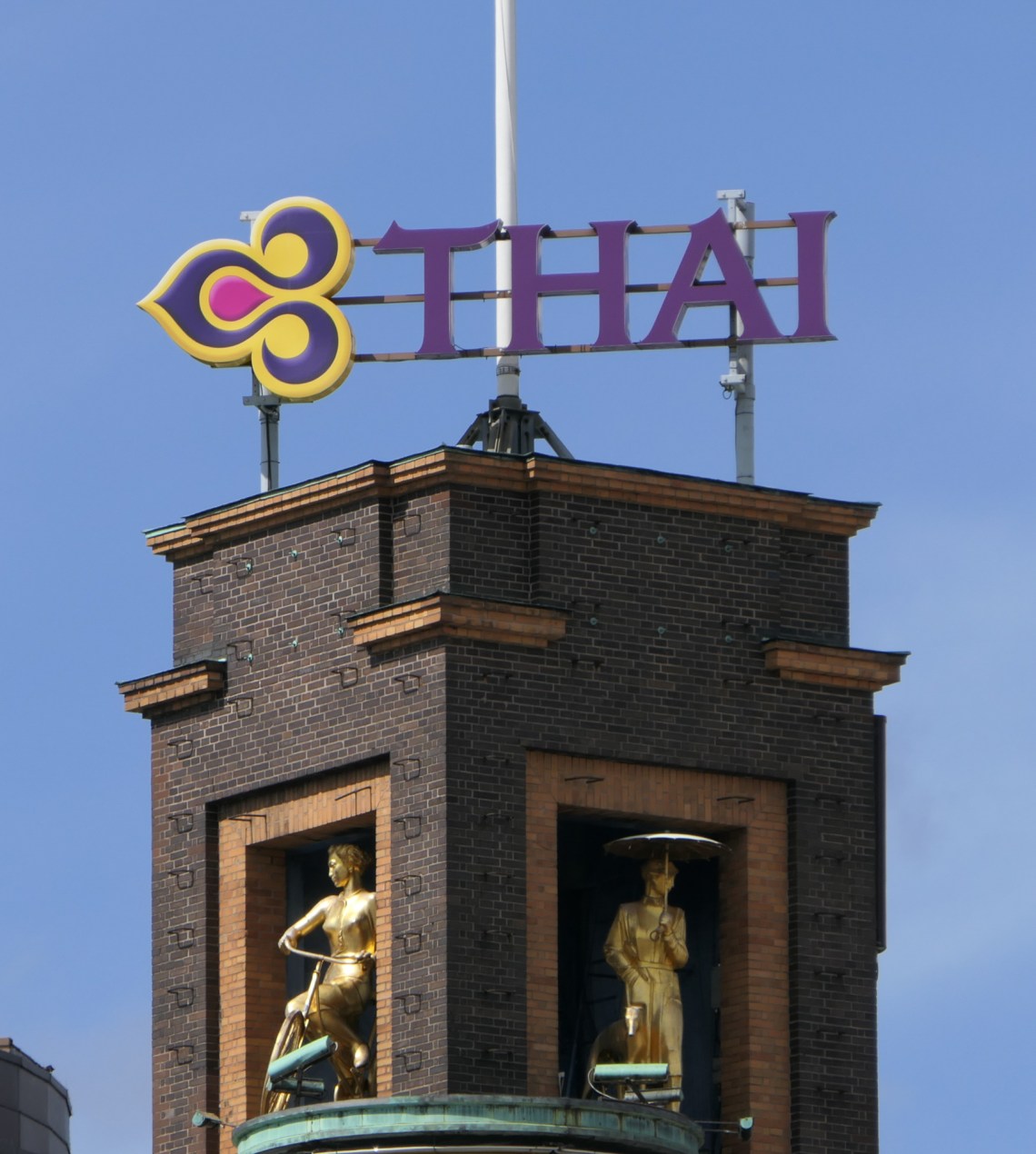 시청광장 서쪽으로 길 건너에 있는 건물 모퉁이에 금도금을 한 2개의 여성상이 있는 나지막한 탑이 있다. 여성상 하나는 자전거를 타고 있고 다른 하나는 우산을 쓰고 강아지를 데리고 걷는 모습이다. 맑은 날에는 자전거 타는, 비가 오는 날에는 우산을 쓴 여성상을 앞으로 내보낸다 하는데, 우리가 간 날은 둘 다 숨어있는 모습이다. 그런 용도로 만들어져 이 여성상을 Vejrpigen(Weather Girl)이라 부른다. 같은 건물에 태국항공 사무실이 있어 탑 위에 크게 광고판이 있다.