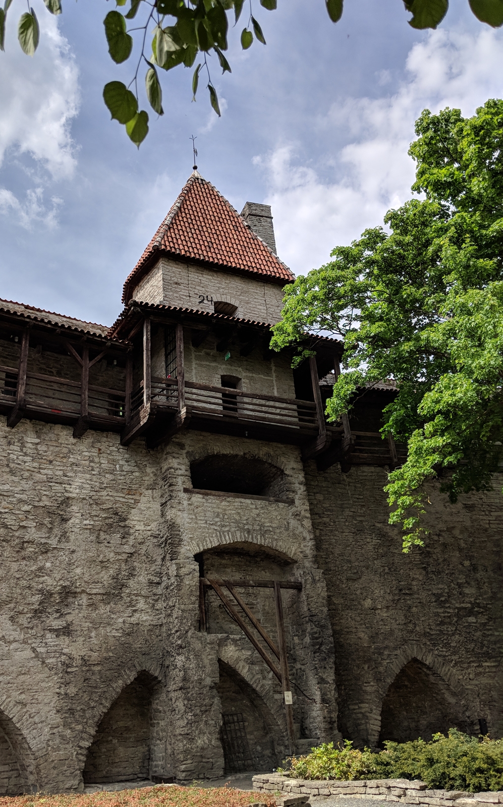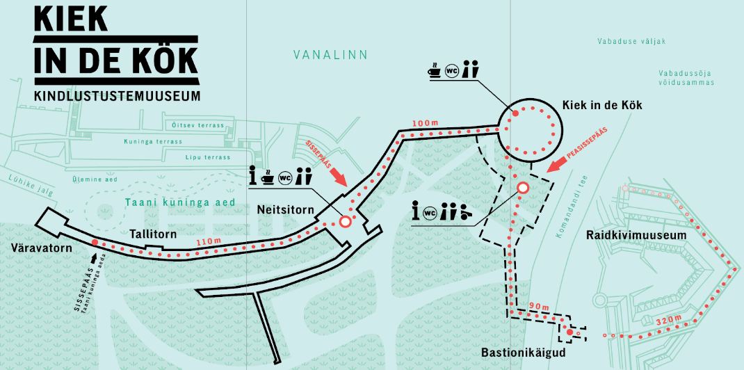 박물관 약도 (Source: https://linnamuuseum.ee/en/kiek-de-kok/visitor-info/)성 안에 있는 Danish King’s Garden에서 본 Town Wall의 일부성 안에서 본 Stable TowerDanish King’s Garden에서 남쪽으로 있는 Town Wall과 Maiden Tower(Neitsitorn). 뒤쪽에 보이는 포탑(砲塔, artillery tower)은 Kiek in de Kök (Peep into the Kitchen)이라는 별명으로 불리우는데 탑에서 이웃의 부엌이 들여다 보인다 하여 그런 별명이 붙여졌다 한다.Danish King’s Garden에서 성 밖에 있는 Alexander Nevsky 성당 쪽으로 나가서 돌아본 성과 그 위로 보이는 Swedish St. Michael’s Church 첨탑