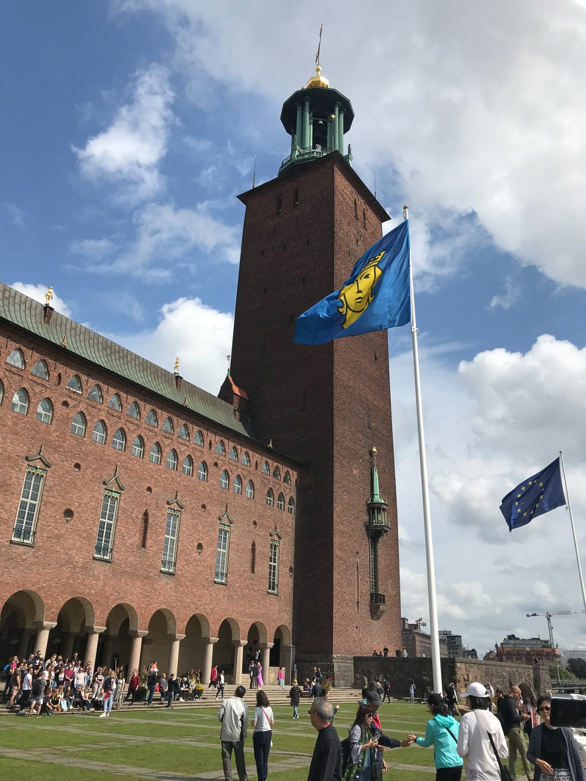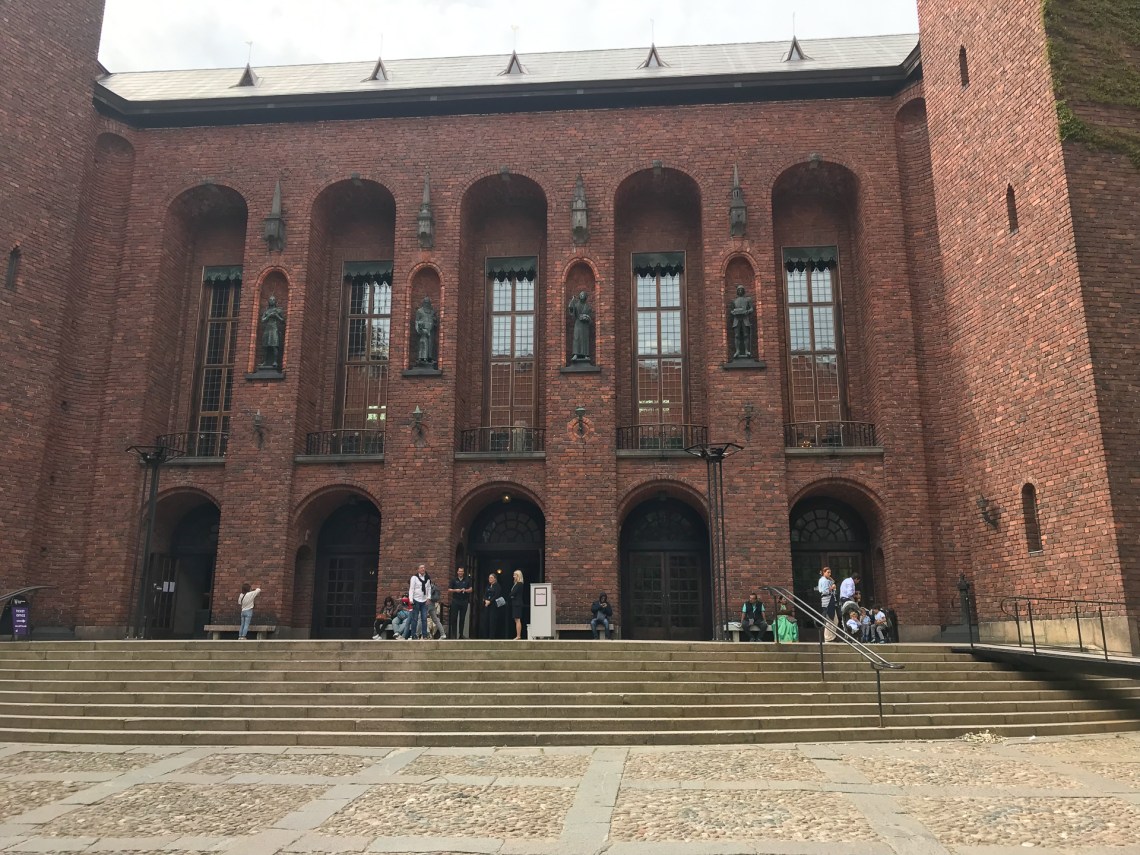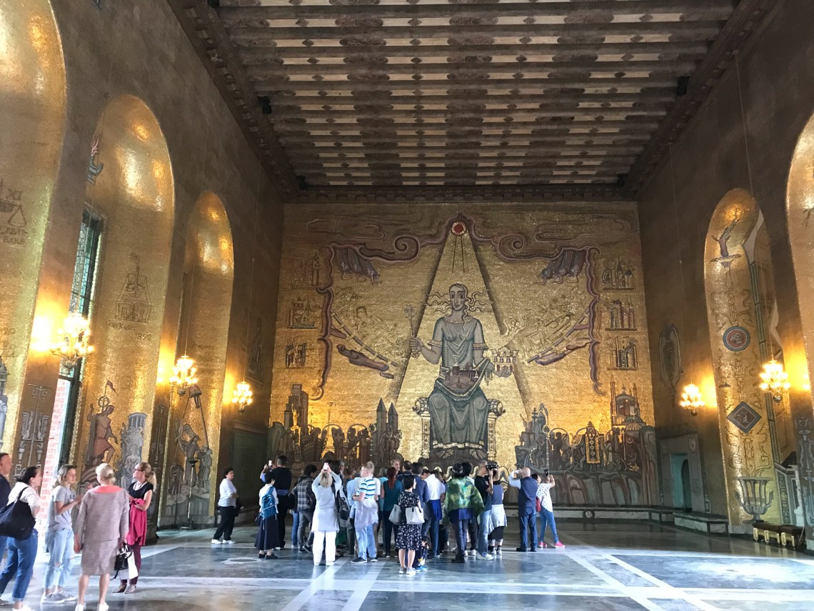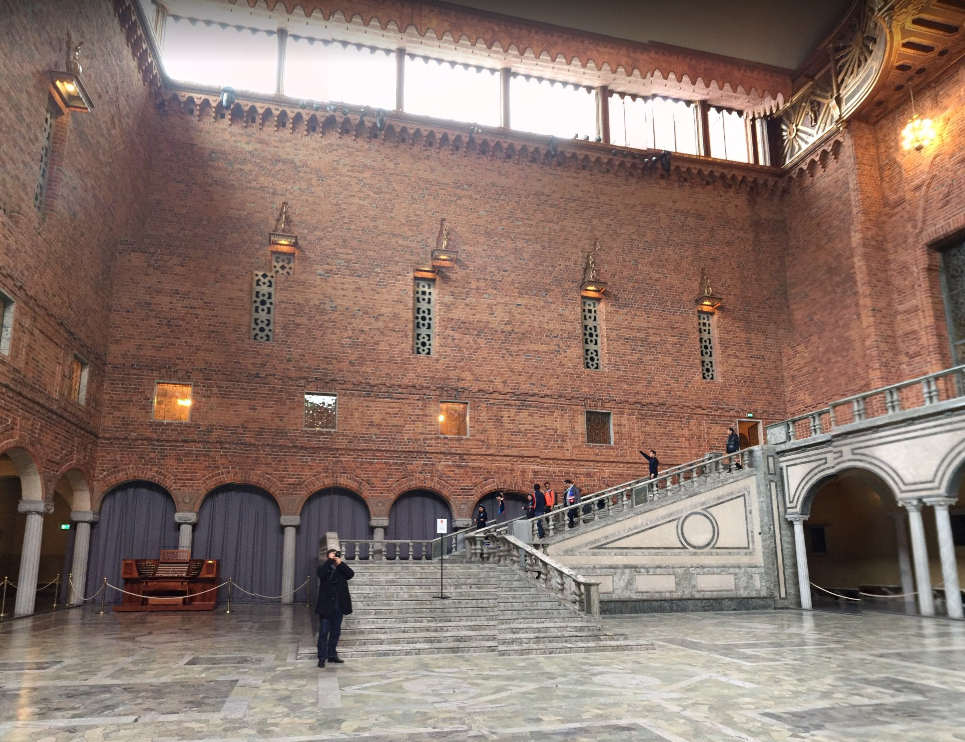 이 Blue Hall은 원래 푸른색 회벽으로 마무리하기로 되었으나 설계자가 건축 중 붉은 벽돌로 자재를 바꾸었지만 그대로 Blue Hall로 불리워지고 있다 한다. 음악당에서 노벨 상 수상식이 있은 후 시청으로 옮겨와 만찬이 열리는 곳이다. 10,000개 이상의 파이프로 구성된 스칸디나비아에서 두번째로 큰 파이프 오르간이 여기에 있다.