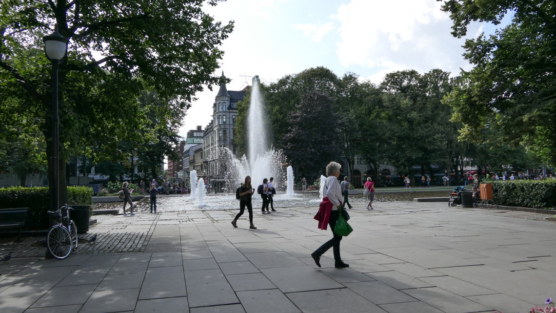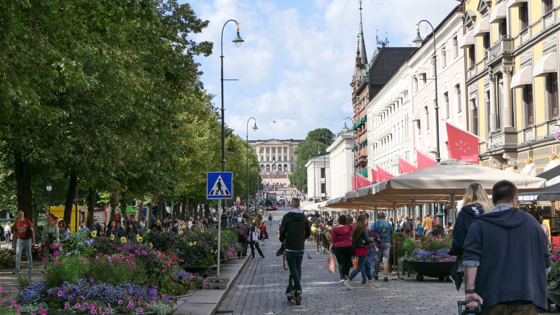 오슬로의 대표적인 번화가로 Karl Johans Gate(Street)을 꼽는다. 19세기 초에 노르웨이 왕이었던 요한 3세(Charles III John, 같은 왕이 스웨덴도 통치했던 요한 14세, Charles XIV John)의 이름으로 지어진 이 길의 북서쪽 끝에는 노르웨이 왕궁(Det Kongelige Slott, The Royal Castle)이 위치해 있다. 오슬로 시청에서 북동쪽으로 약 0.2 mile(320 m) 떨어져 있는 노르웨이 국회의사당(Stortinget)을 지나면 나오는 길이 Karl Johans Gate이다. 여기서 왼쪽으로 돌면 오른쪽에 노천 카페 등을 그리고 왼쪽으로 공원이 있는데 이 부분은 차량통행이 금지 되어있다. 이 길로 조금 가면 왼쪽에 국립극장이 나온다.