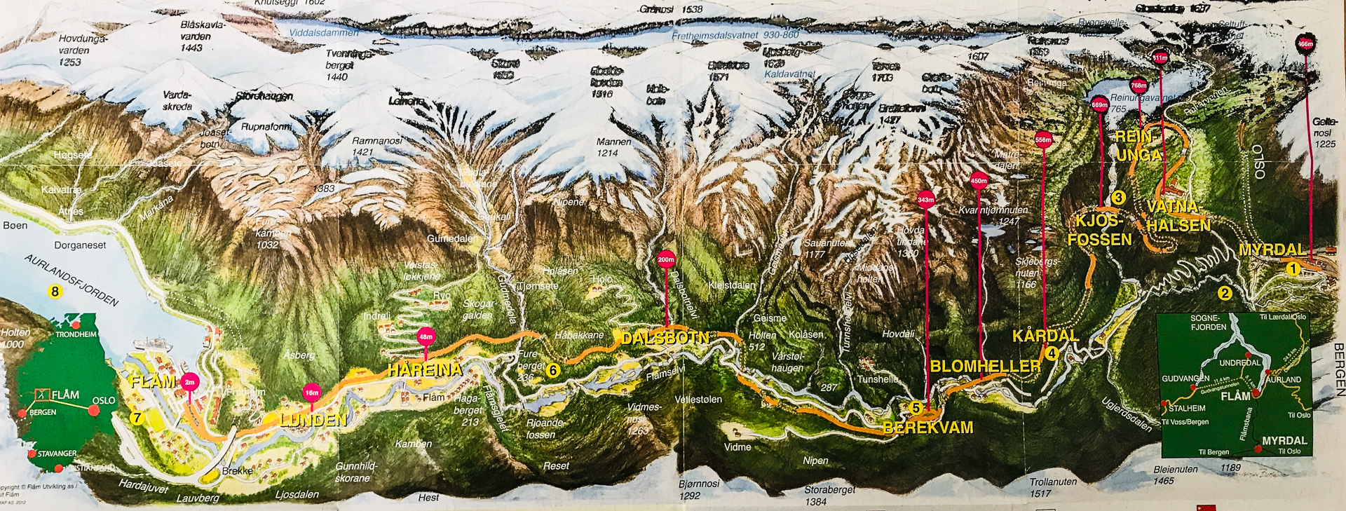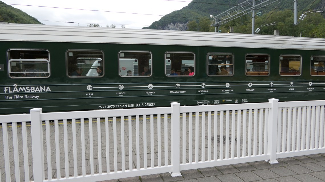 Flåm 은 Sognefjord의 지엽인 Aurlandsfjord가 끝나는 부분에 있는 작은 도시이다. 여기서 남쪽으로 약 12 mile (20 Km) 떨어져 있는 Myrdal로 가는 Flåm 철로는 세계에서 가장 아름다운 기차여행을 할 수 있는 곳이라고 알려져 있다. 이 철로는 1871년부터 계획하기 시작하여, 1924년에 착공하여, 2차세계대전 중 독일의 침략에도 불구하고 1940년에 준공되었다. 실제로 승객을 태우기 시작한 것은 1941년이었다. Flåm 철로는 총 20개의 터널이 있고 편도 50분 정도 걸린다. 중간에 9개의 정거장이 있는데 2곳(Kårdal, Dalsbotn)을 제외하고 승하강이 가능하다. 특히 Kjosfossen 정거장은 Flåm 철로의 하이라이트라 할 수 있는 Kjos(슈스) 폭포가 있는 곳이라 약 5분간 정차하느데 모두가 내려 사진을 찍느라 난리가 나는 곳이다. Flåm 역은 해발 6.5 ft (2 m), Myrdal 역은 해발 2,841 ft (866 m)에 위치해 있다. 이 두 도시를 연결하는 산길도 있어서 젊은이들은 자전거로 왕복하기도하고, Flåm에서 Myrdal까지 기차로 가서 자전거나 하이킹으로 내려오기도 한다. Flåm 철도에 관한 자세한 정보는 https://www.visitflam.com/ 에서 참조하기 바란다.