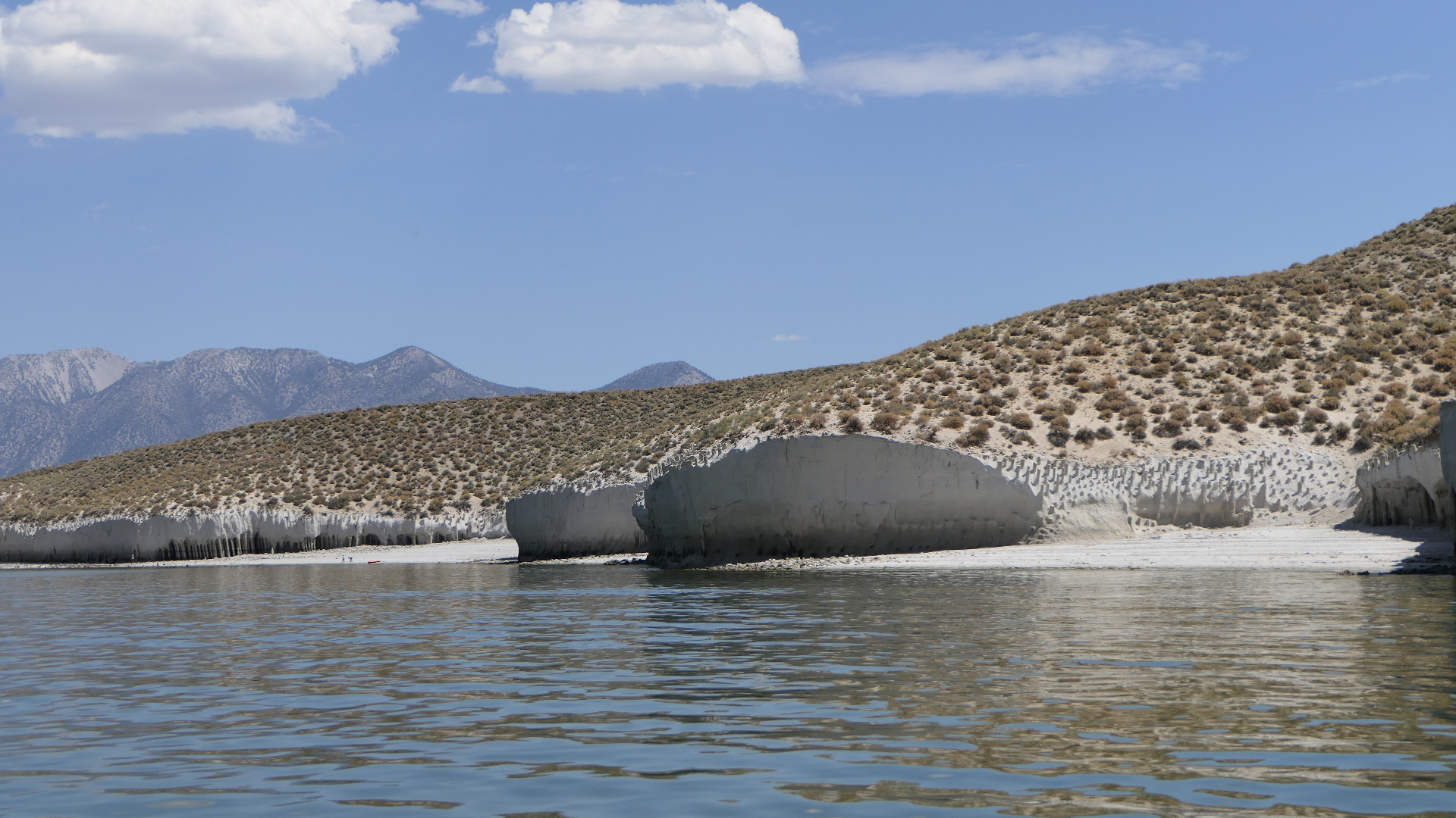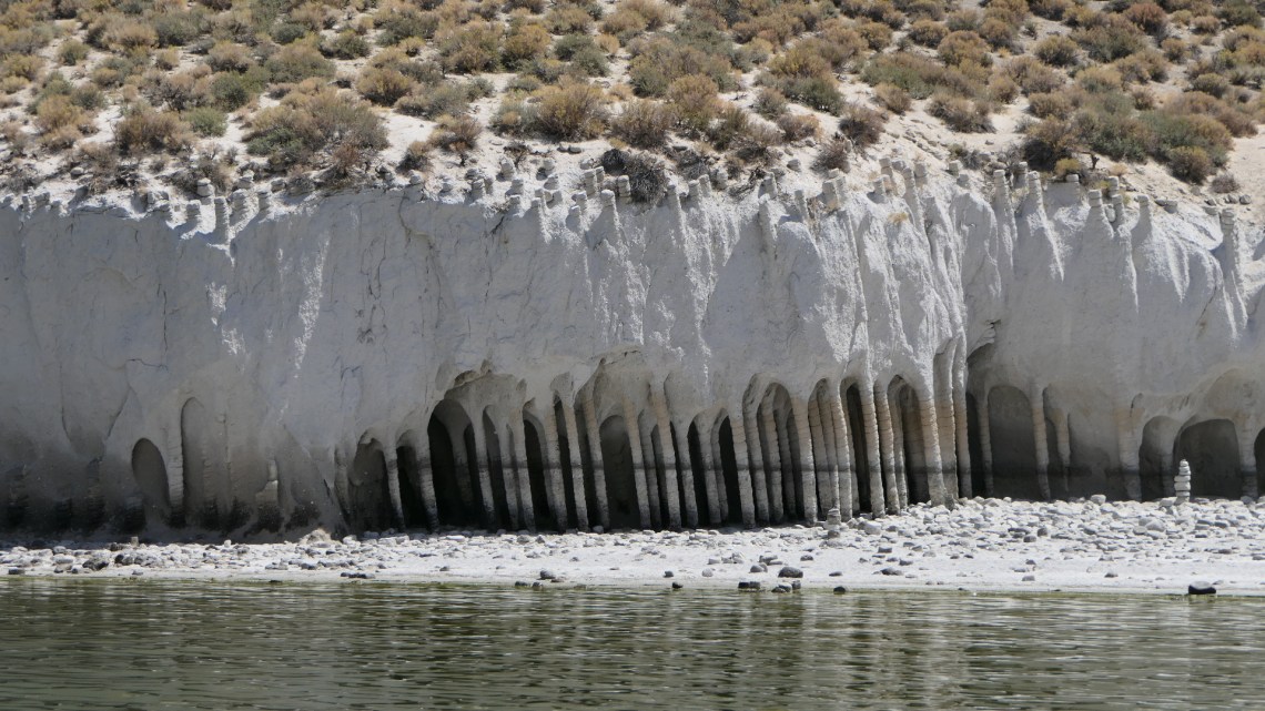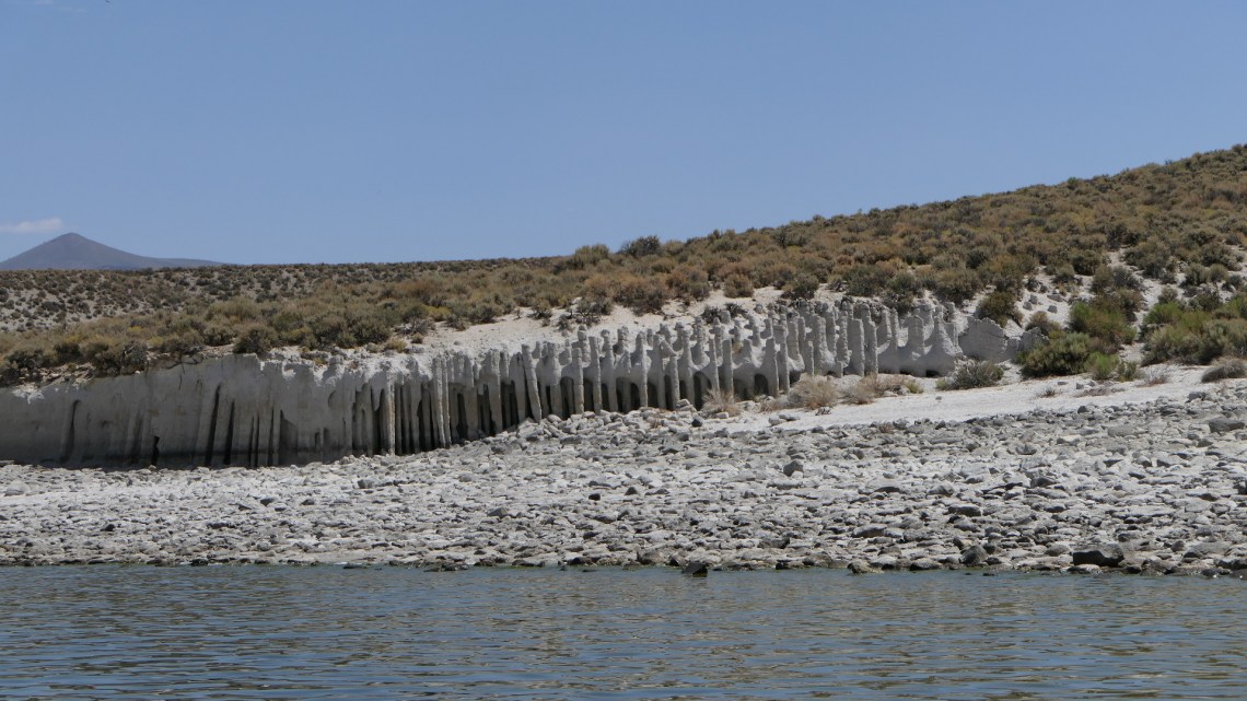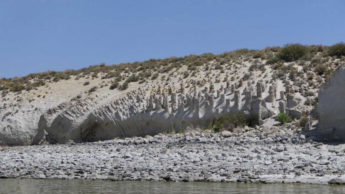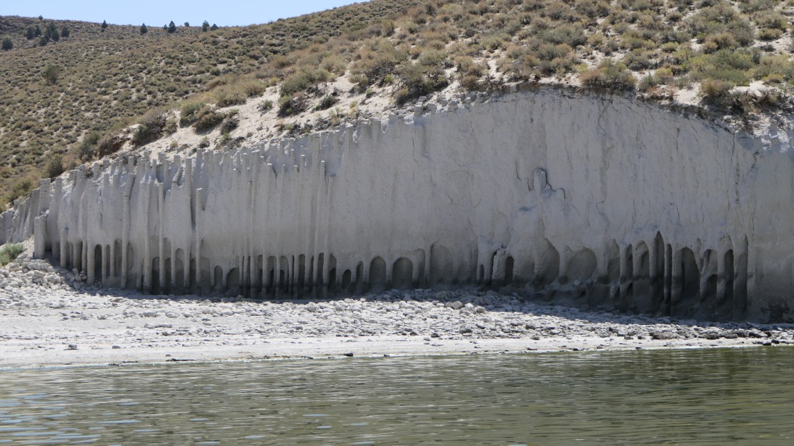 Crowley Lake이 생긴 후 호수의 동쪽에 있는 언덕에 진기한 돌기둥(Stone Column)들이 나타나기 시작했다. 지질학자들이 연구한 바에 의하면 이 지역에는 약 760,000년 전에 거대한 분화(噴火)가 있었다. 그때 분출된 화산재가 일대를 뒤덮었는데, 쌓여 있던 눈이 녹아 뜨거운 화산재 사이로 스며들며 급격히 수증기가 생성되었다. 수증기가 피어오르는 과정에 화산재 사이사이에 미세한 구멍들이 뚫리며 heat pipe와 같은 작용을 하였다. 그 열에 광물질들이 녹아서 수많은 구멍들을 채우고 쉽게 부식되지 않는 기둥들이 형성되었다. 저수지가 만들어진 후 호수의 물결이 풍화작용을 가속시켜 약한 부분들은 떨어져 나가며 지금의 기둥들이 나타난 것이다. 이 돌기둥들을 보려면 험한 비포장도로를 4WD로 가야하고 1 mile 정도 하이킹을 해야 하는데 손주들을 데리고 간 가족여행이라 배를 빌려 타고 쉽게 보기로 하였다. 그런데 landing이 허용되지 않고 해안선에서 거리유지 등 조건이 까다로워 멀찍이 배에서 보아야 했다.
