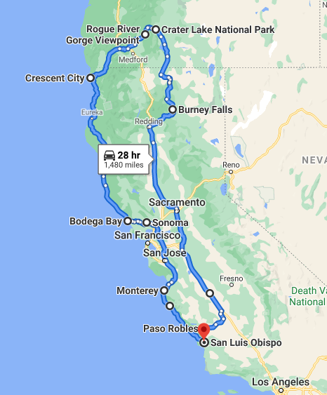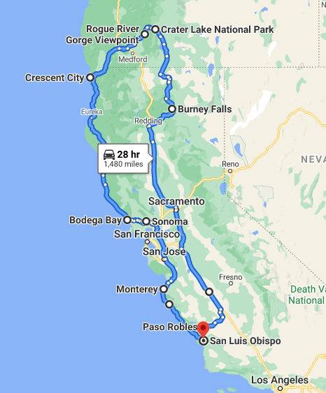 2020년에 예정되었던 Beach Boys 공연이 코로나로 인하여 한 해가 연기되었다. 우리는 LA지역에서 약 200 mile (330 Km) 북서쪽에 위치한 작은 도시 Paso Robles 공연의 표를 샀었는데, 2021년 9월 18일에 그 곳에서 공연이 열리게 되었다. 미리 샀던 표를 다시 쓸 수 있게 된 것이다. 코로나로 인하여 여행도 못하고 집에만 있었던 차에 집에서 200여 mile이나 올라간 김에 모처럼 road trip을 계획하였다. 원래는 Redwood National Park에 초점을 두려고 하였는데 산불로 인하여 도로사정이 좋지 않아 조금씩 올라가다 아예 Crater Lake National Park까지 올라가게 되었다. 5박6일 정도로 시작한 것이 8박9일에 약 2,200 mile (약 3,540 Km))의 대장정이 되어버린 것이다. 서울 부산의 거리를 찾아보니 456 Km로 나와있다. 서울과 부산을 약 4번 왕복하는 거리이니 오랜만에 나서는 길 치고는 야심적이라는 생각도 들었다.