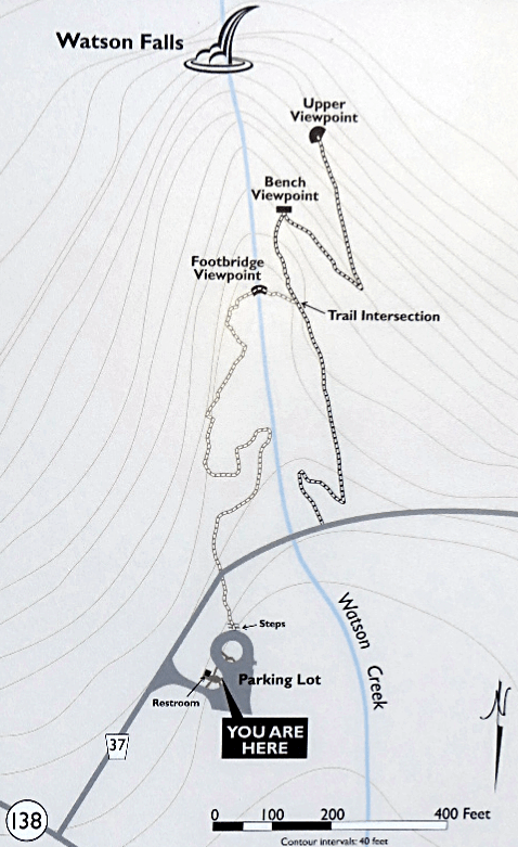 Watson Falls trailhead 주차장은 Tokette Falls로 가는 NF-34에서 OR-138로 동쪽 약 2 mile 떨어져 있는 NF-37로 들어서자 바로 오른쪽에 있다. 편도 0.4 mile(644 m)인 등산로는 NF-37번을 건너서 시작된다. Watson Falls 등산로는 중간급으로 분류되어 있는데 짧은 거리에 비해 524 ft(160 m)의 고도상승으로 25%라는 높은 고도상승율(elevation gain ratio)을 갖고 있기 때문이다.