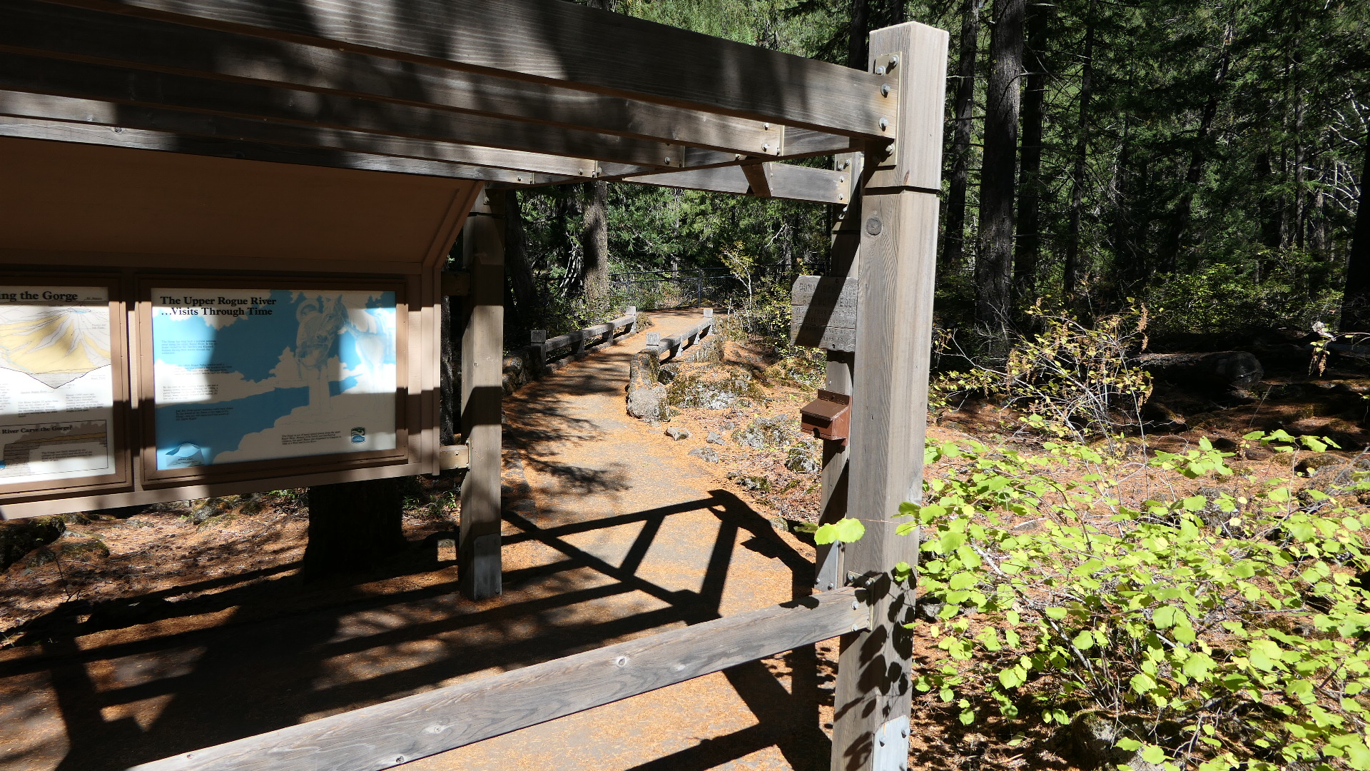 Rogue River Gorge Viewpoint는 OR-62와 OR-230이 만나는 지점에서 약 1 mile 남쪽에 있다. OR-62 상에 있는 안내판을 보고 들어가면 큰 주차장이 나온다. 주차장에서 바로 trailhead으로 연결이 되며 0.3 mile의 아주 쉬운 loop trail이다. 주(註): Trail을 영한사전으로 찾아보니 등산로 또는 둘레길로 되어 있어 등산로로 이전 글에서 썼었는데 사실 둘 다 trail의 뜻과 다르기에 다시 trail로 쓰기로 하였다. Trail은 대부분 포장이 되어 있어 wheelchair accessible로 분류되어 있다. Rogue River Gorge와 Rogue River Natural Bridge를 연결하는 약 3.5 mile의 trail은 Upper Rogue River Trail #1034의 일부이다 – 강 서쪽은 #1034, 강 동쪽은 #1034A.