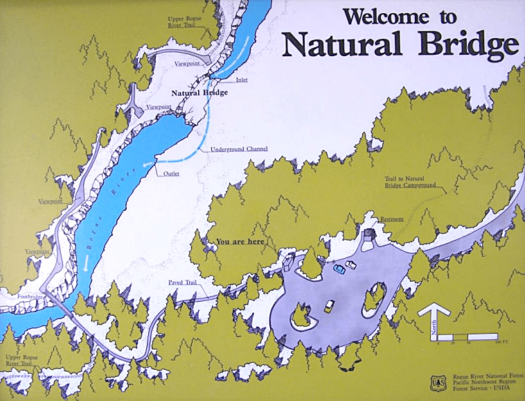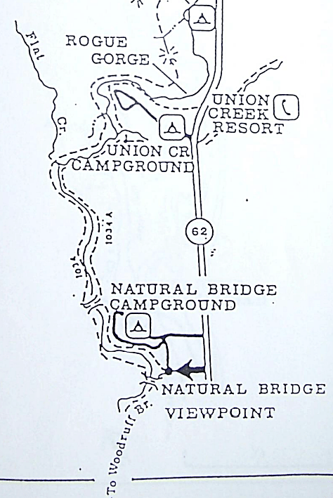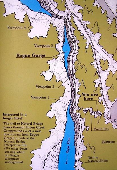 Rogue River Natural Bridge는 Rogue River Gorge에서OR-62로 약 1.5 mile 남쪽에 위치해 있다. Trail은 주차장에 난 길을 따라가다 다리를 건너 강 서쪽에서 시작하여 북쪽에서 다시 다리를 건너 강 반대편으로 돌아오는 약 2 mile loop trail로 대부분 포장되어 있다. 물론 반대로 돌 수도 있고 한 쪽에서 왕복할 수도 있다. 이 Natural Bridge는, Utah주에 있는 같은 이름의 지형유적과 같이 다리의 모습으로 땅 위로 솟은 것이 아니고, 그냥 바위로 덥힌 땅이다. 그런데 사실은 강이 이 부분에서 용암으로 이루어진 지하 동굴을 통하여 흐르며 형성된 지형이다.
