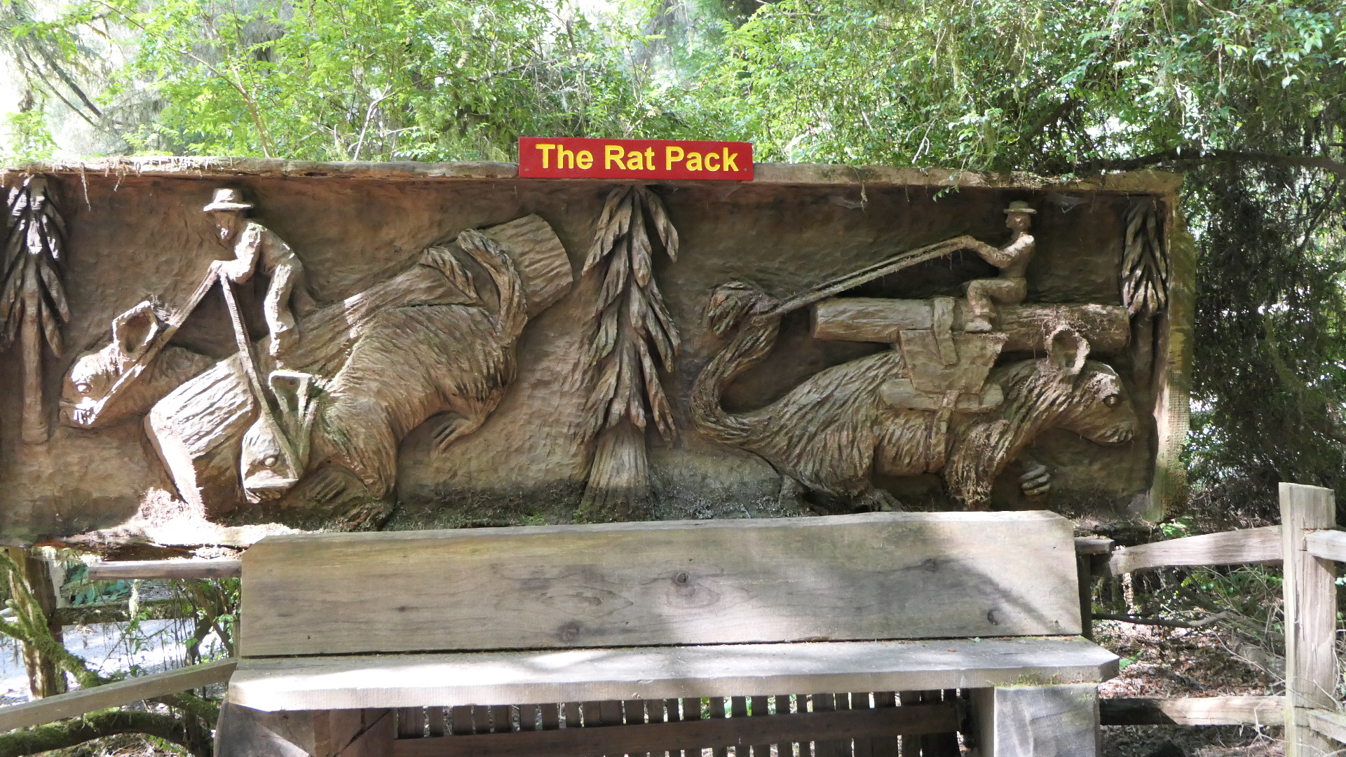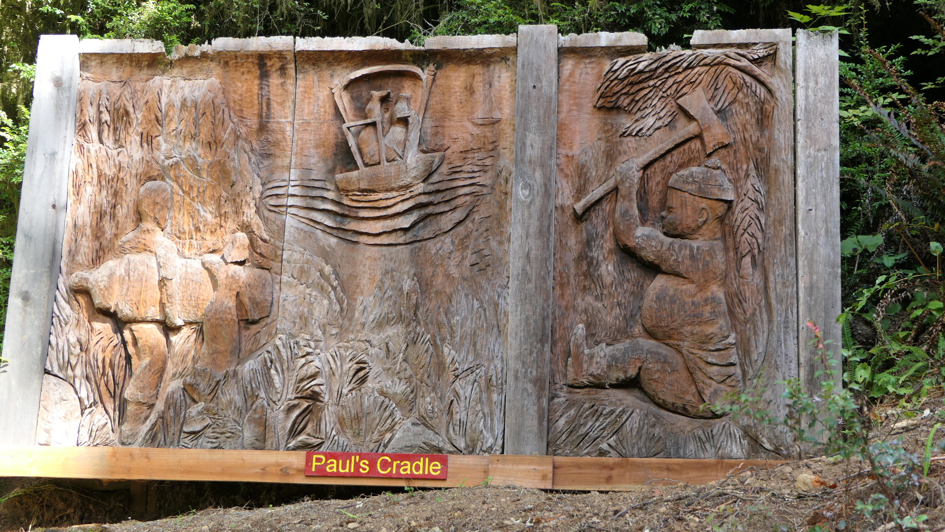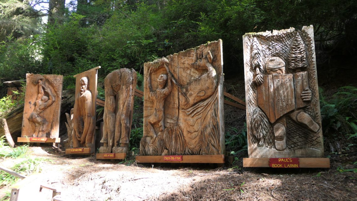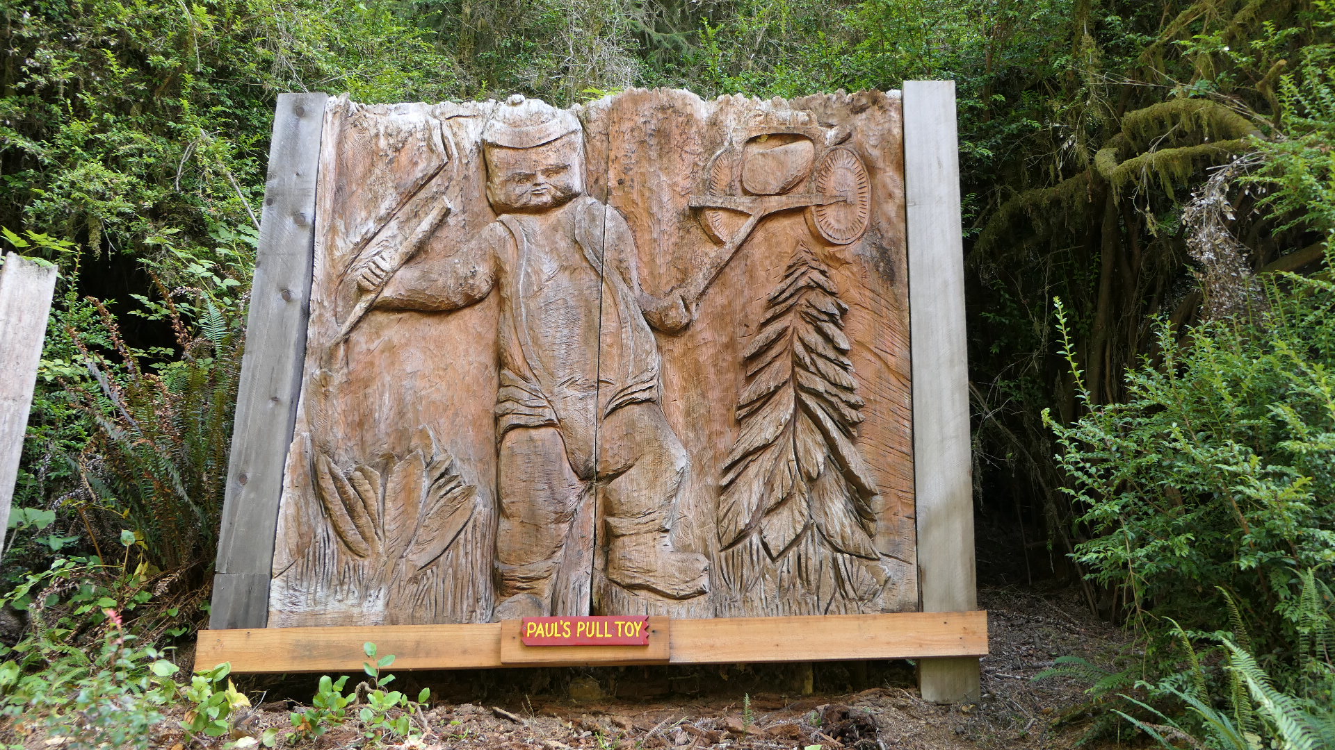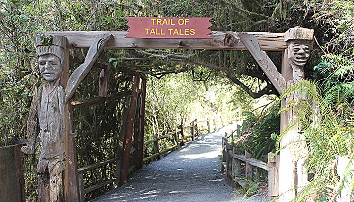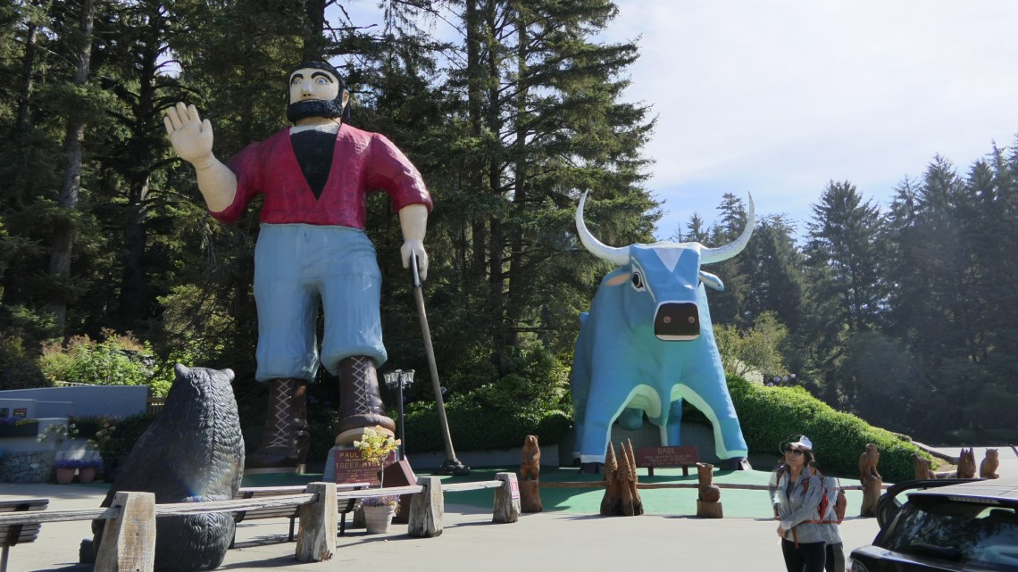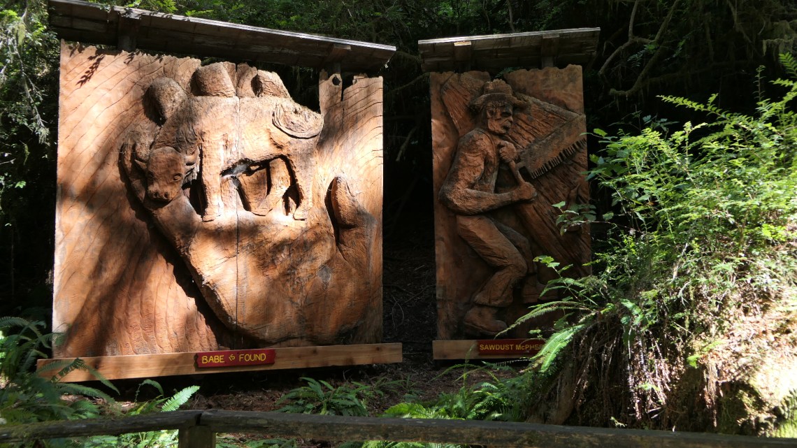 입구에 있는 대형 Paul Bunyan과 Babe the Blue Ox 입상(立像)의 주인공들에 대해서 간단히 알아본다. Paul Bunyan은 미국 전래 동화에 나오는 거인 나무꾼이며 Babe the Blue Ox는 그의 단짝인 송아지의 별명이다. 여러가지 version이 있는데 이야기의 골자는 Paul이 보통 아이들보다 10배정도 크게 태어났고 빠르게 자라 엄청 힘이 센 거인이 되었다. Paul은 푸른 눈이 오는 날 송아지 한 마리를 발견하고 이름을 Babe라 지었다. 눈이 녹고 말랐는데도 Babe의 색은 푸른 빛이었다. 그래서 별명 Blue Ox가 추가되었다. Paul은 이 송아지에게 그의 일을 돕도록 훈련시켰고 Babe는 그의 가장 소중한 친구이자 조력자가 되었다. 동화 내내 과장된 이야기가 많이 있는데 Trail of Tall Tales는 그런 내용들을 바탕으로 조성된 곳이며 Redwood를 톱으로 깎아 만든 목상들이 곳곳에 있다.