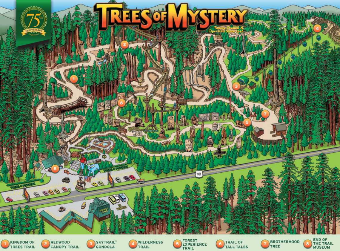 Redwood National and State Parks는 방대하게 크고 볼거리들이 흩어져 있어서 제대로 보려면 최소 3일은 잡아야 하겠지만 우리는 하루를 잡았다. 우선 들른 곳은 Trees of Mystery였다. Crescent City에서 남쪽 약 18 mile(29 Km) 지점에 있는 유료공원이다 – 성인 $20, 60세 이상 $16. 이곳을 들를까 말까 잠시 고민했지만 유명한 나무들이 많이 있고, 큰 나무들을 밑에서가 아니고 위에서 볼 수 있는, Canopy Trail과 Sky Trail이 우리의 관심을 끌었다.