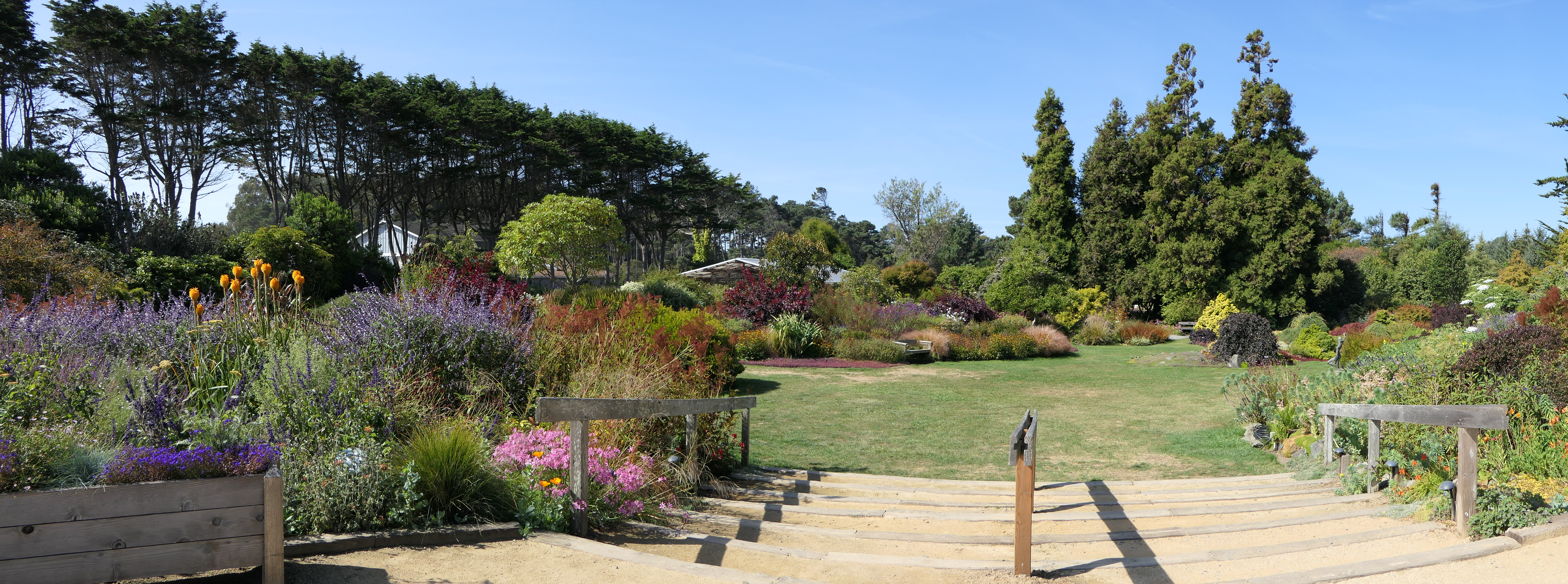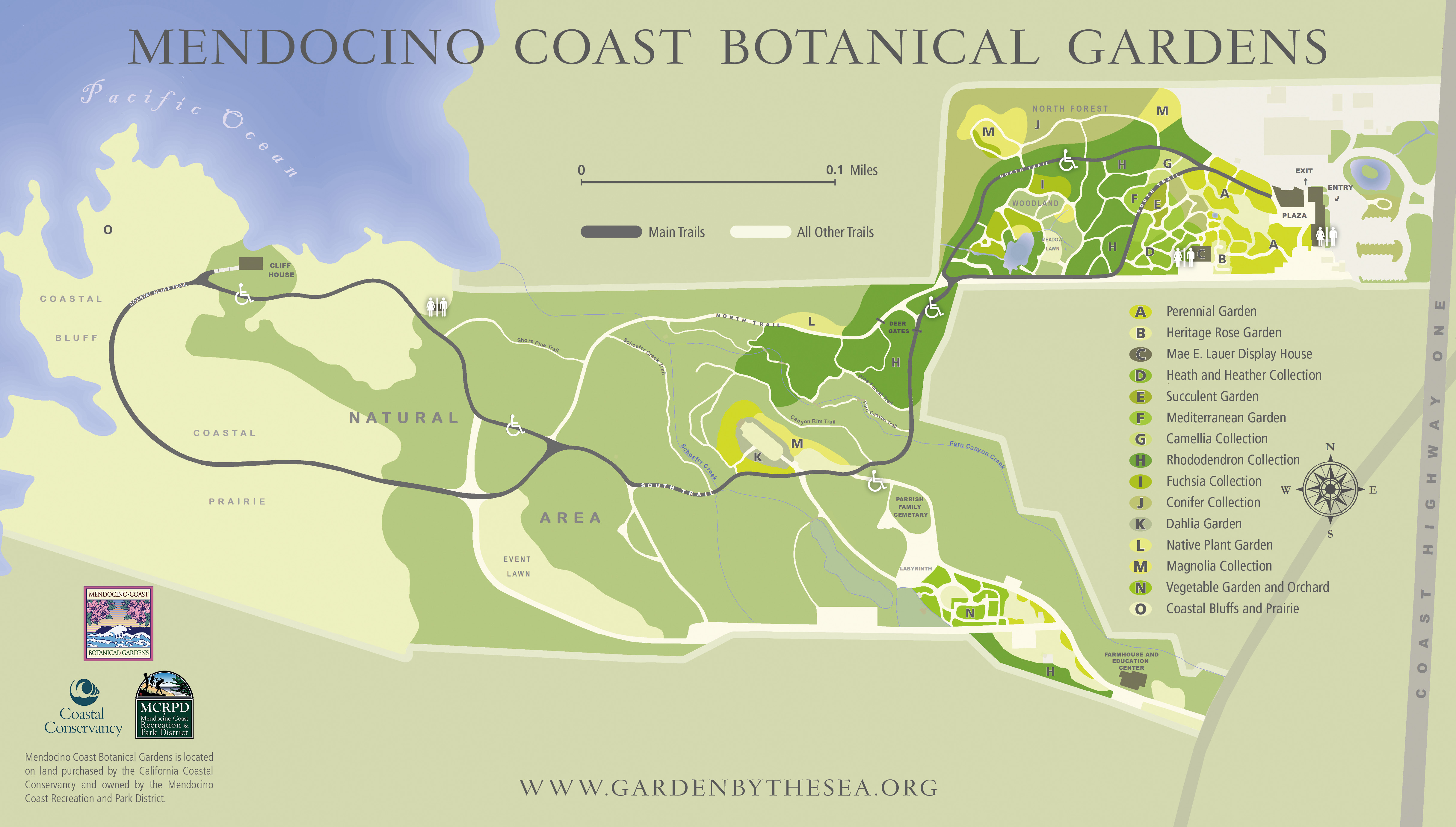 1961년에 정원사(庭園師) 부부에 의해 시작된 Mendocino Coast Botanical Garden은 1966년에 일반에 공개되기 시작하였다. 1992년에 자연환경보호단체가 매입하여 지역 공원에 편입시켜 비영리 단체에서 운영하며 오늘에 이르렀다. 처음에는 이 지역의 산성 토질에 적합한 진달래과 식물에 집중하였지만 이제는 여러 종류의 다년생 식물 특히 장미, 동백, 목련, 달리아 등등이 일년 내내 돌아가며 꽃을 피우는 아름다운 정원이 되었다. 온실, 채소밭, 또한 갖가지 화분 및 모종을 살수 있는 묘목장 등이 있어 인근 주민들은 자주 들르는 곳이라 한다. 꽃 이름을 일일이 다 알지 못하지만 사진 중 일부를 올린다.